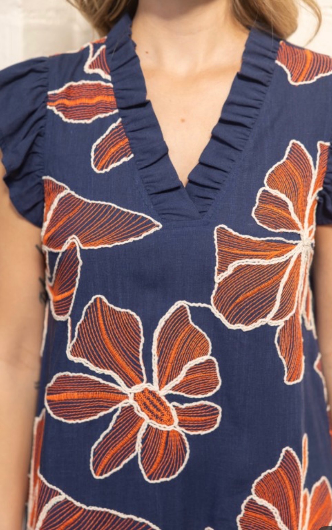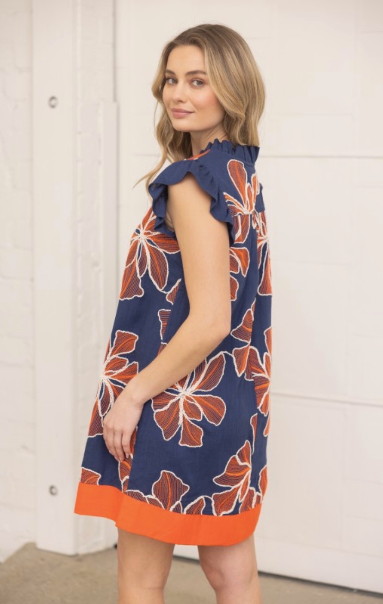 Navy shift dress with bold rust floral print, featuring a ruffled V-neckline, flutter sleeves, and a contrasting orange hem for a fresh, statement look. Available in small, medium, and large.