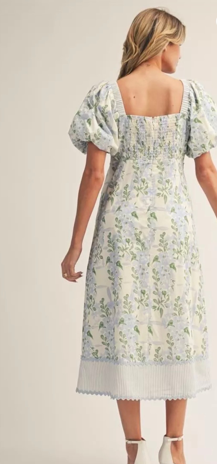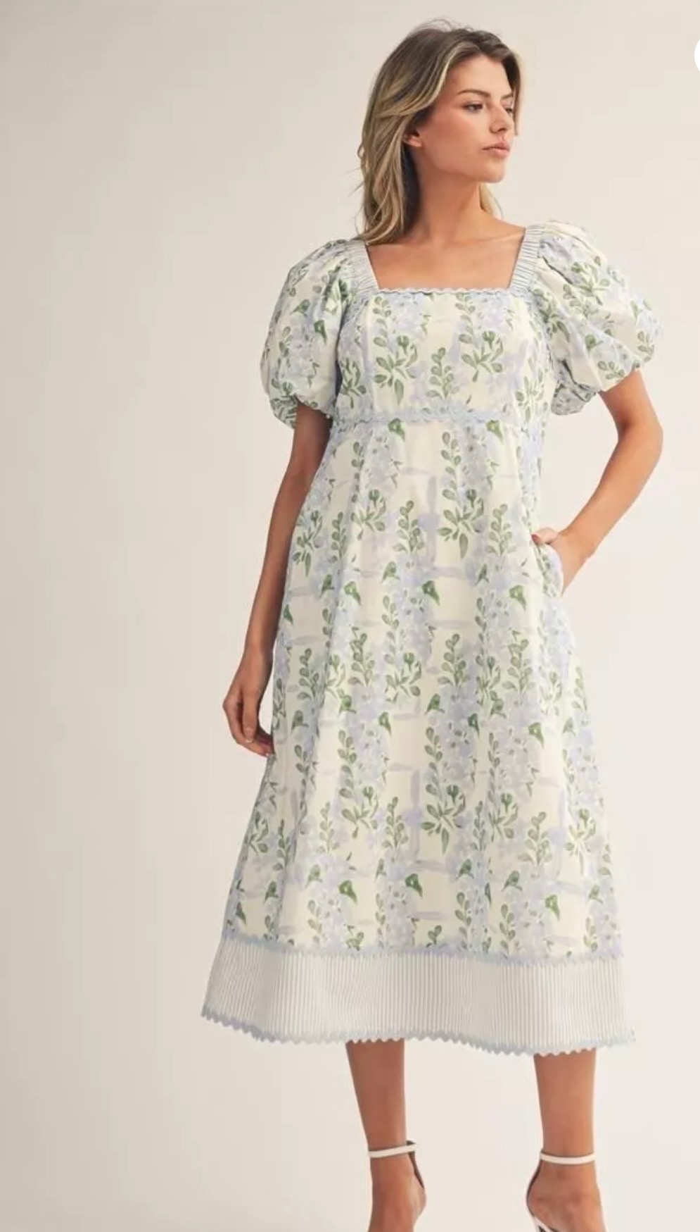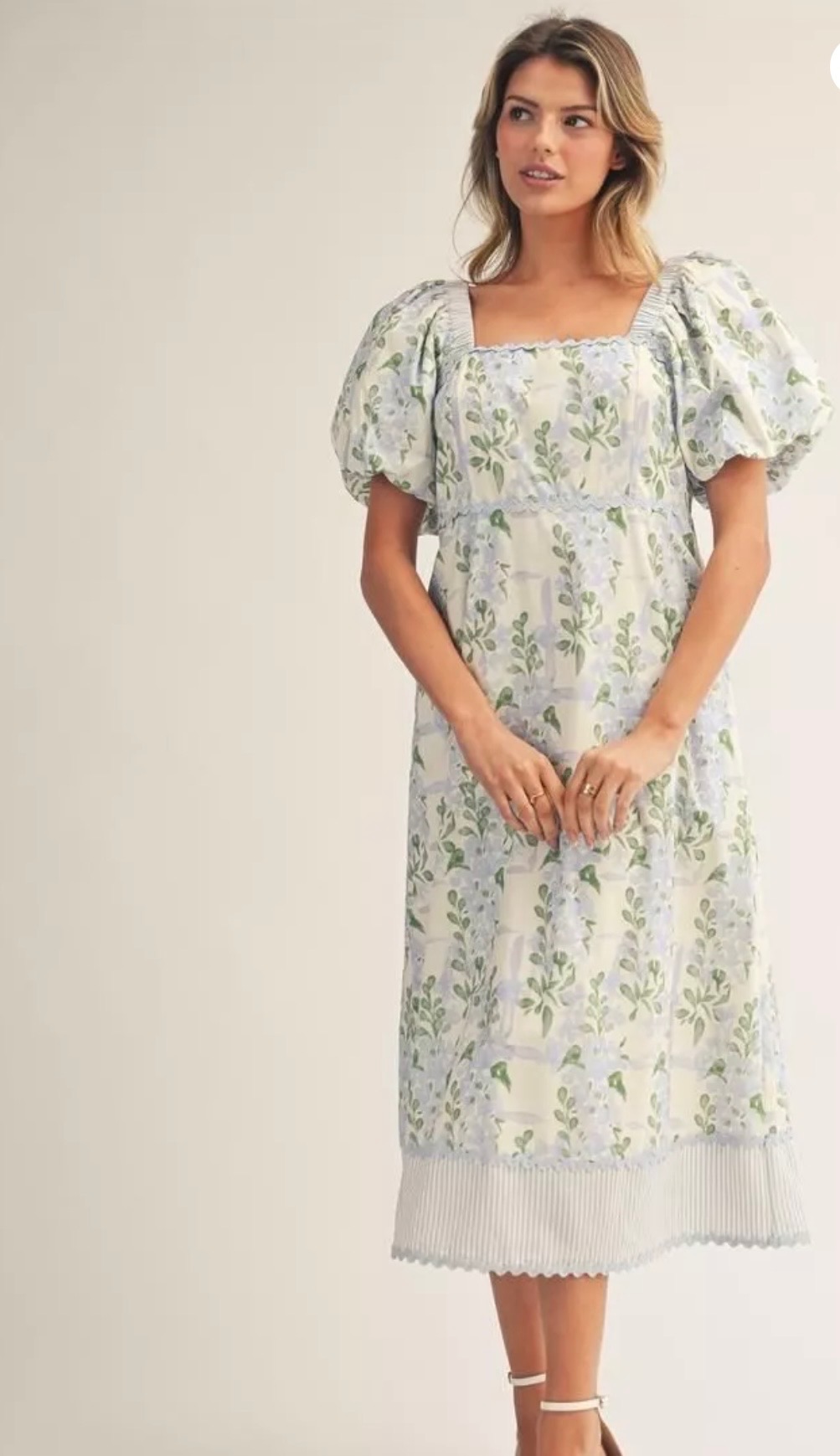 Light airy midi dress with a square neckline, puff sleeves, and an empire waist, featuring a delicate pastel floral print and a subtle pleated hem for a romantic, feminine look. Available in small, medium, and large.