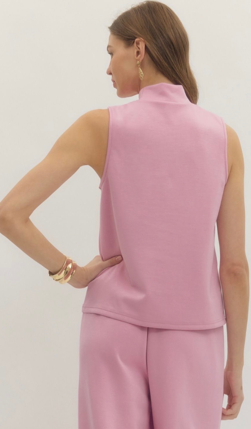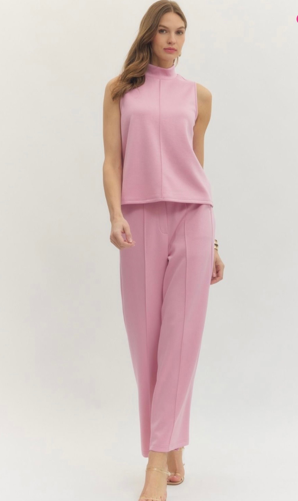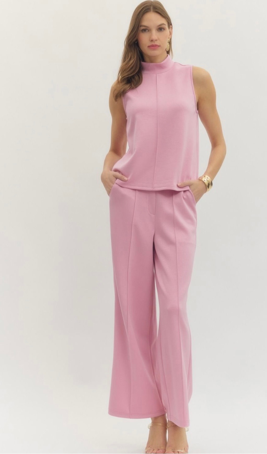 Chic blush pink two-piece set featuring a sleeveless mock-neck top and flowy wide leg pants, offering a polished yet effortless look. Available in small, medium, and large.