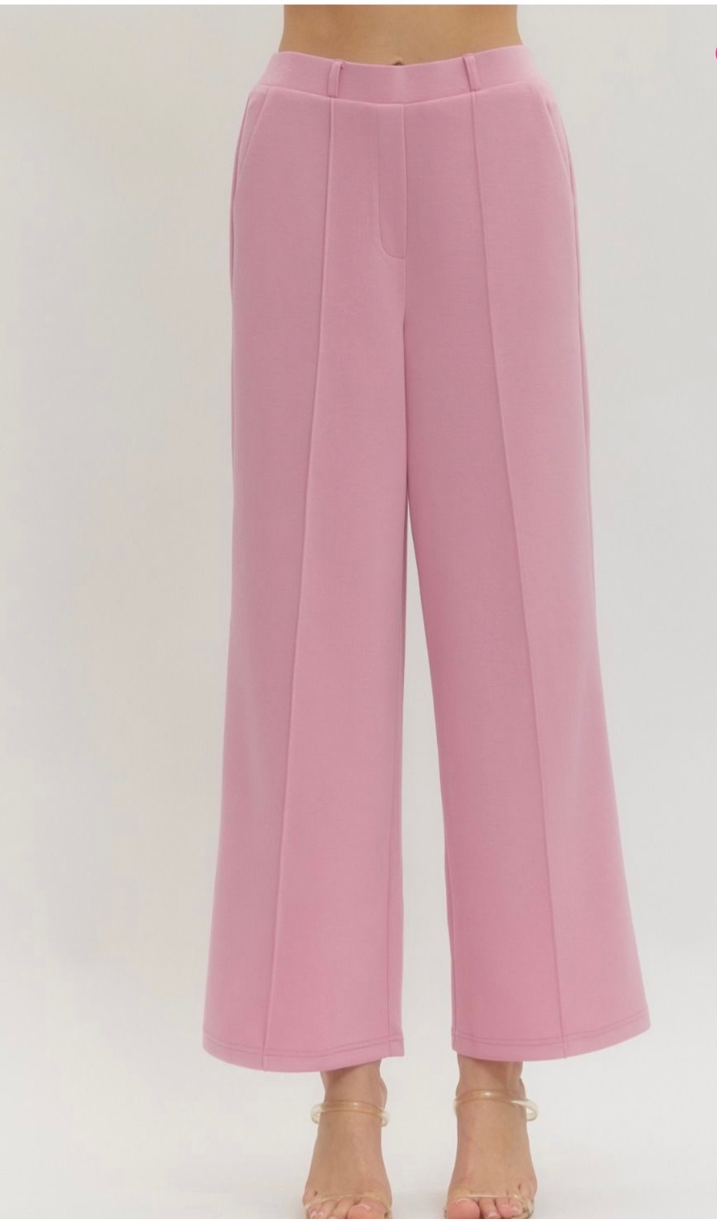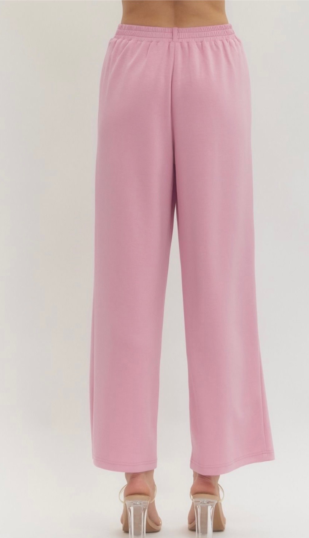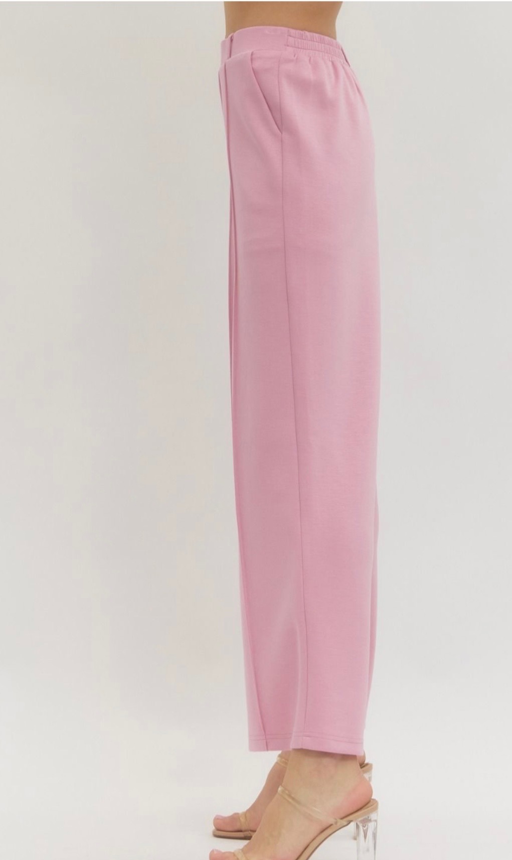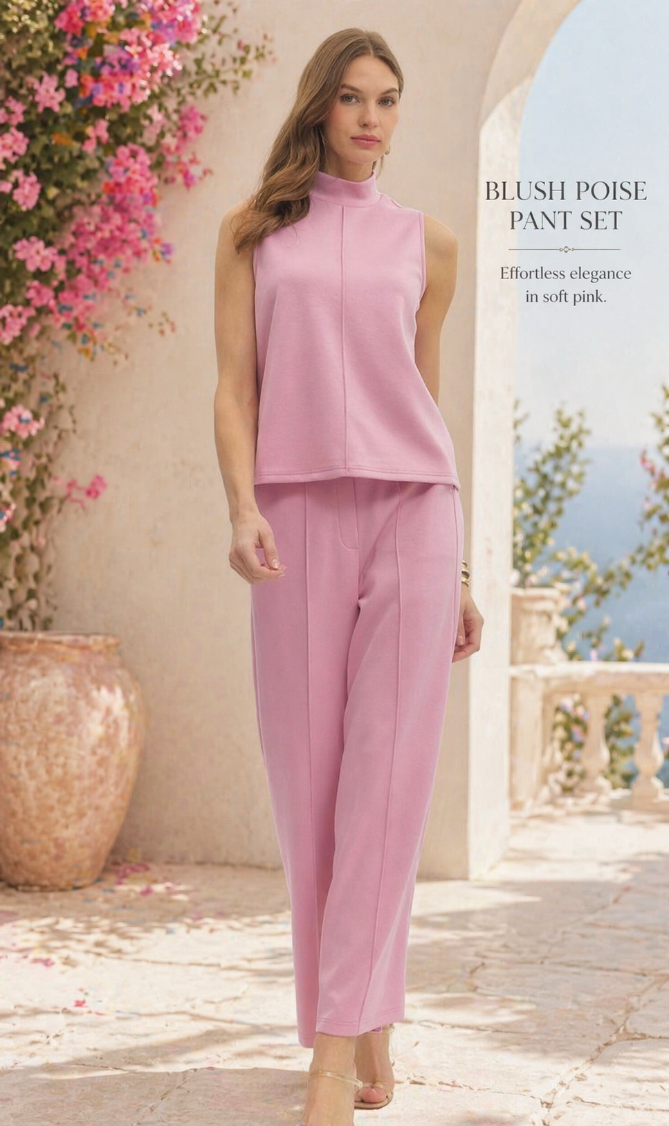 Chic blush pink two-piece set featuring a sleeveless mock-neck top and flowy wide leg pants, offering a polished yet effortless look. Available in small, medium, and large.