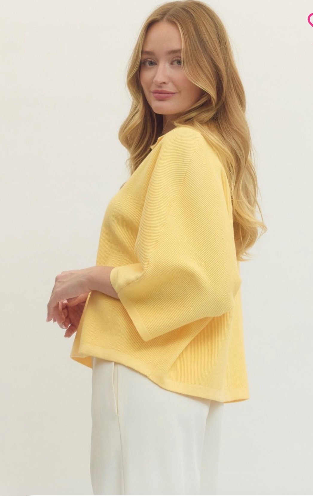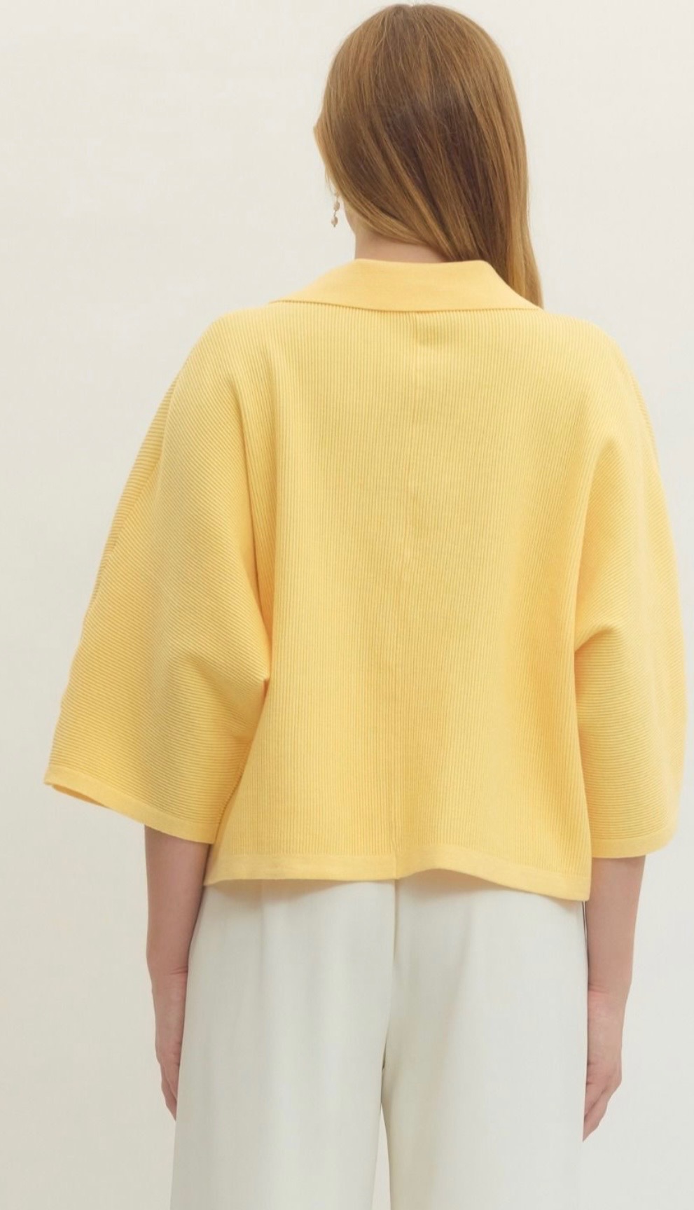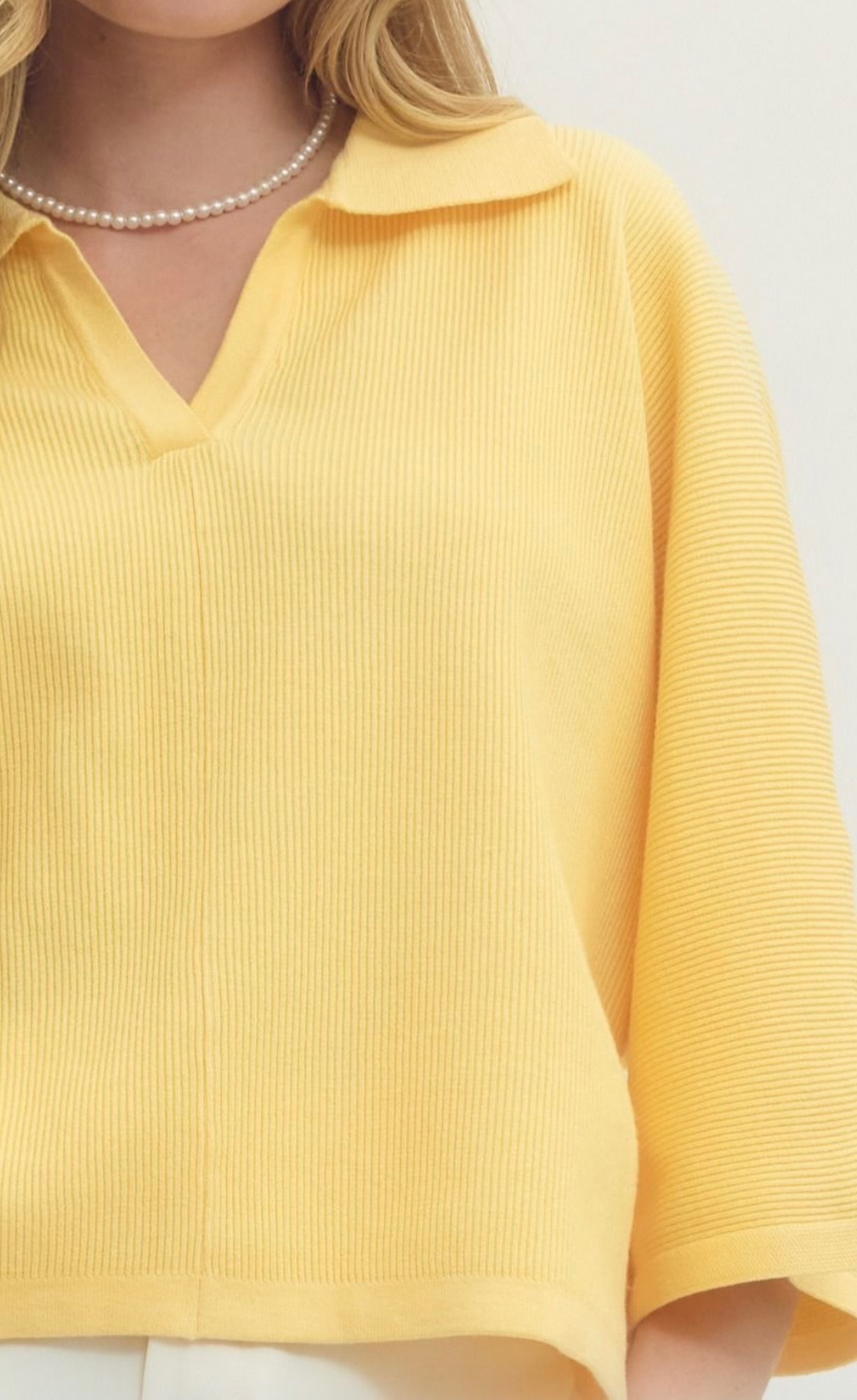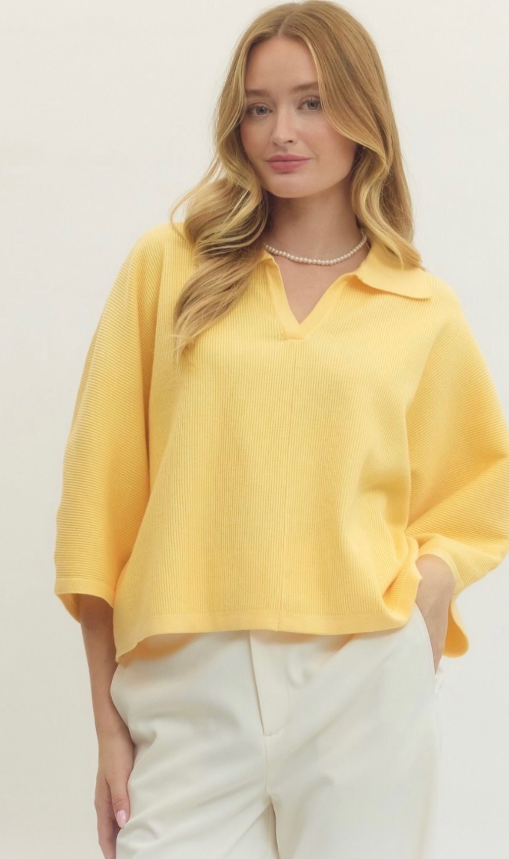 Soft yellow knit top with a relaxed fit, featuring a subtle ribbed texture, three-quarter sleeves, and a chic split collar neckline for an easy, polished look. Available in small, medium, and large.