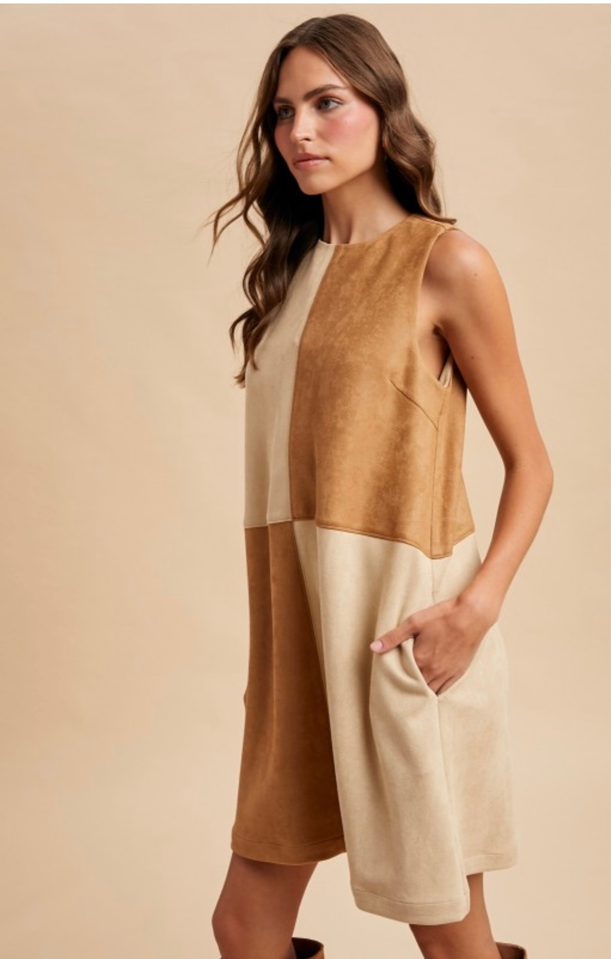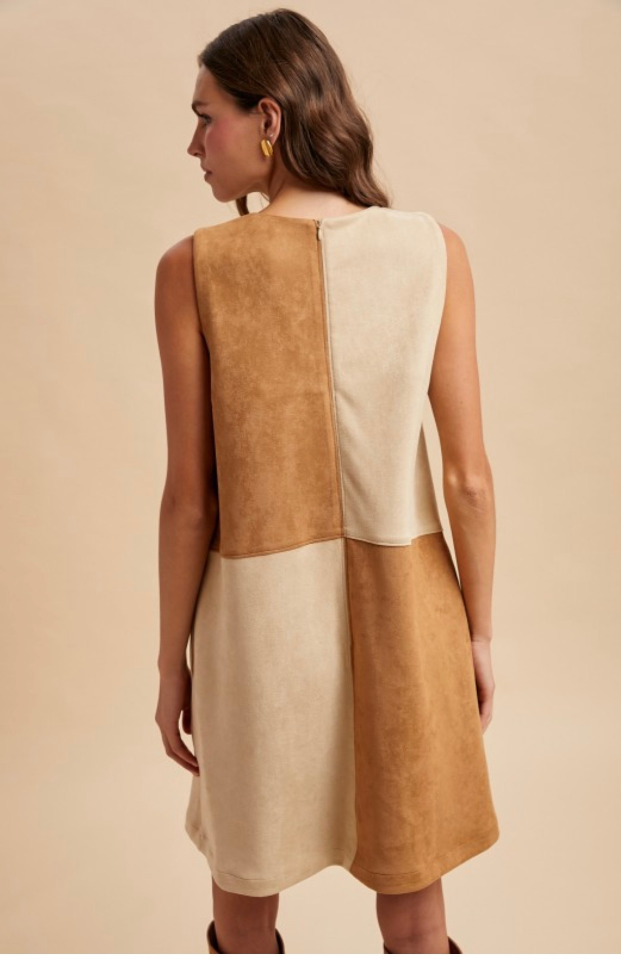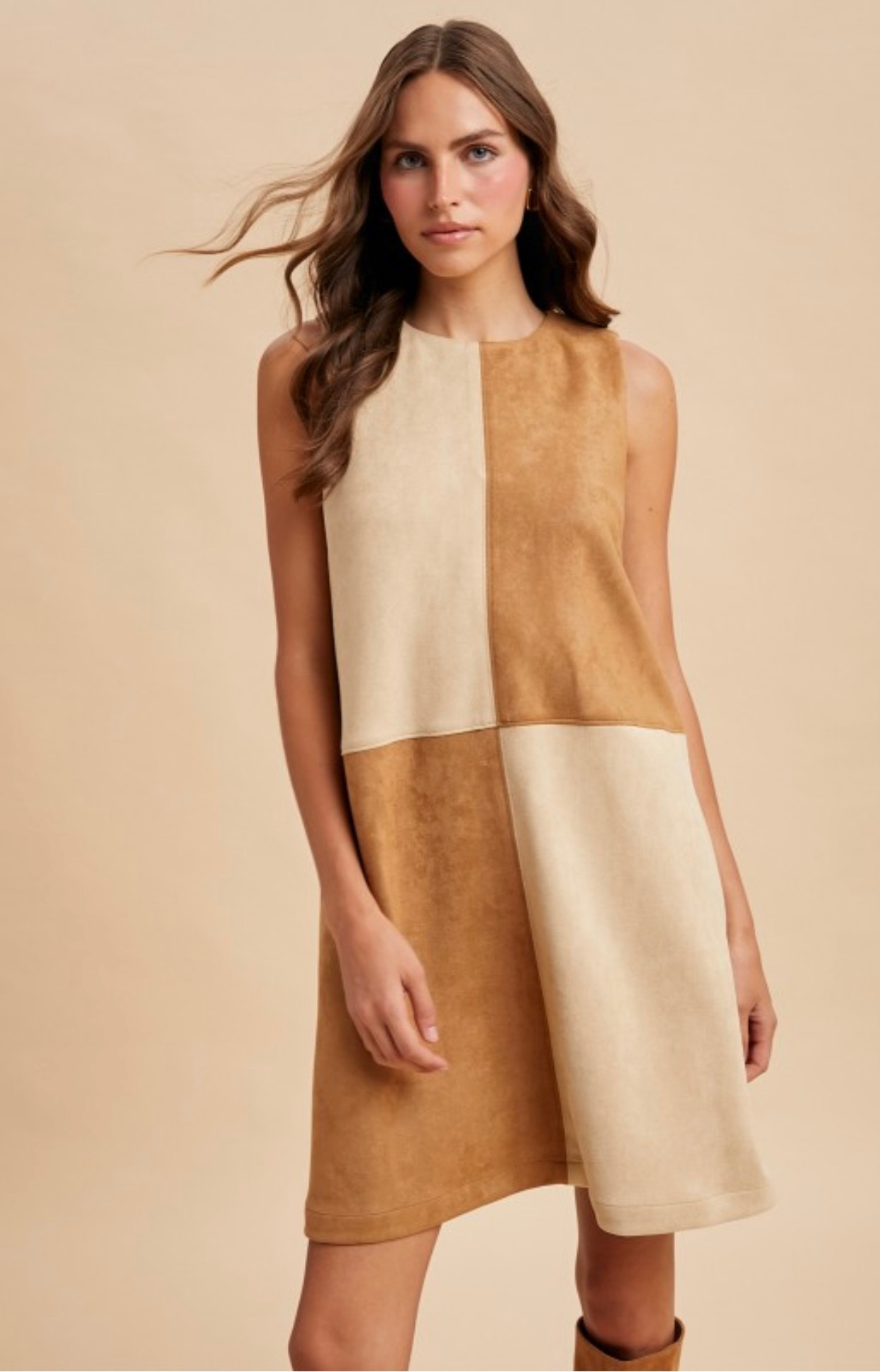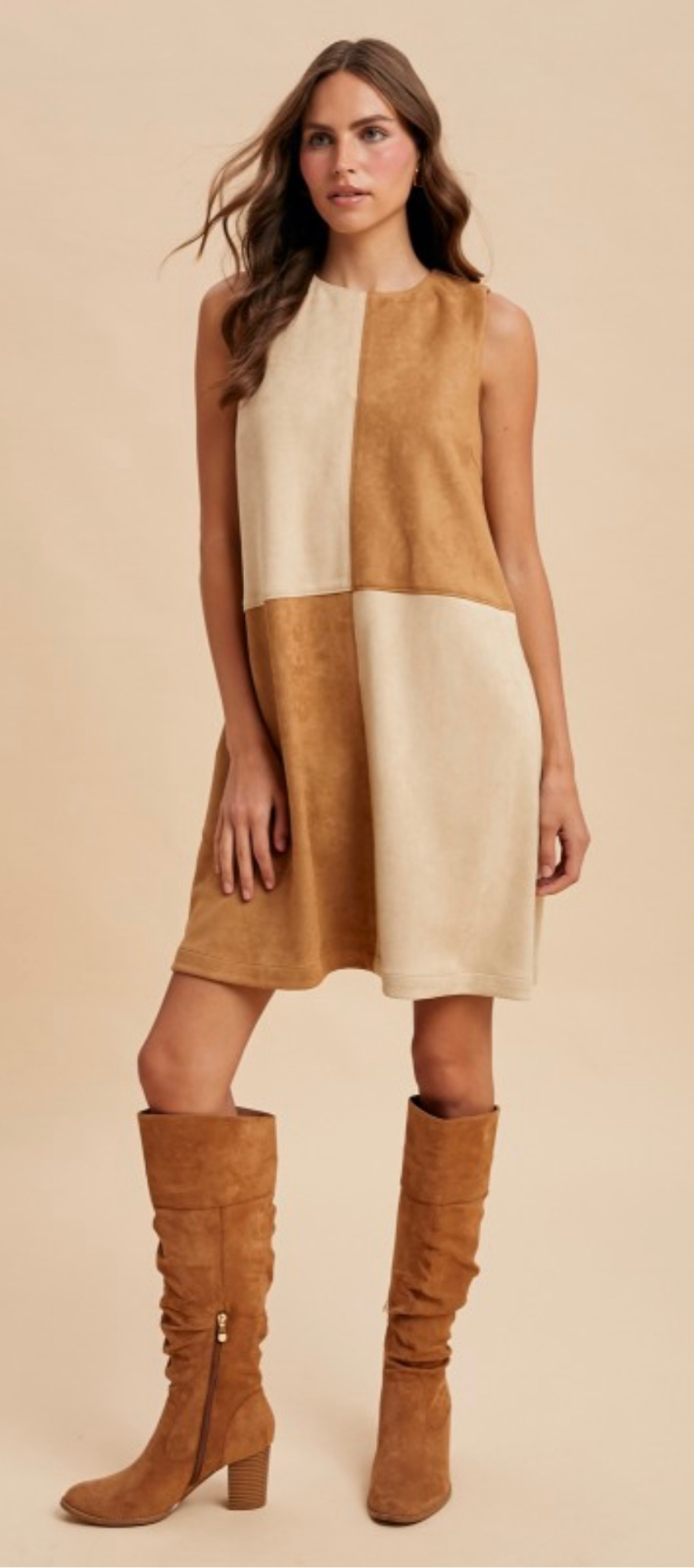 A chic mix of warm caramel and cream tones gives this sleeveless shift dress a modern edge. Designed in soft faux suede with a flattering straight silhouette, it’s the perfect blend of retro charm and contemporary style. Comes in small, medium, large and xlarge.