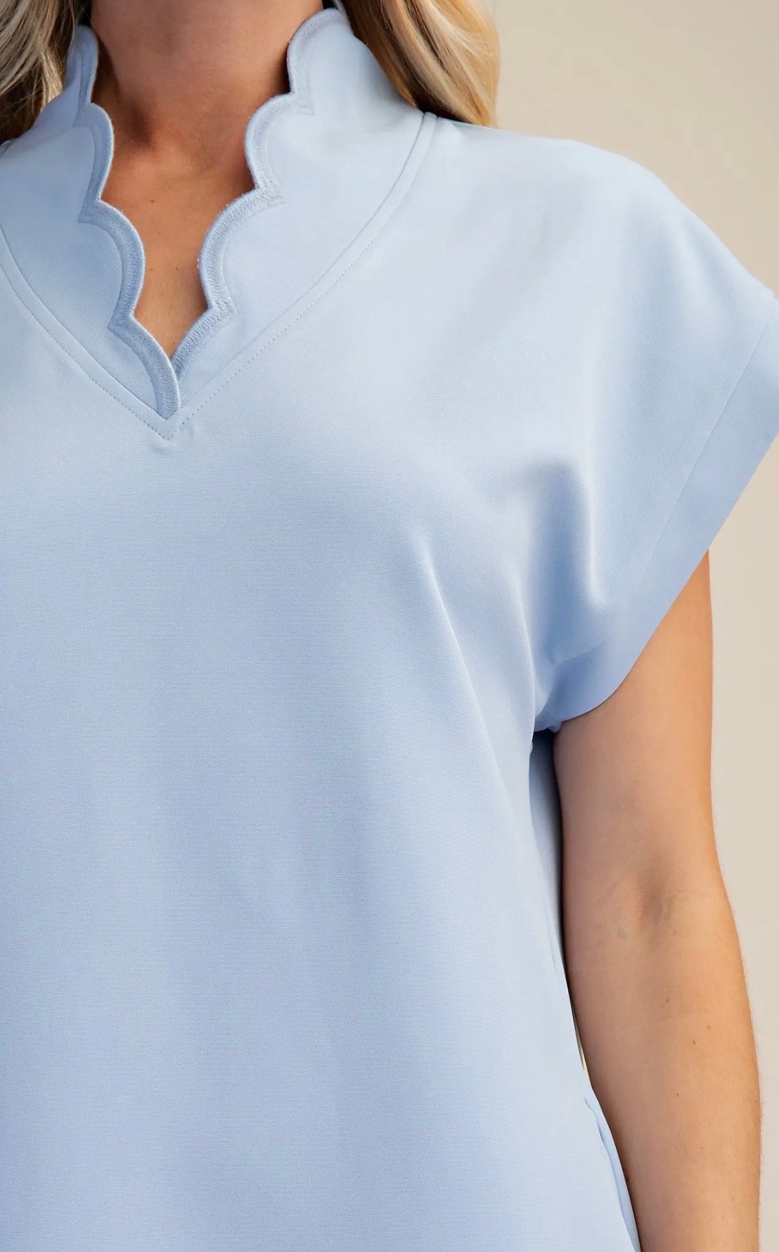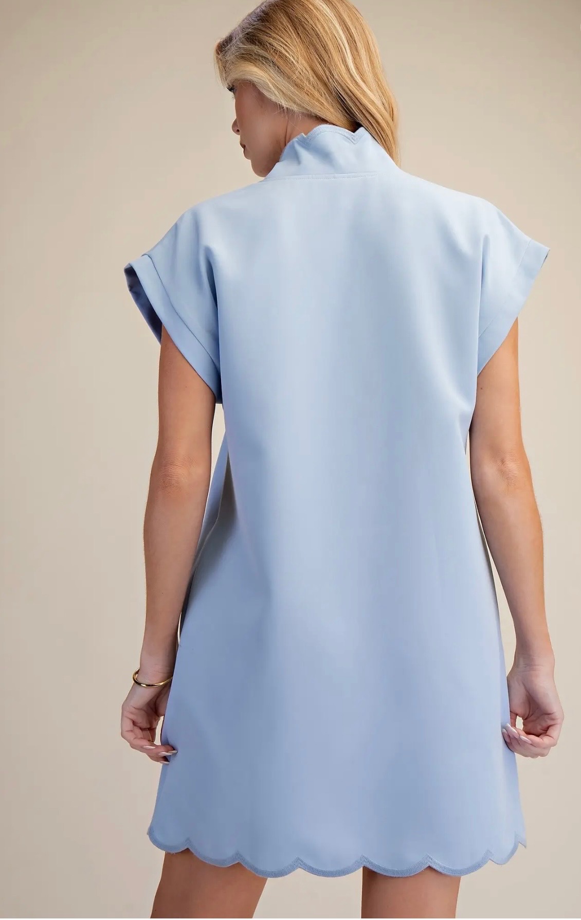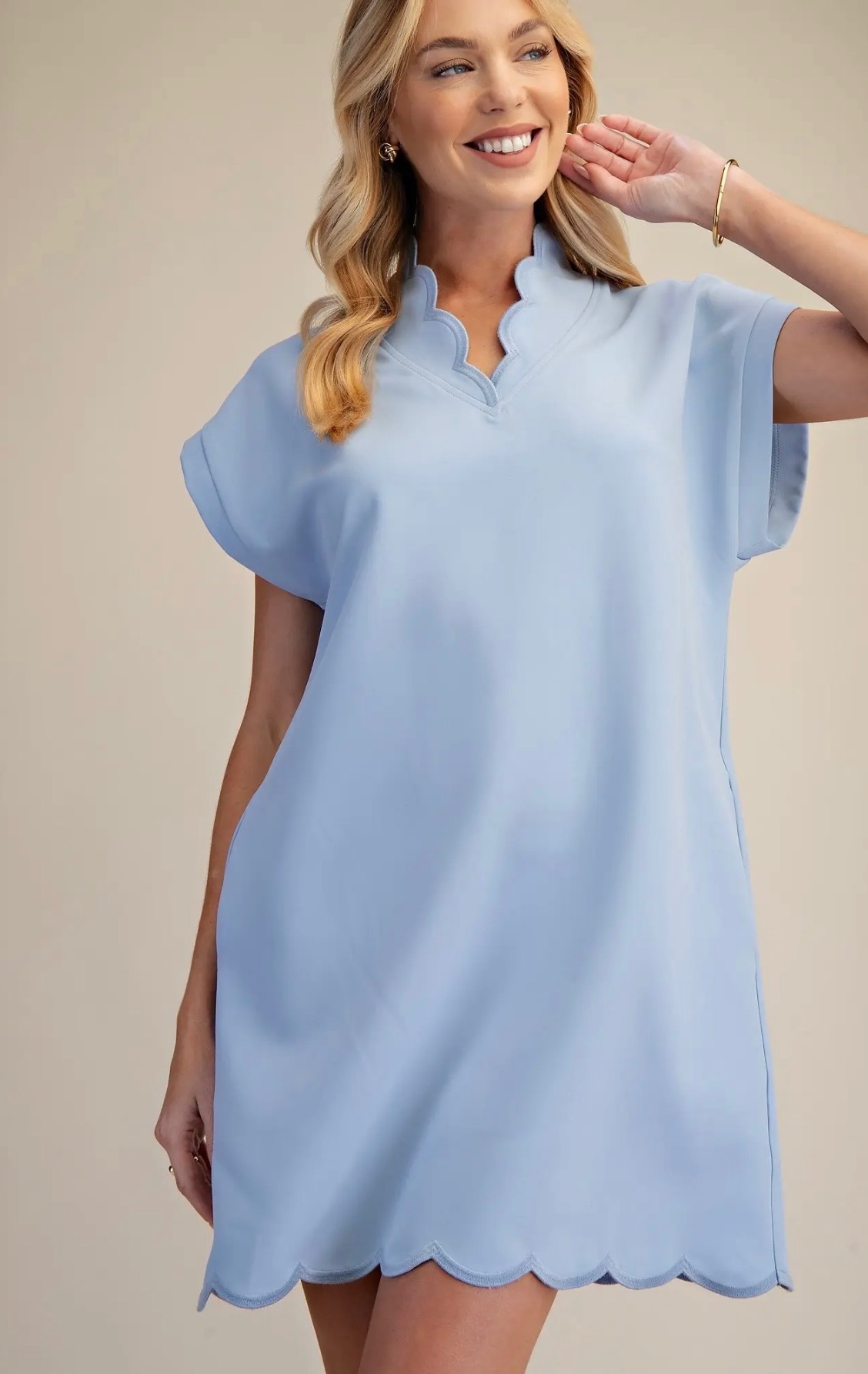 Easy shift dress in a soft pastel blue, featuring a relaxed silhouette with short sleeves, a scalloped V-neckline, and a matching scalloped hem for a feminine, polished finish. Available in small, medium, and large.