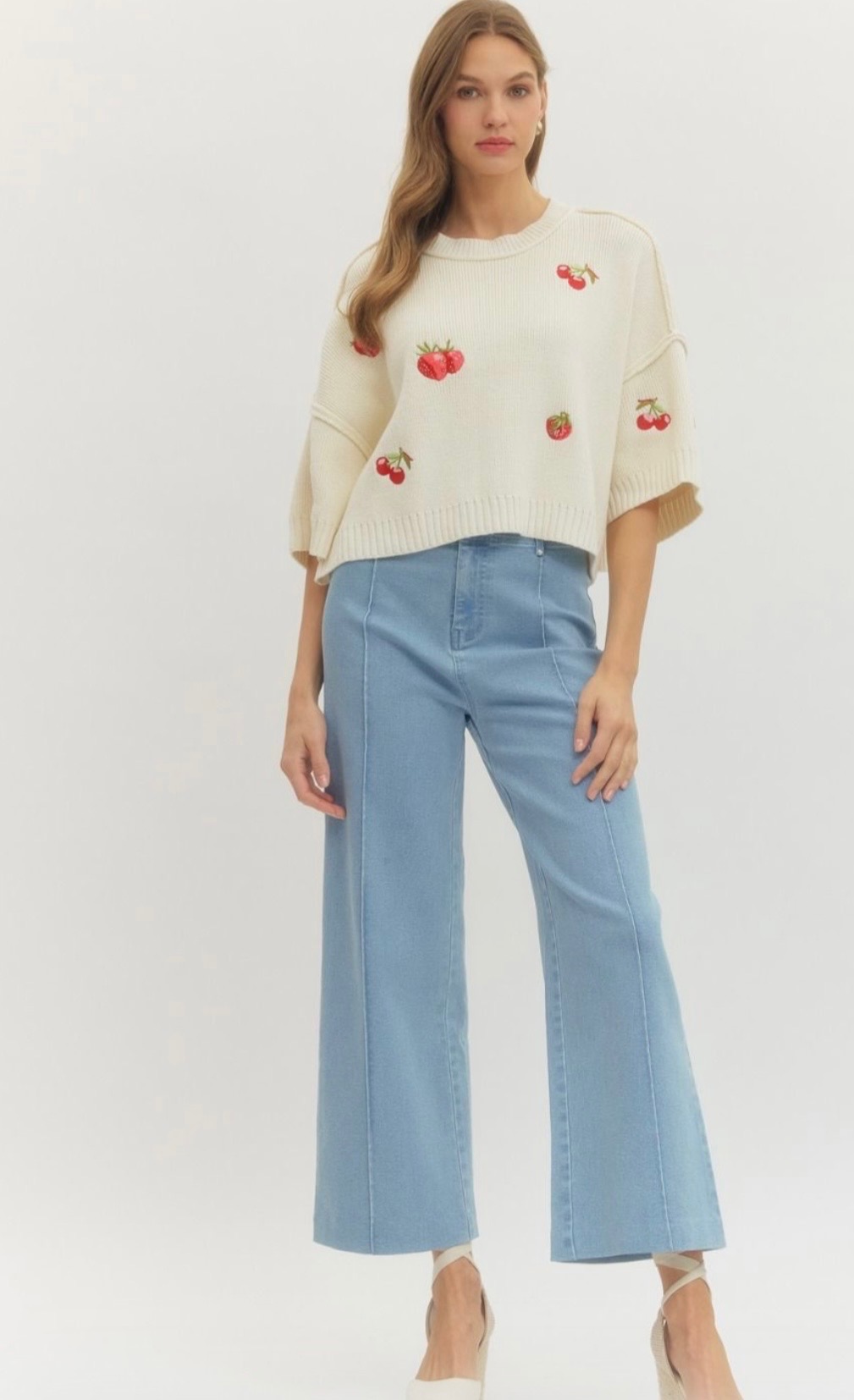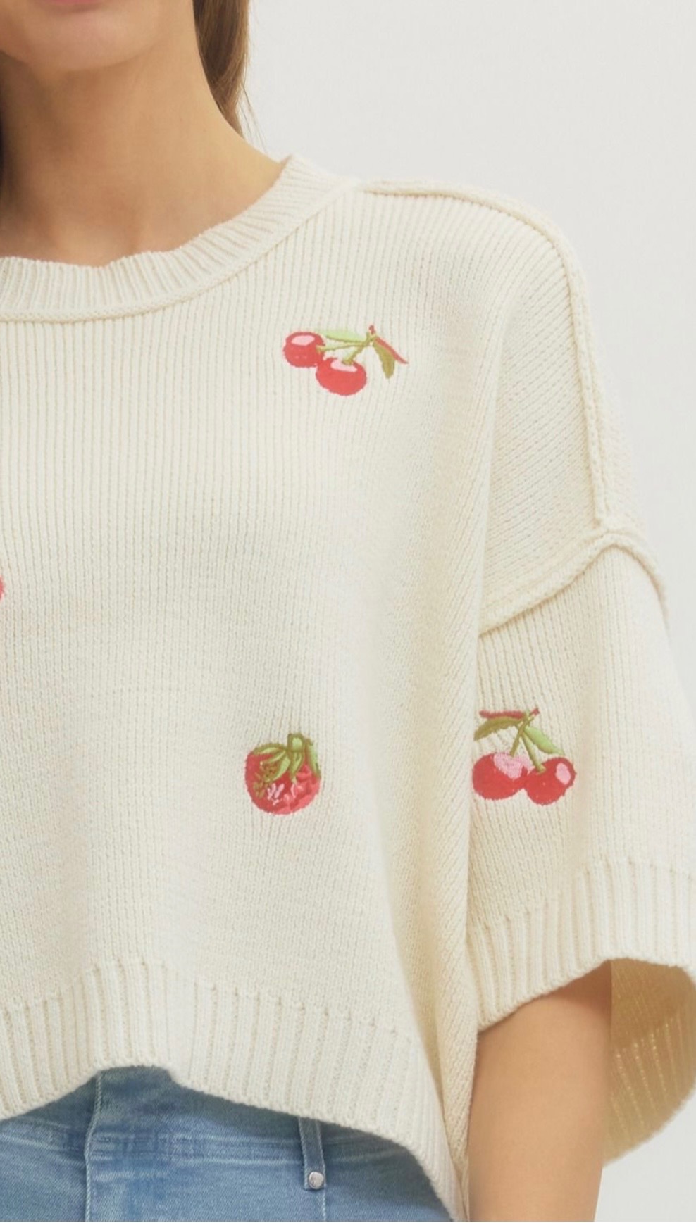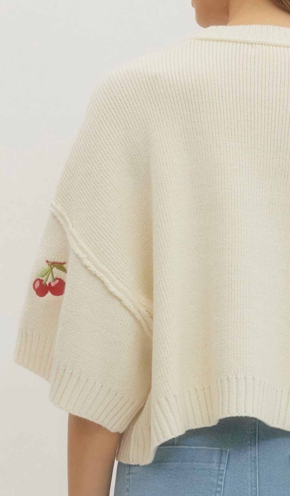 Cream knit sweater with a relaxed cropped silhouette, featuring playful cherry embroidery throughout, a classic crew neckline, and wide elbow-length sleeves for a fresh whimsical feel. Available in small, medium, and large.
