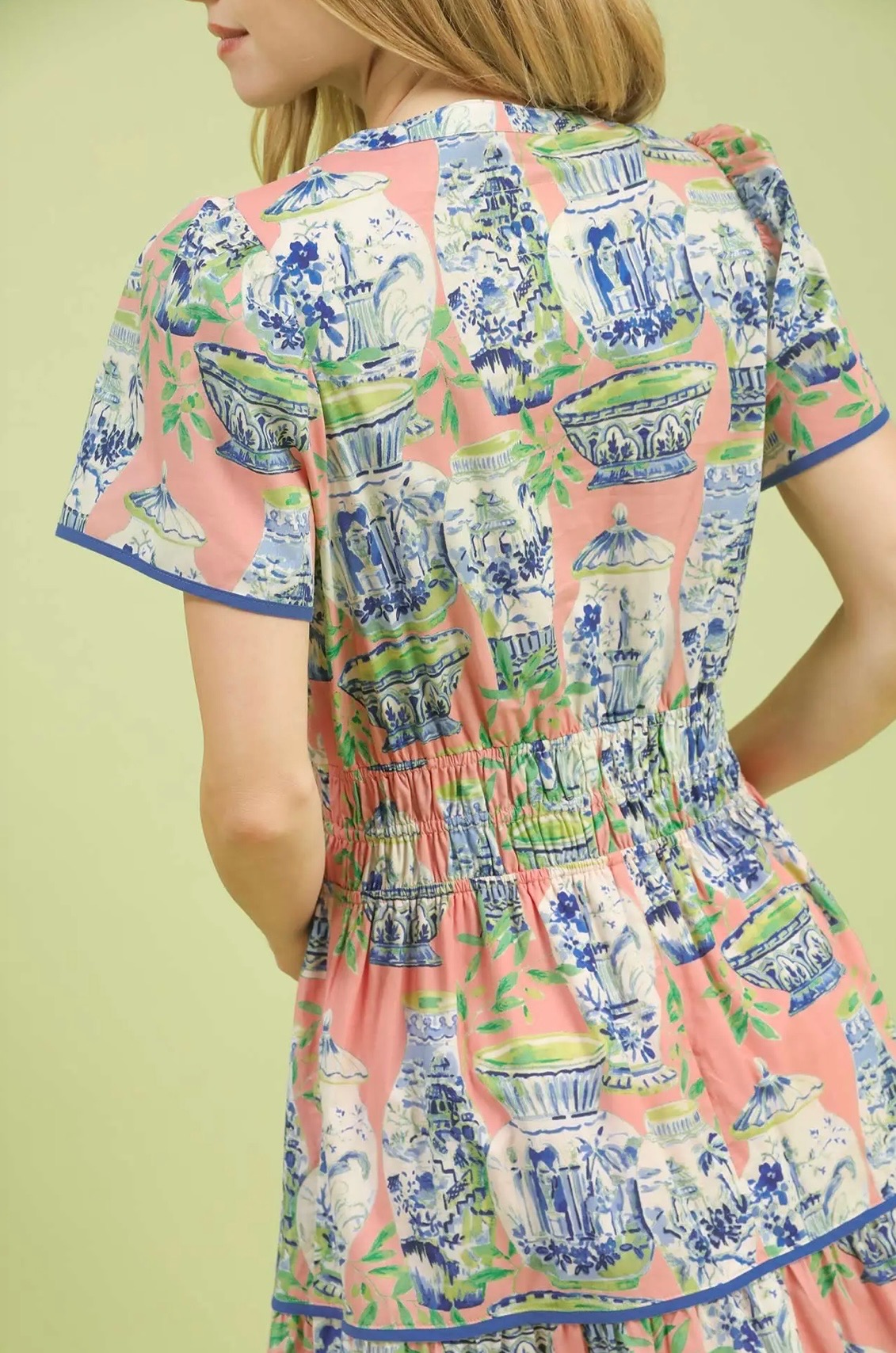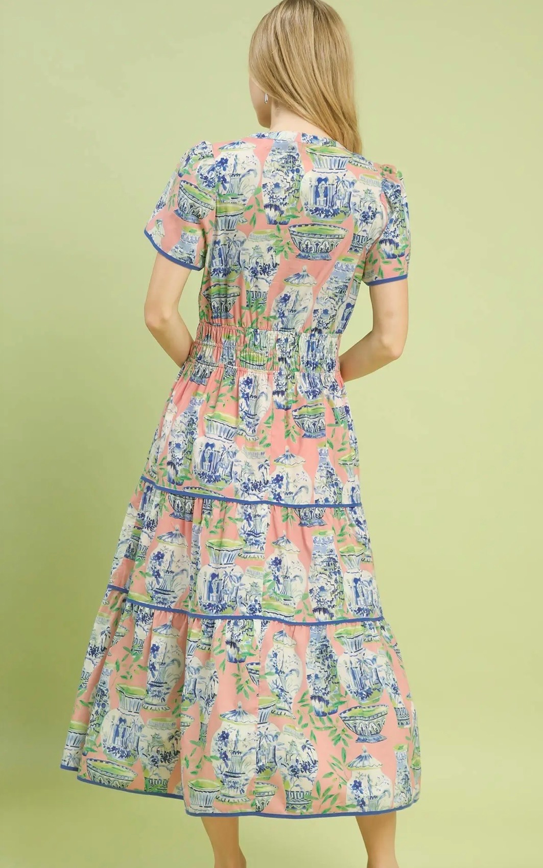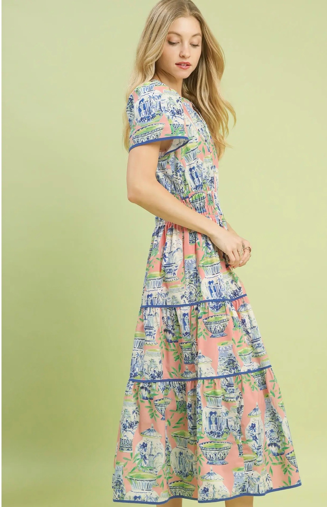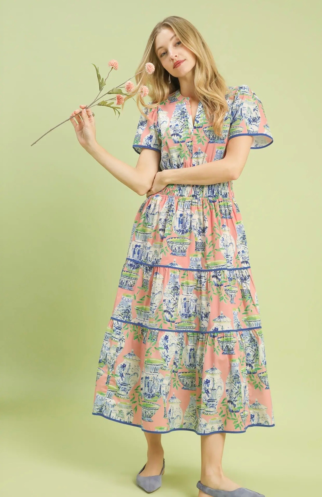 Peach and blue print midi dress with a split neckline, short flutter sleeves, smocked waist, and tiered skirt for a light, feminine silhouette. Comes in small, medium, and large.