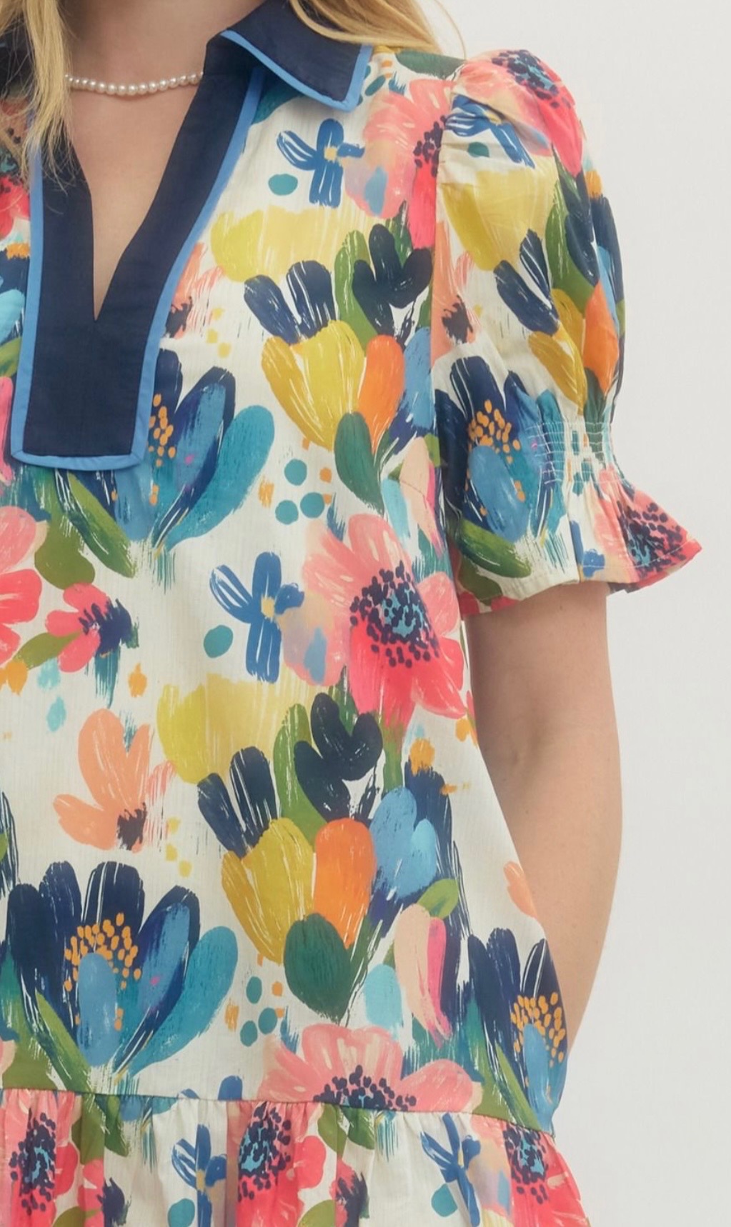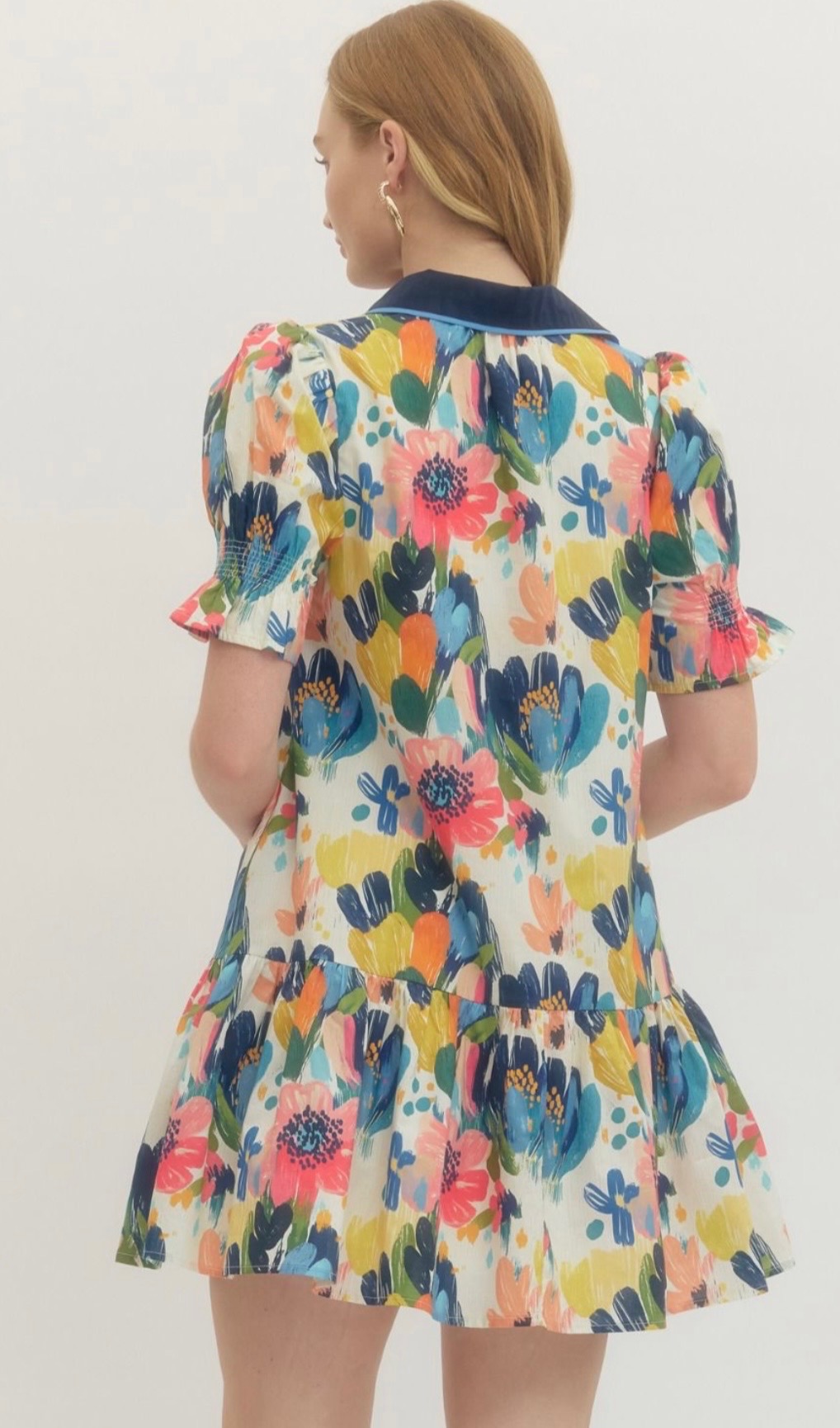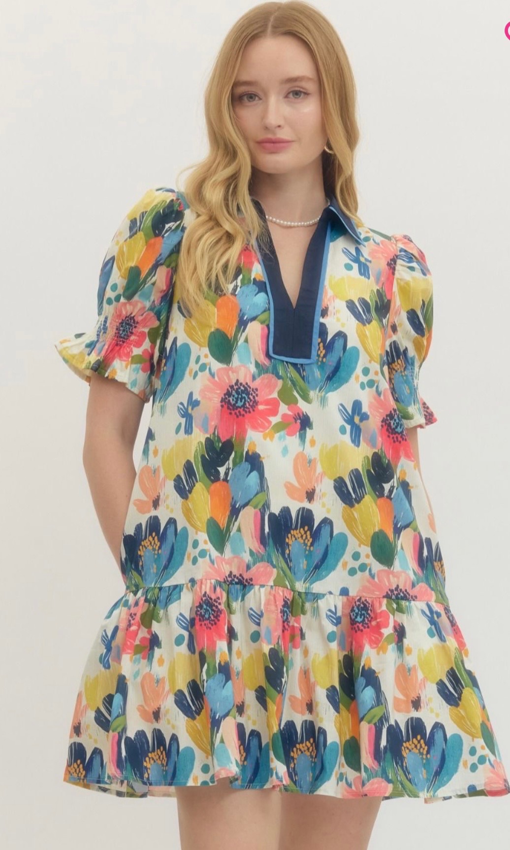 Colorful floral dress with a relaxed fit, short puff sleeves, a contrast V-neck, placket, and a softly tiered skirt for a playful, feminine look. Available in small, medium, and large