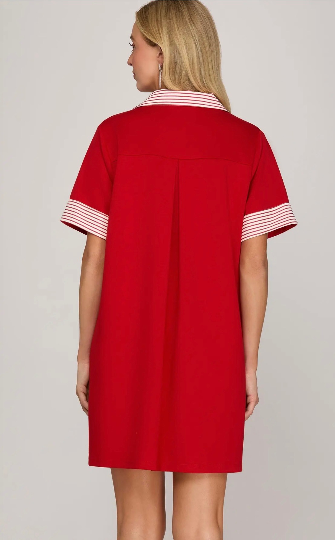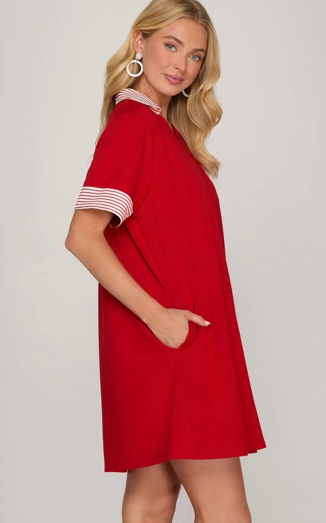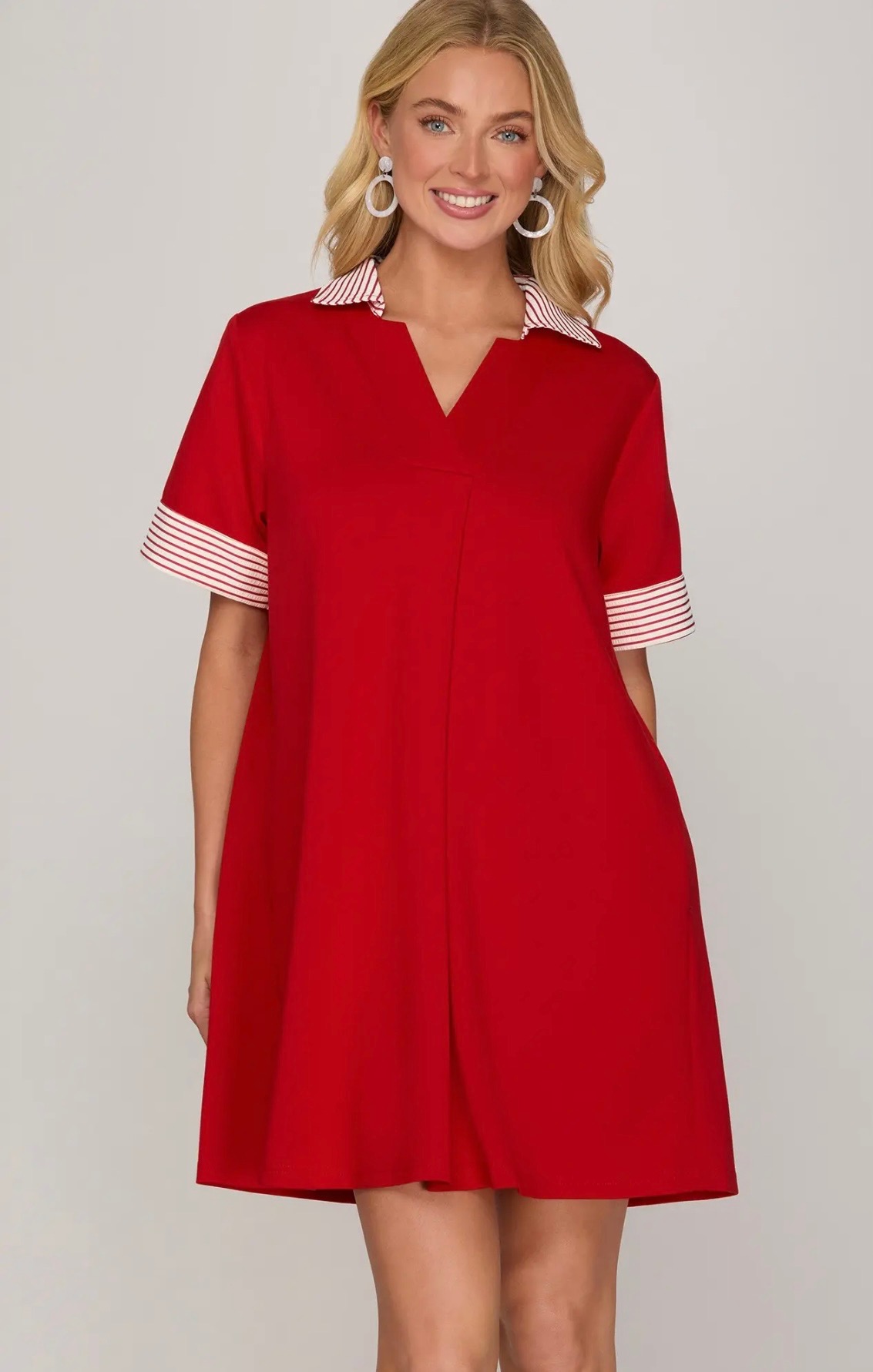 Vibrant red swing dress with a relaxed silhouette, featuring a notched neckline, short sleeves with striped cuff accents, and a contrasting striped collar for a polished yet playful look. Comes in small, medium, and large.