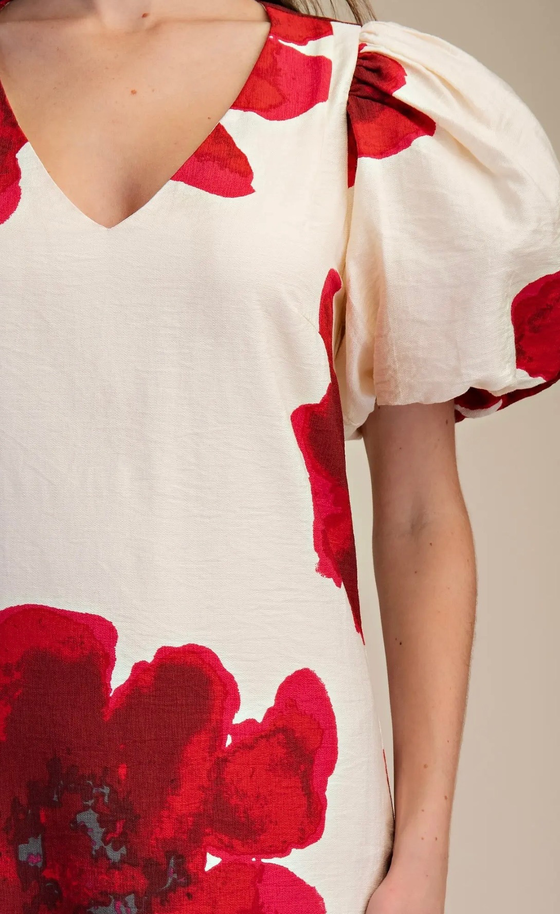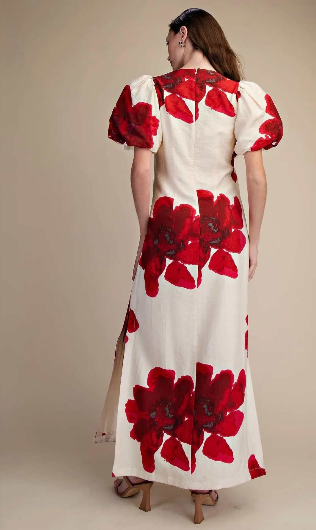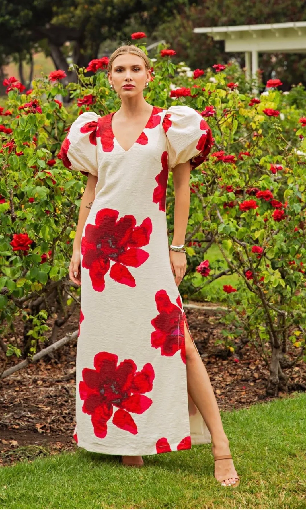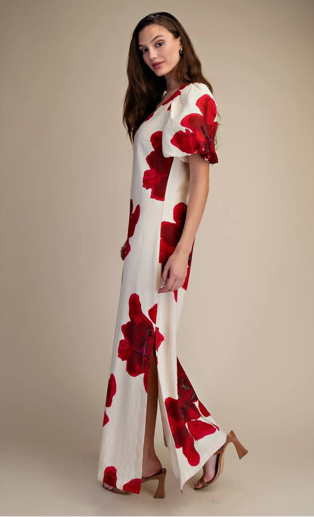 Elegant cream maxi dress featuring bold red floral prints, a flattering V-neckline, statement puff sleeves, and a side slit for a feminine, romantic silhouette. Comes in small, medium and large.