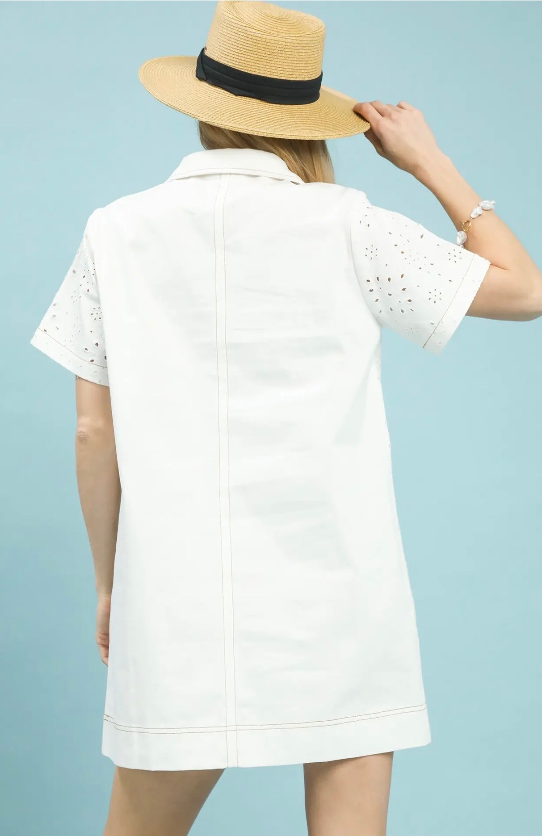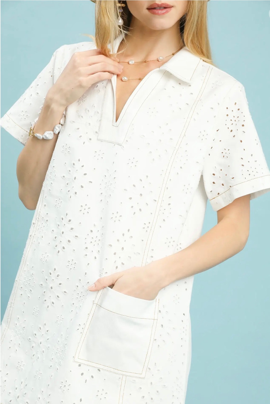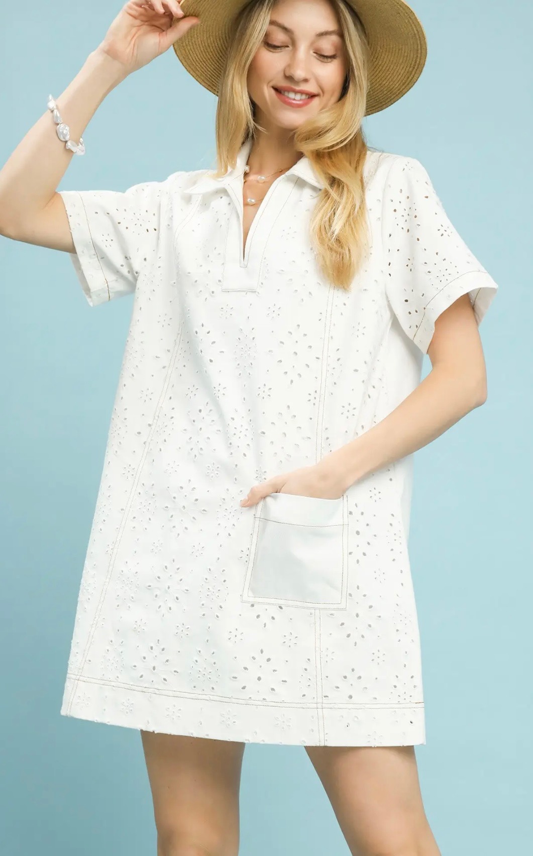 Crisp white eyelet dress featuring a collared split neckline, short sleeves, contrast stitching, and a functional front pocket for a clean, polished summer look. Comes in small, medium, and large.