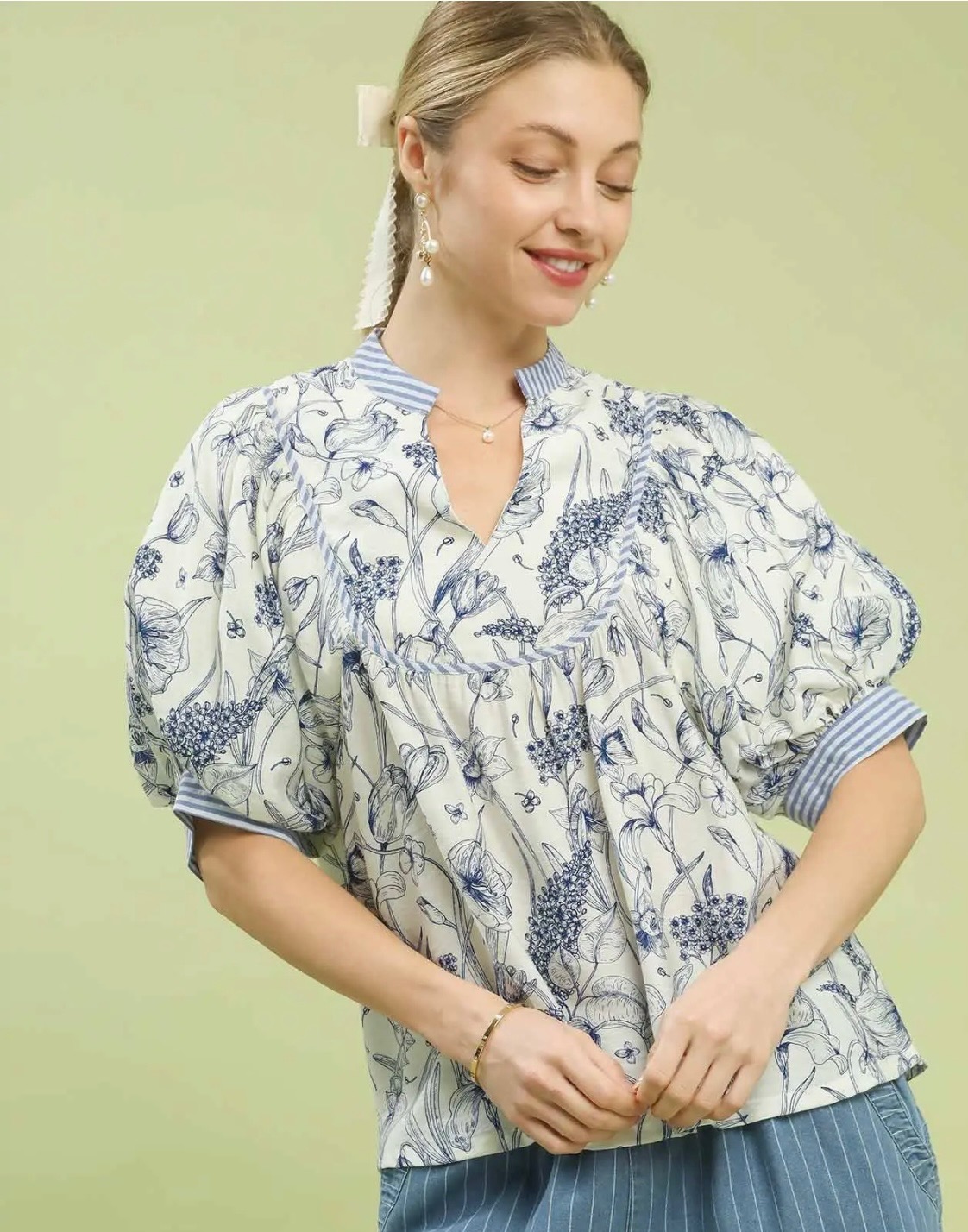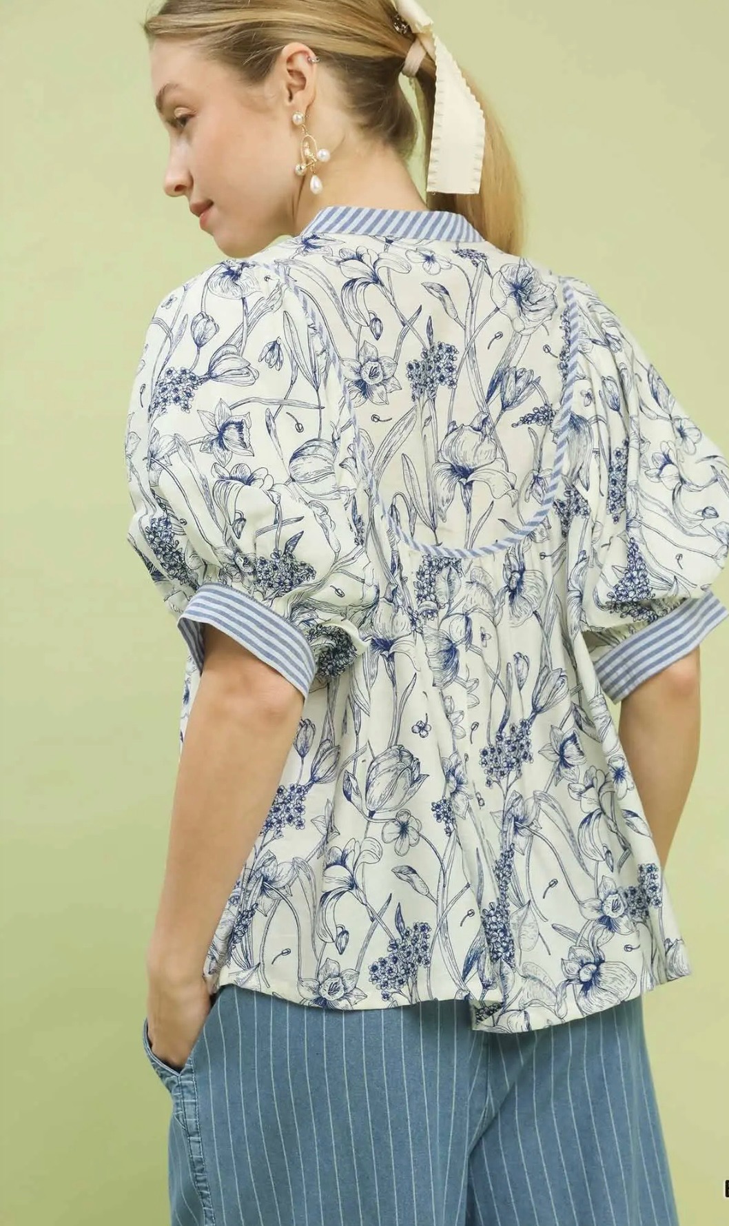 A lightweight, feminine blouse in a soft ivory base with delicate blue botanical prints, featuring puff sleeves, a notched neckline with striped trim, and a relaxed, flowy silhouette for effortless everyday elegance. Comes in small, medium, and large.