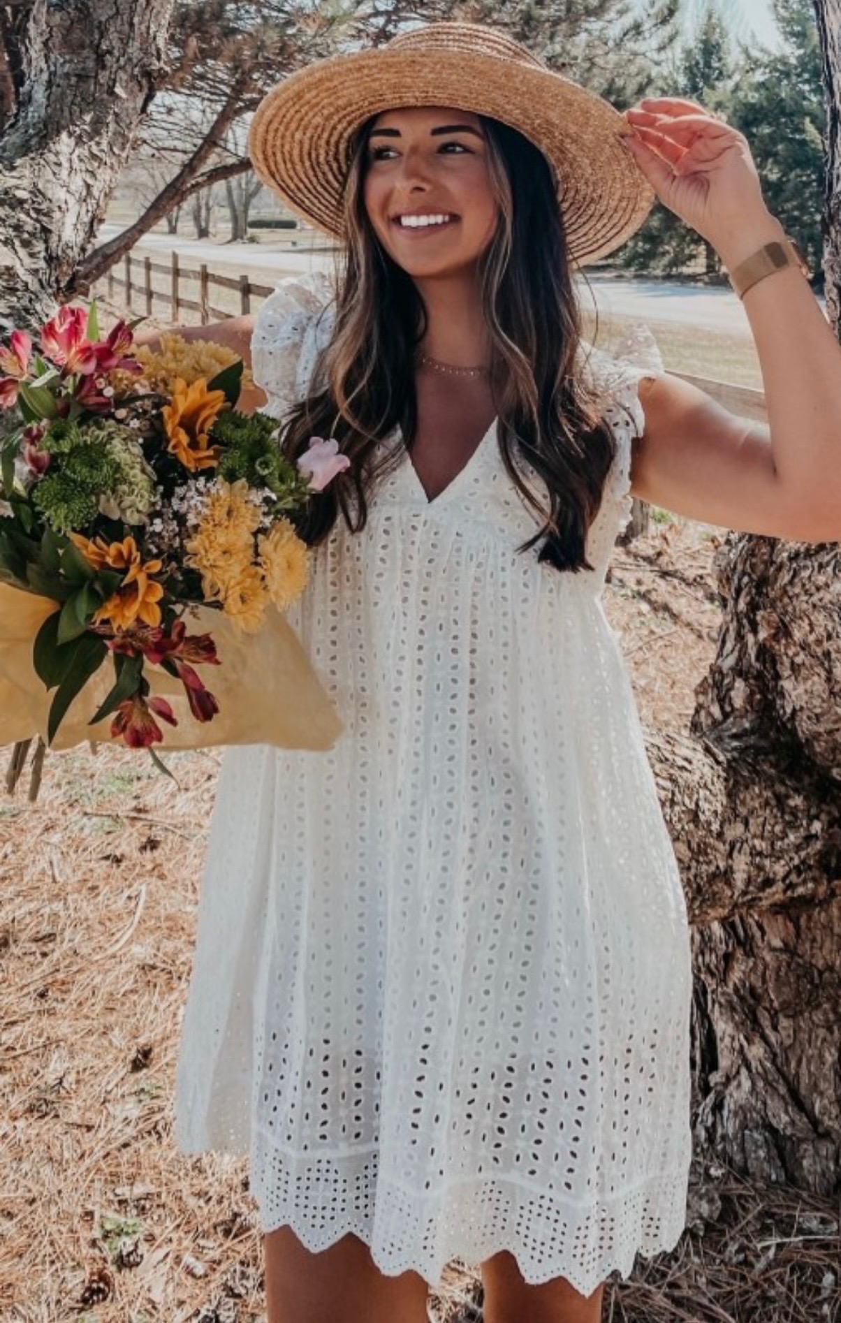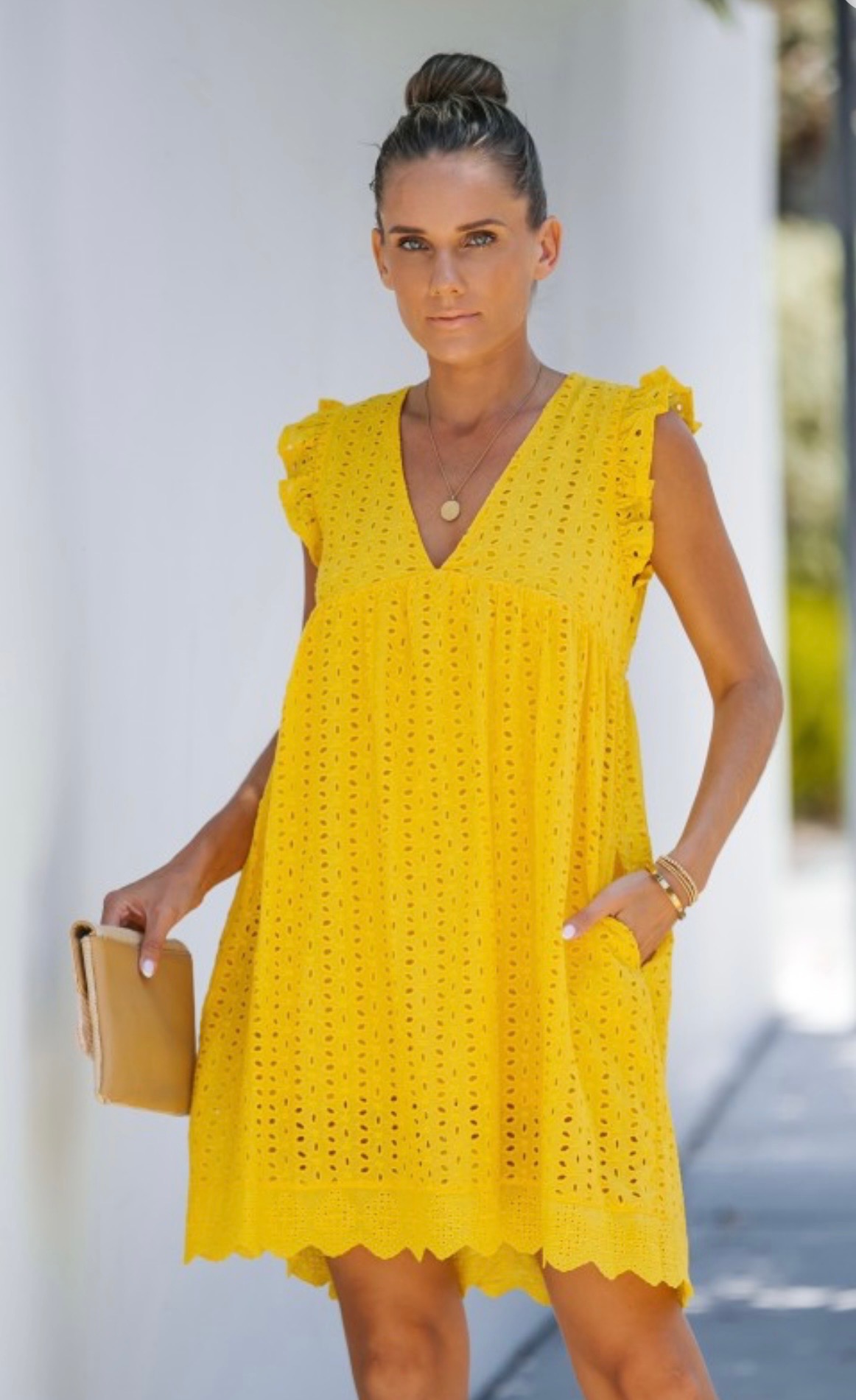 This bright eyelet dress is available in hot pink, yellow, or white. It features a delicate eyelet fabric, a flattering V-neckline, and feminine ruffled sleeves. Designed with a relaxed, breezy fit and scalloped hem detail, this light weight dress is perfect for beach days, vacations or sunny outings. Available in small, medium, and large.