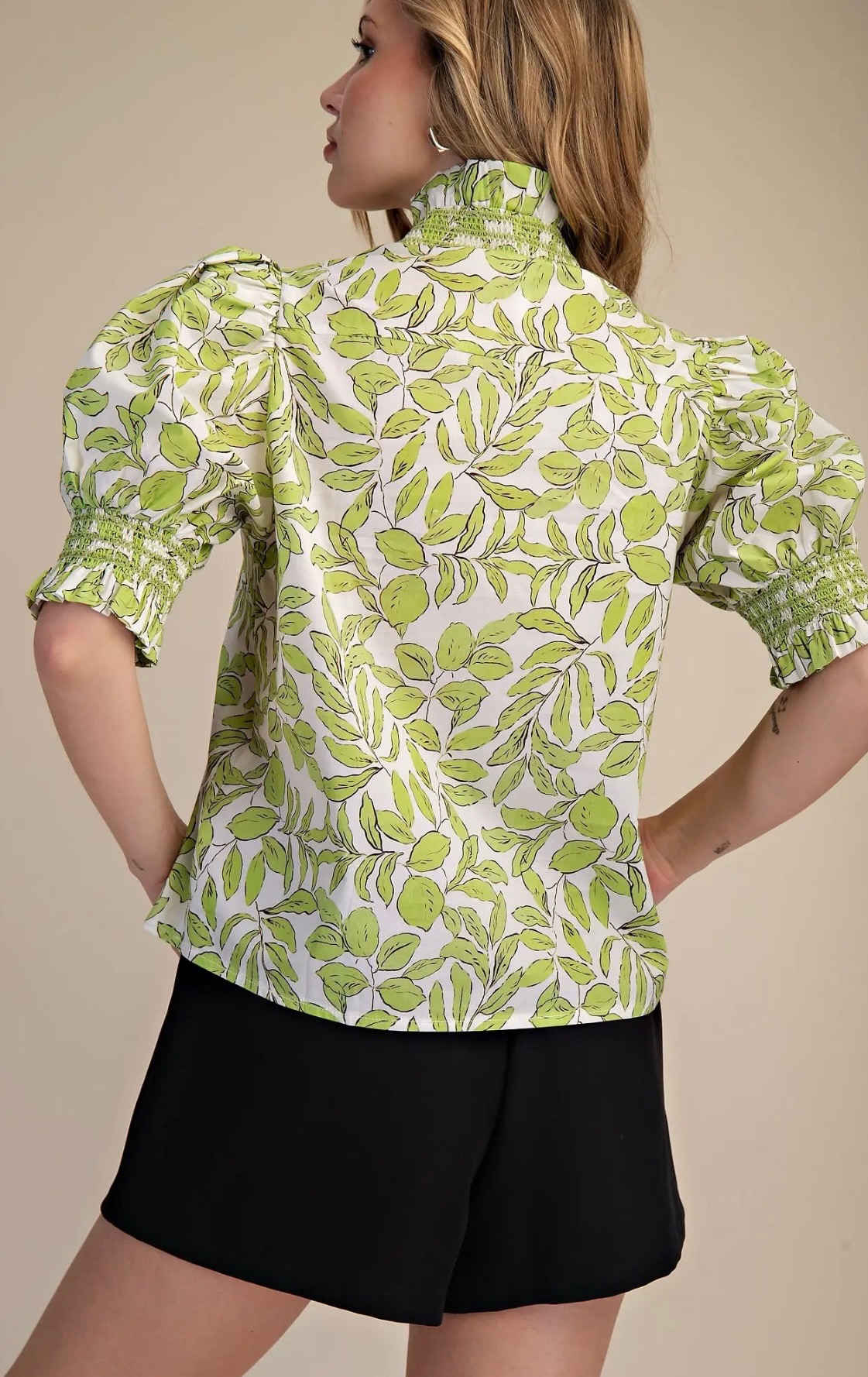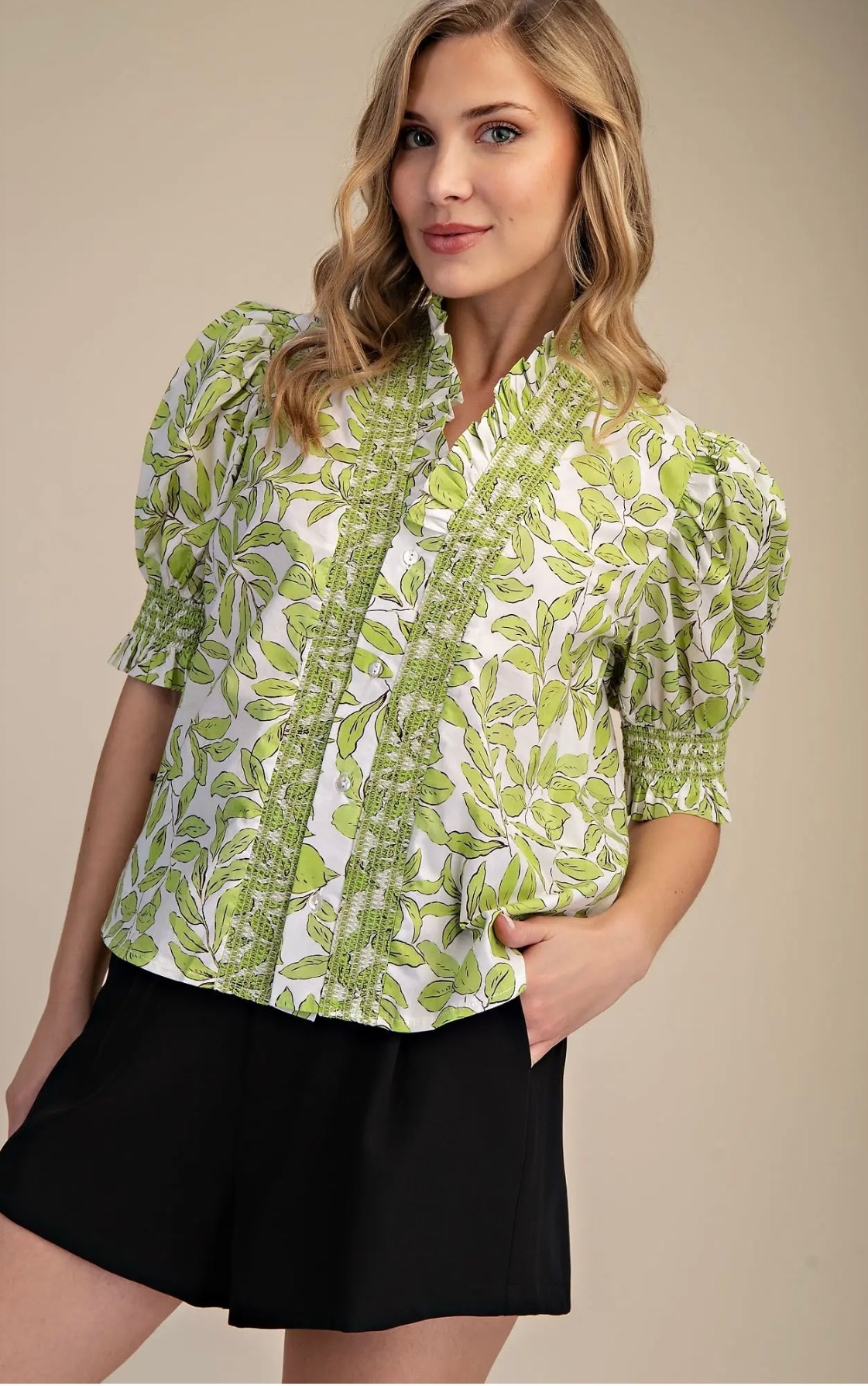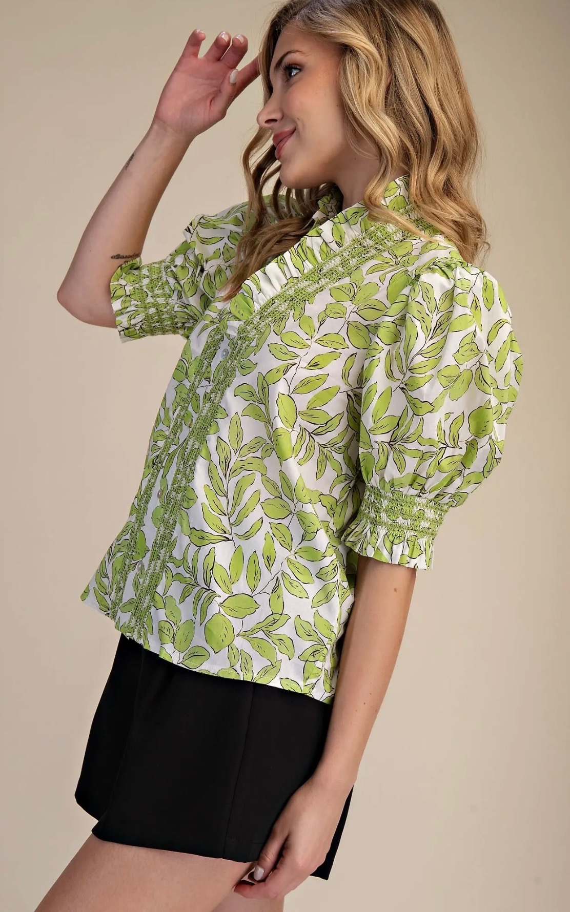 Lightweight white blouse with a fresh green leaf print, puff sleeves with smocked cuffs, ruffled neckline, and button-front detail for a polished yet feminine look. Comes in small, medium, and large.