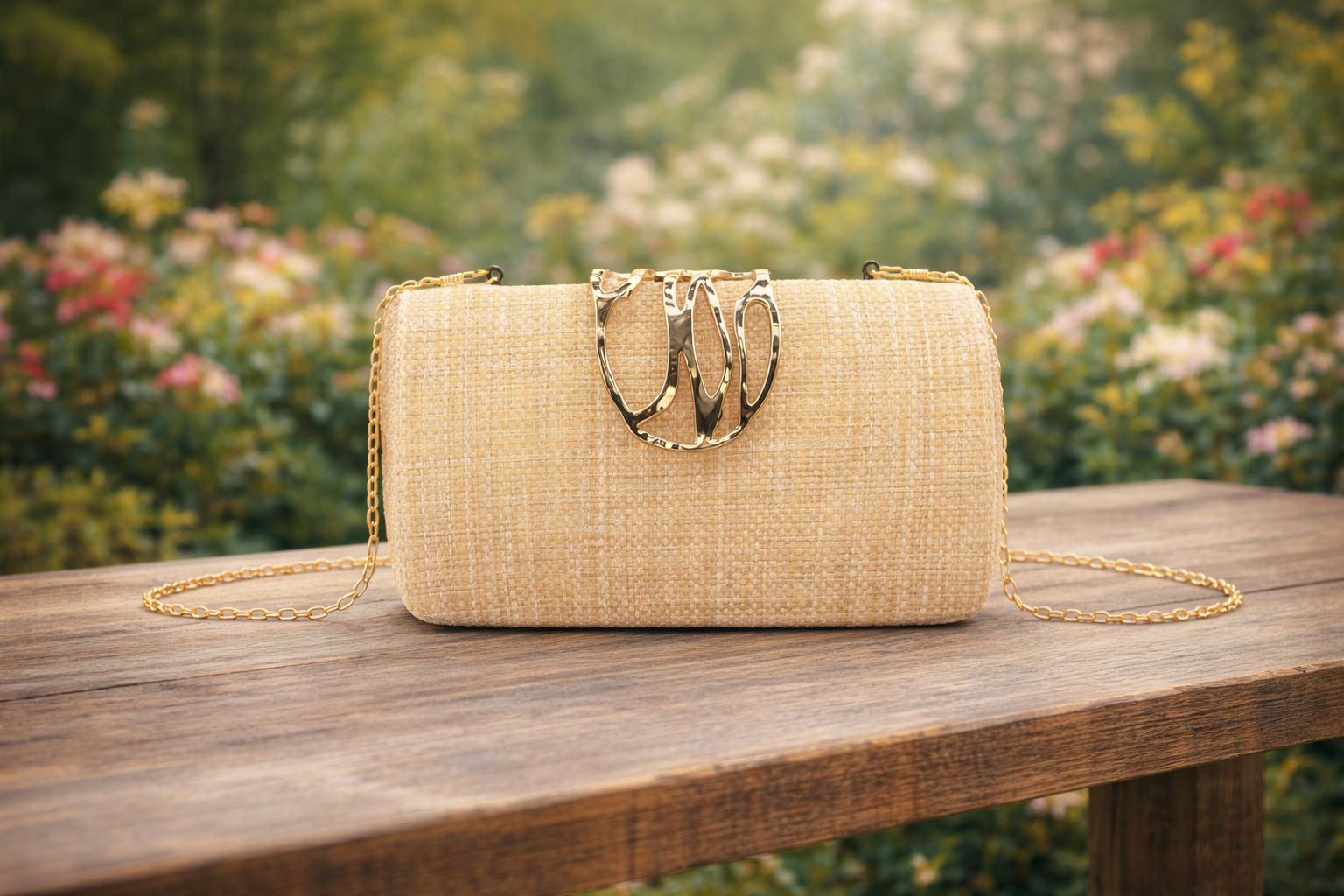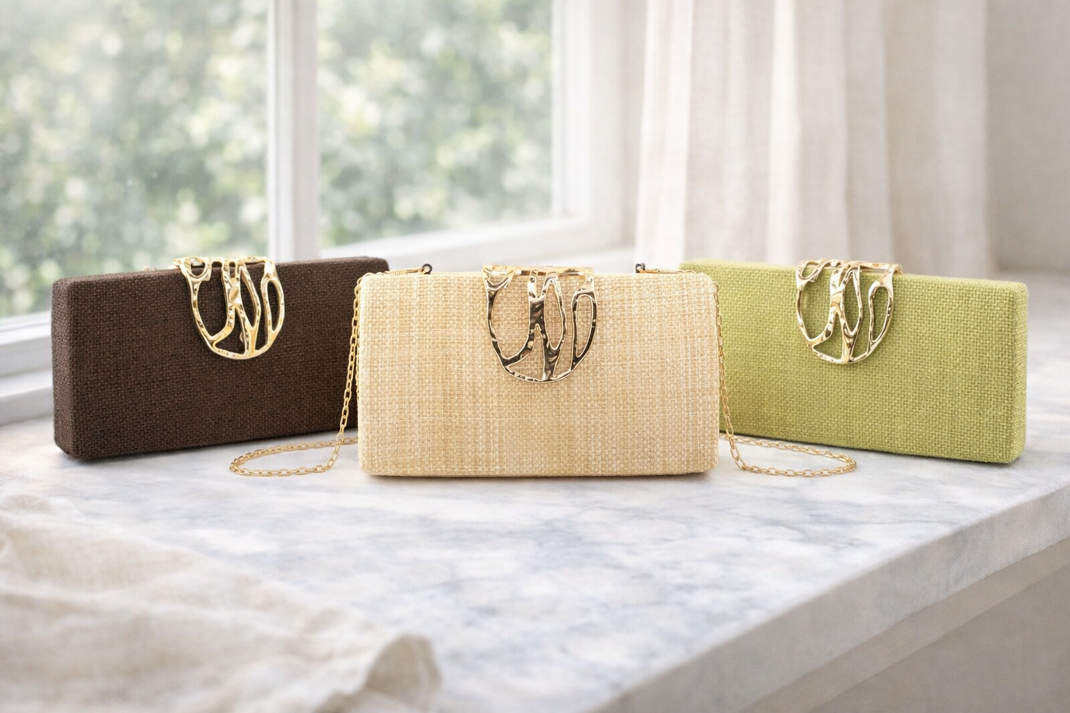 Elegant clutch in brown, green or khaki, featuring a textured fabric finish and a bold gold-toned statement clasp, offering a sophisticated and timeless accessory for formal or evening wear.