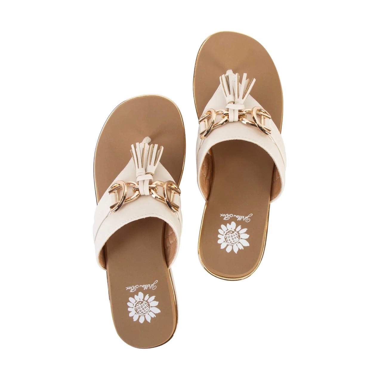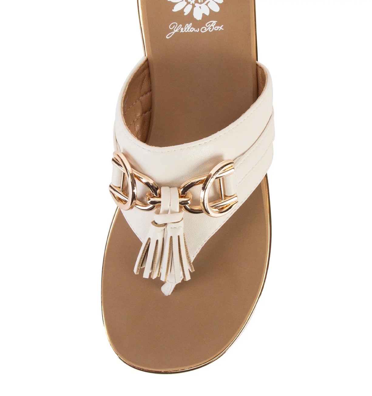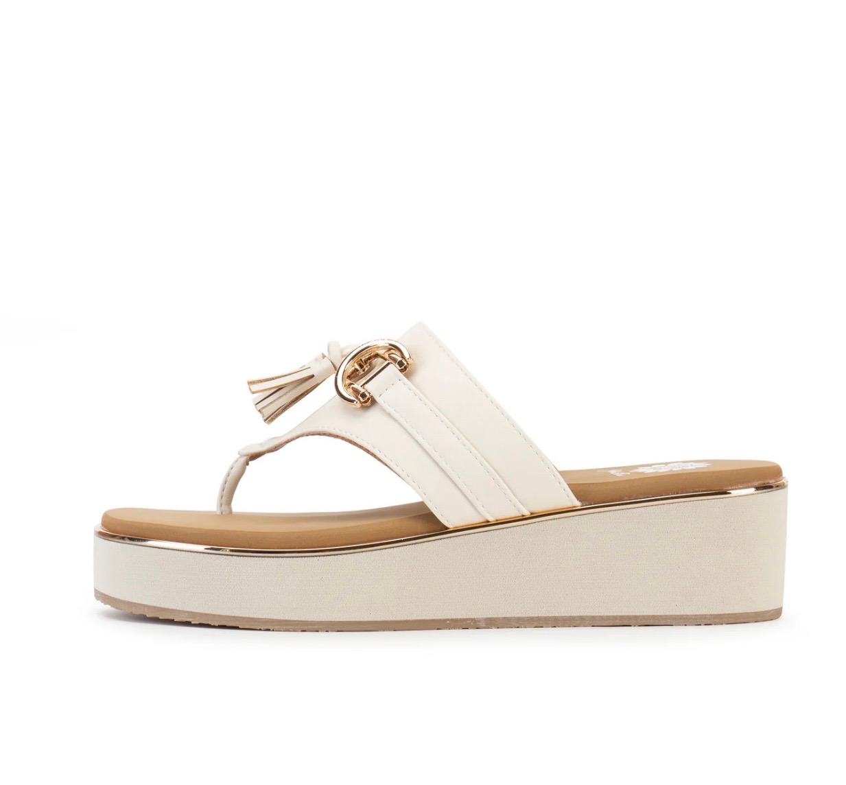 Cream faux leather platform sandal featuring a sleek thong strap with gold hardware and tassel detail, set on a cushioned metallic wedge sole for effortless summer elevation. Available in sizes 6-10. also, available in half sizes.