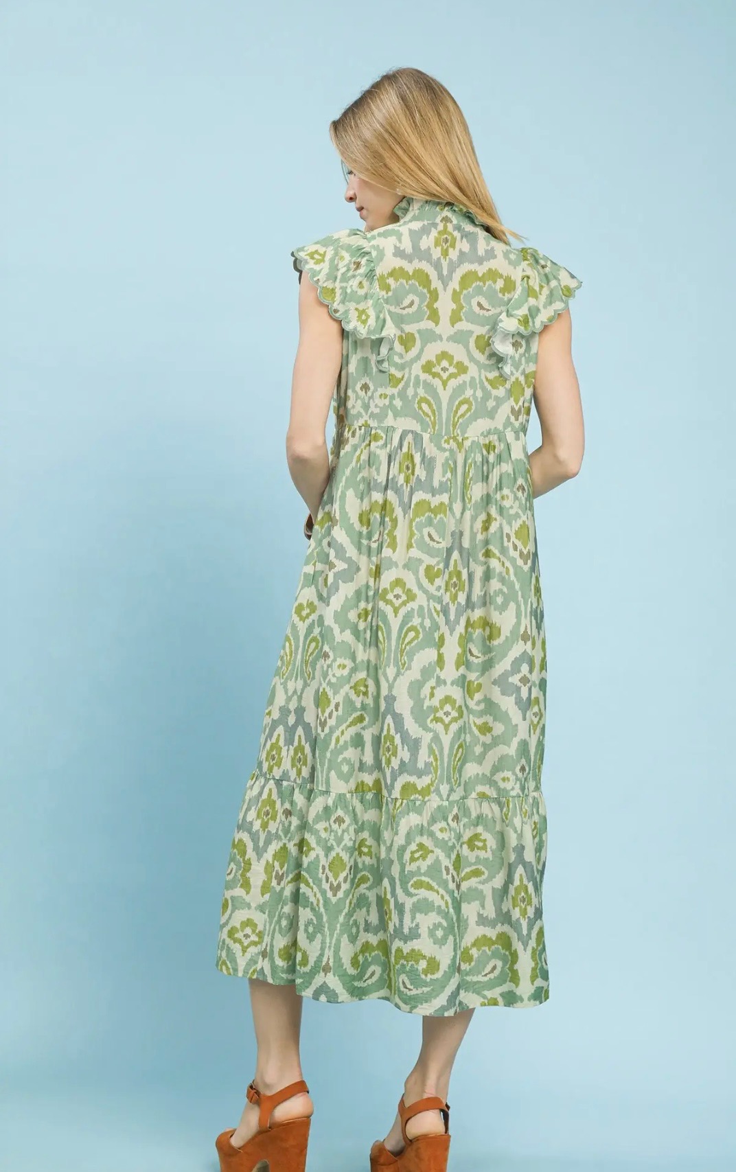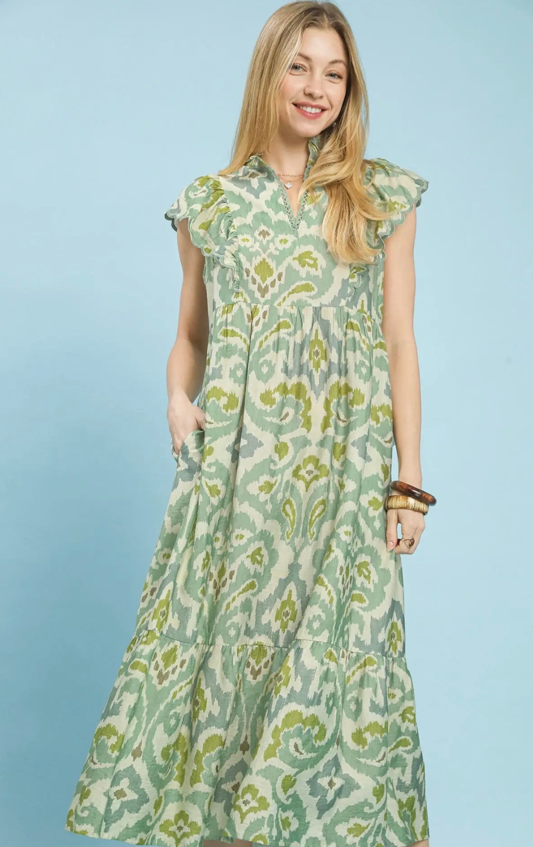 Lightweight midi dress featuring a soft green print, flutter sleeves, a split neckline, and a tiered skirt for an easy breezy silhouette. Comes in small, medium, and large.