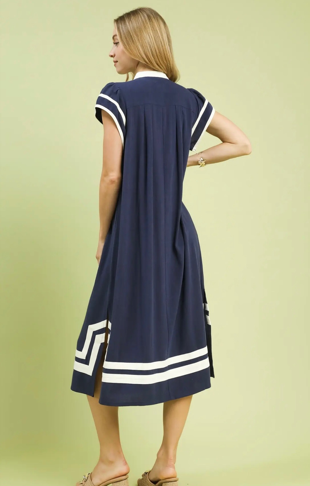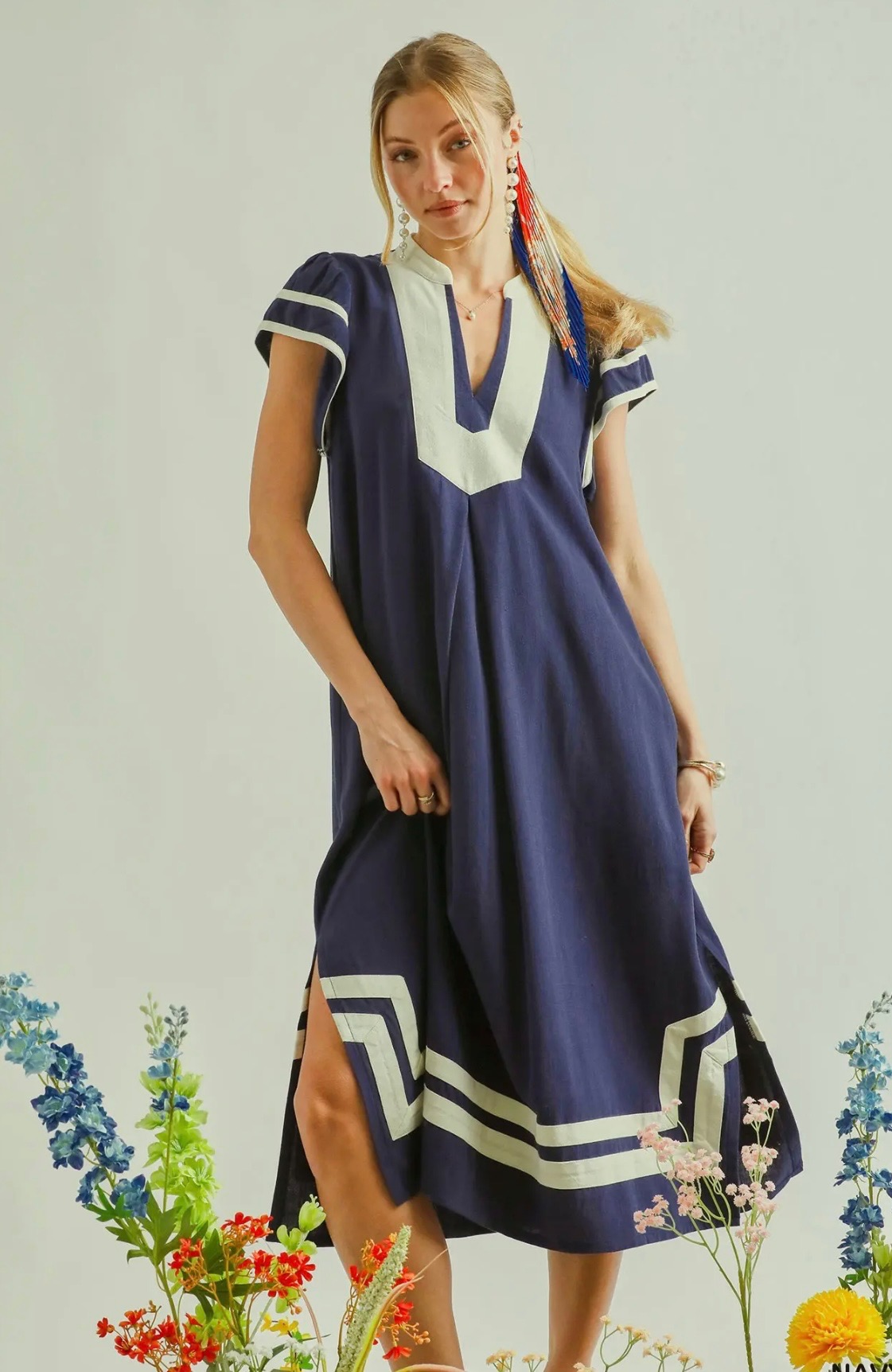 A flowing navy midi dress with crisp contrast trim, a split V-neckline, short sleeves, and side slits, offering a polished yet relaxed silhouette with a touch of modern nautical style. Available in small, medium, and large.