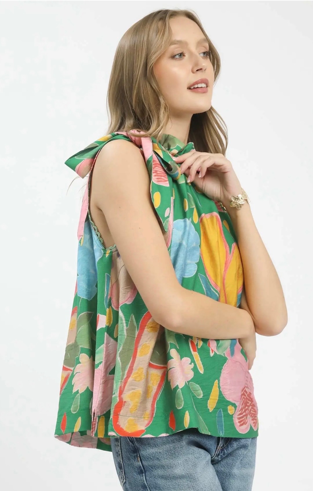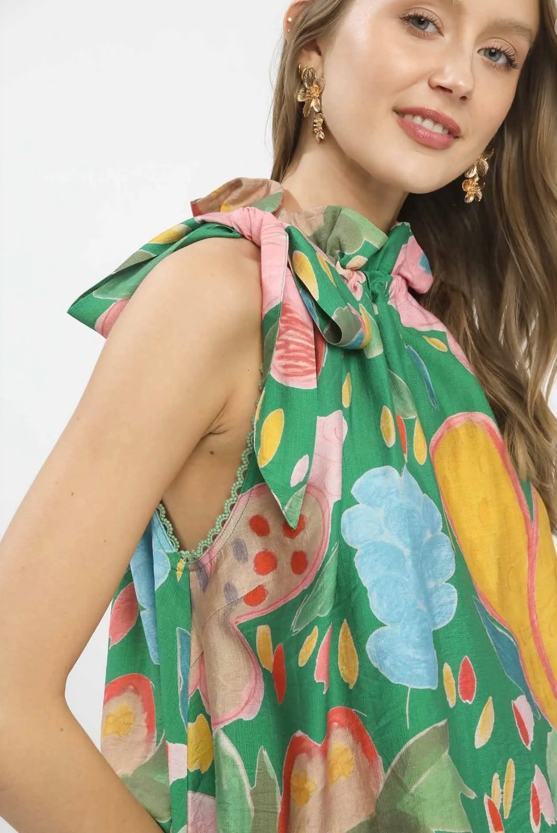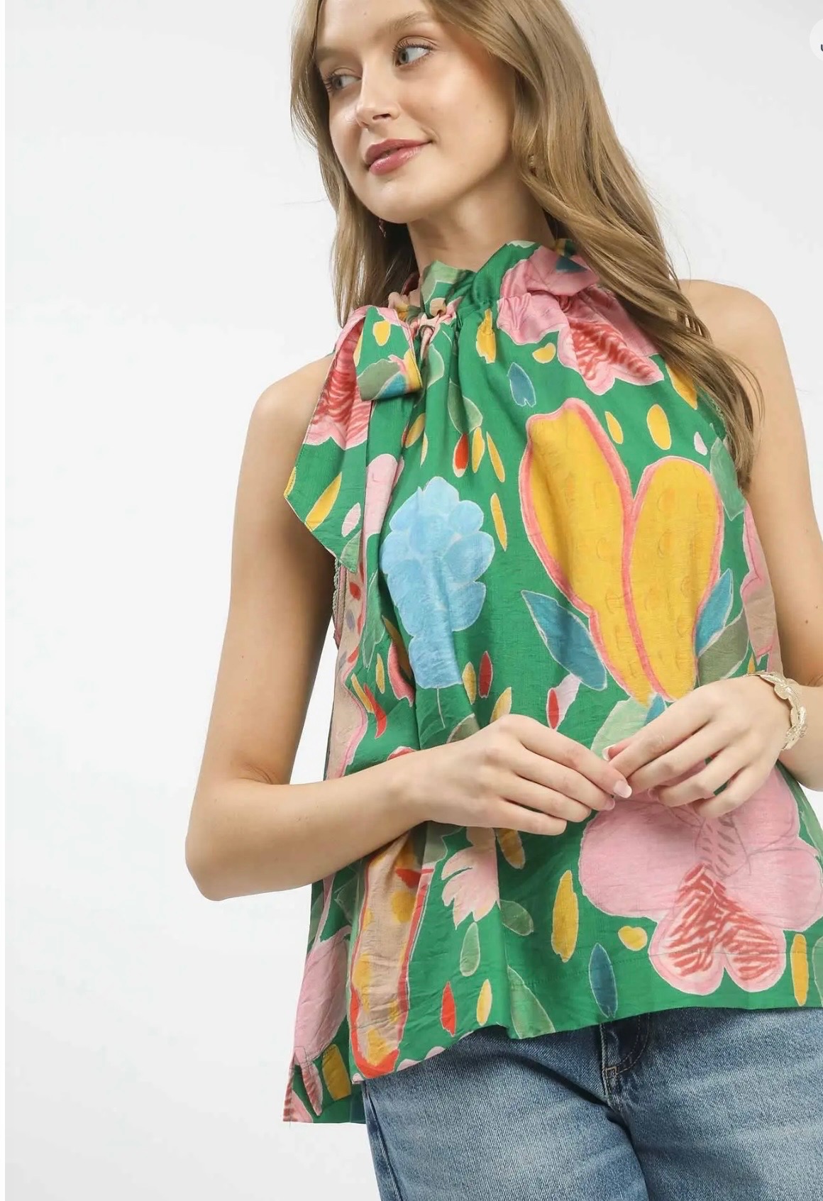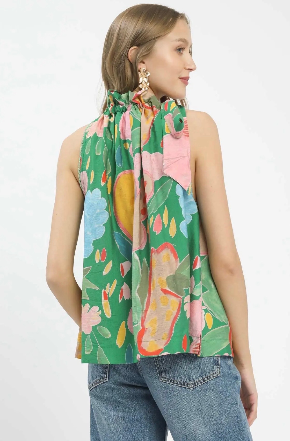 Vibrant and playful, this sleeveless green top features a bold floral print and a chic tie-neck detail for an effortlessly stylish statement. Available in sizes small, medium, and large.