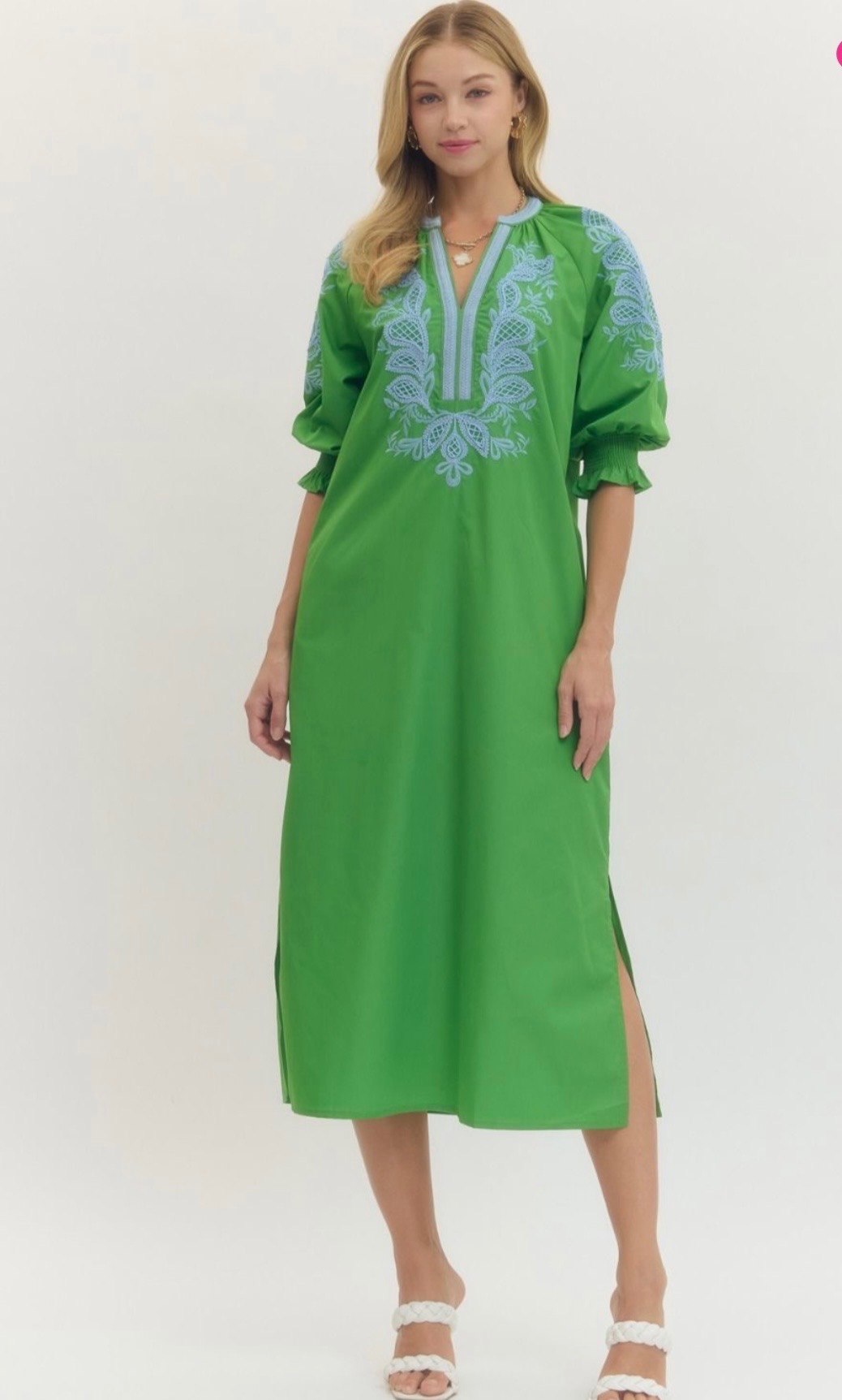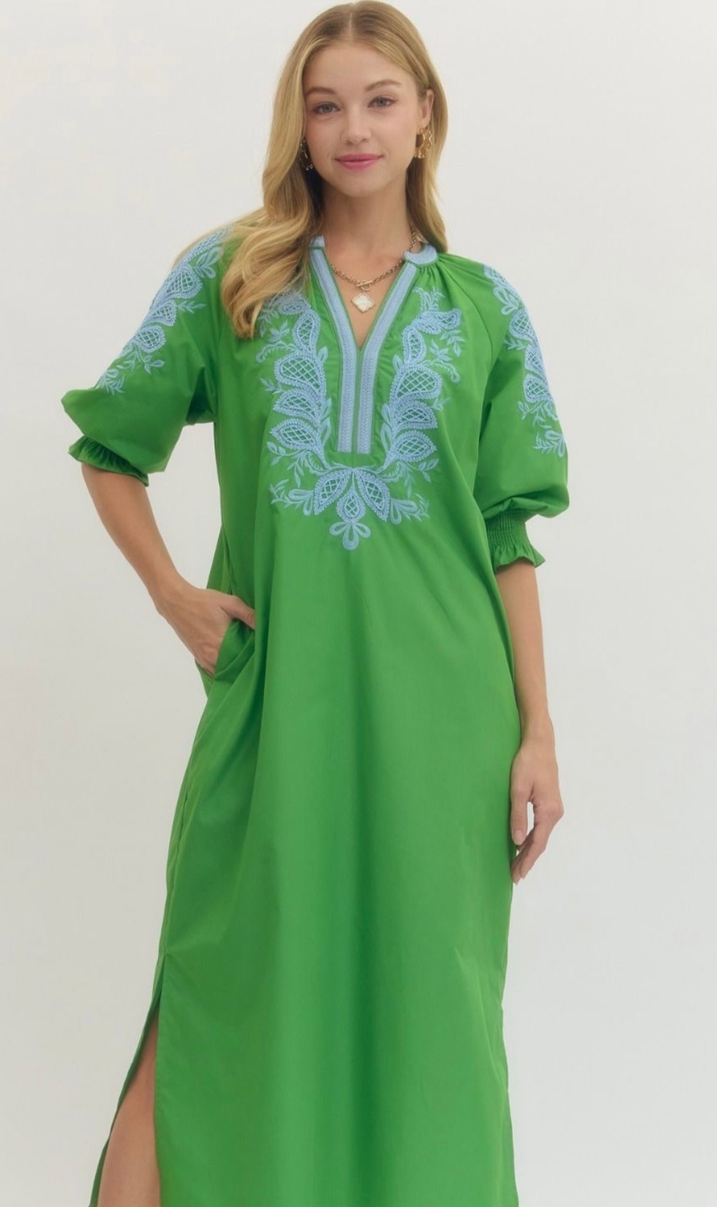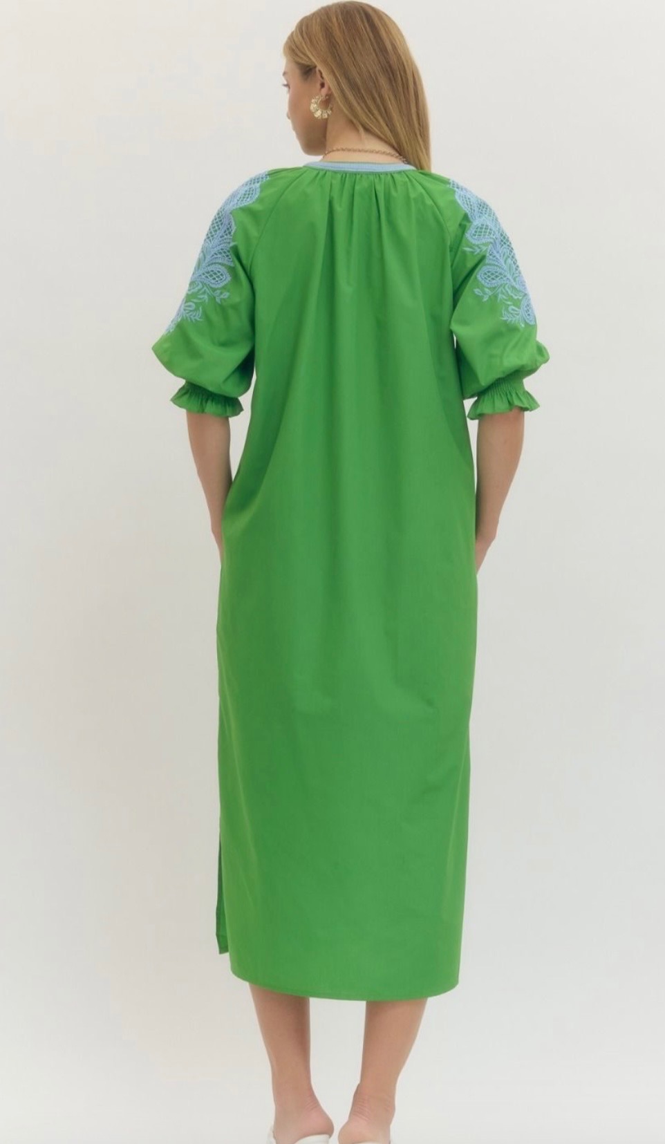 Green midi dress with a relaxed silhouette, featuring light blue embroidered detailing at the split neckline and chest, with softly puffed elbow-length sleeves with gathered cuffs, and side slits for easy movement. Available in small, medium, and large.