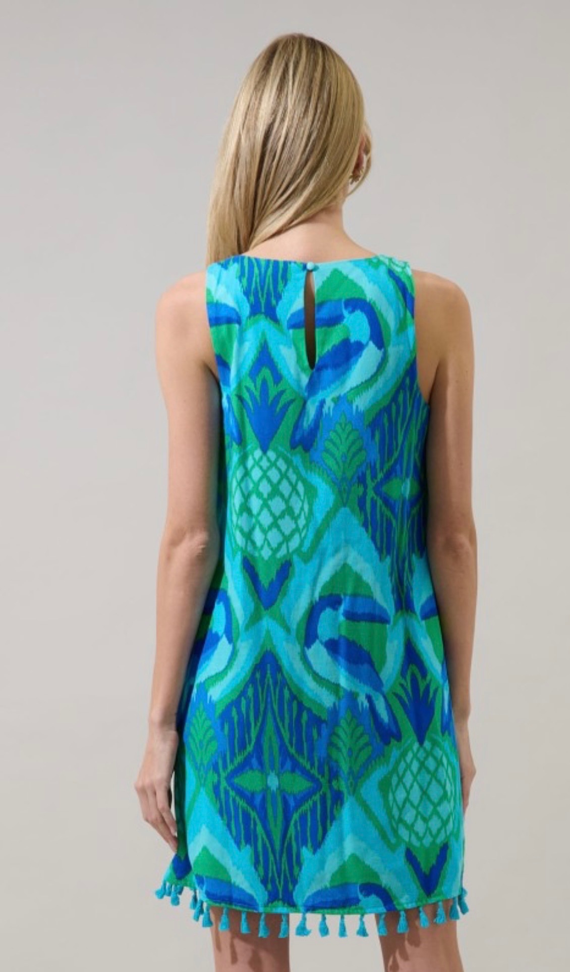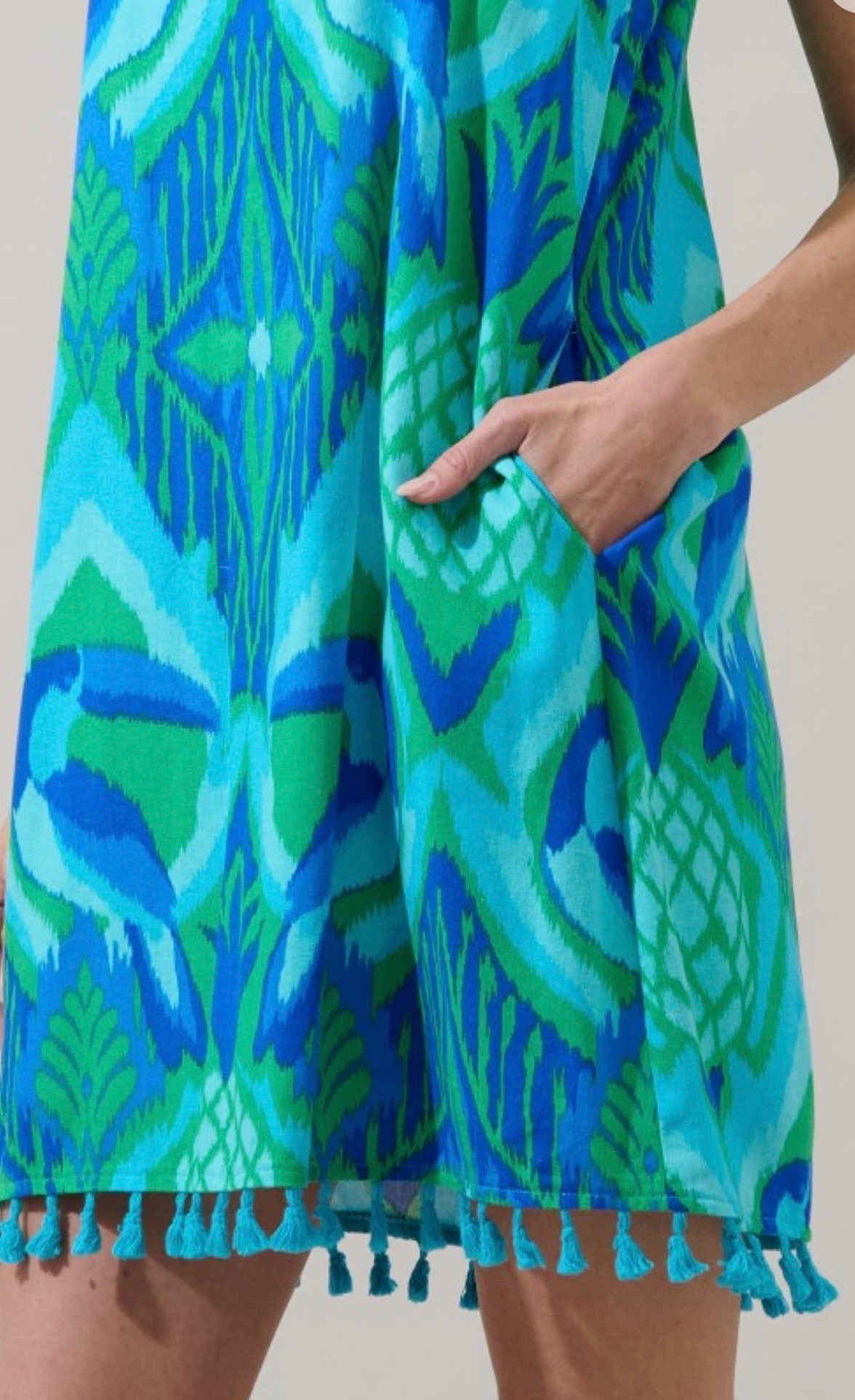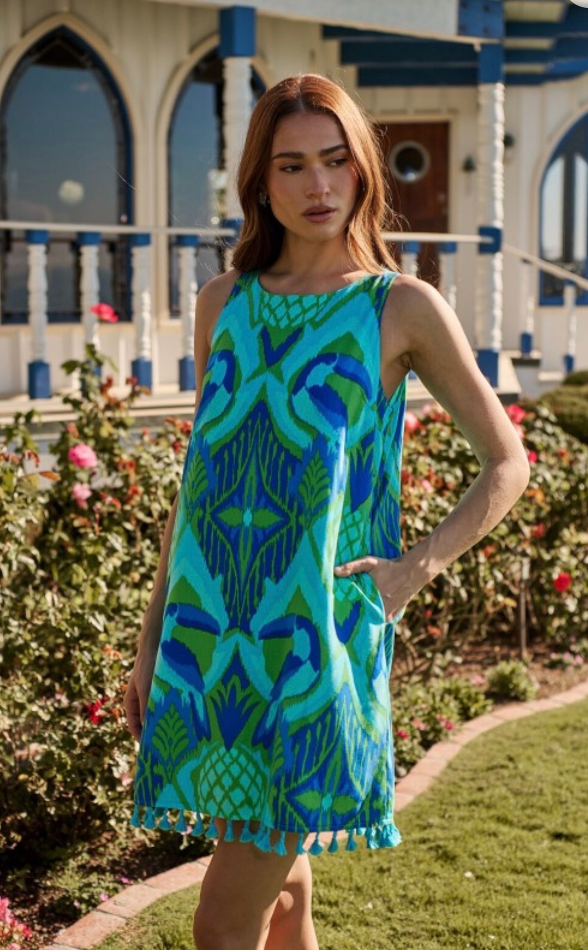 Vibrant sleeveless shift dress featuring a bold tropical print in shades of turquoise, green and deep blue. Designed with a relaxed silhouette, side pockets, and playful tassel trim along the hem, this lightweight dress is perfect for warm weather outings or casual resort style. Available in sizes X-small, small, medium, large and X-Large.