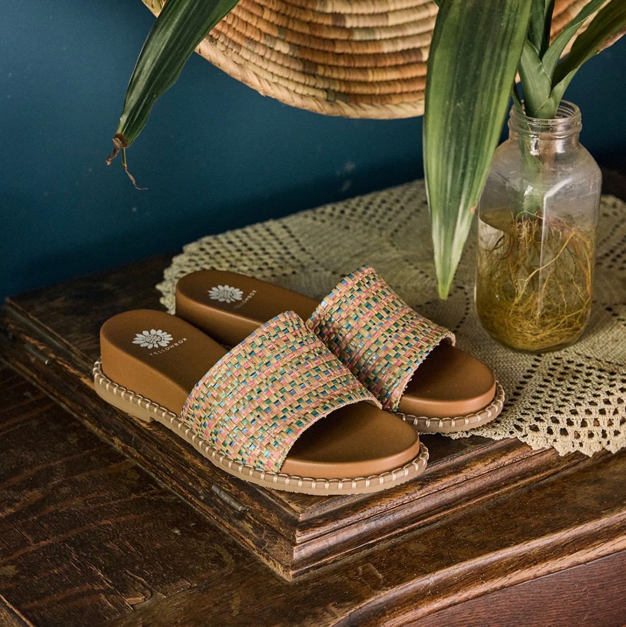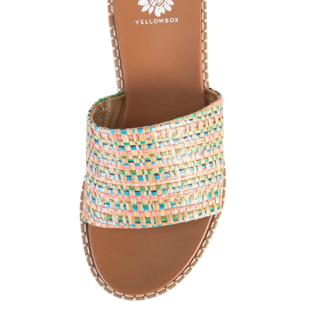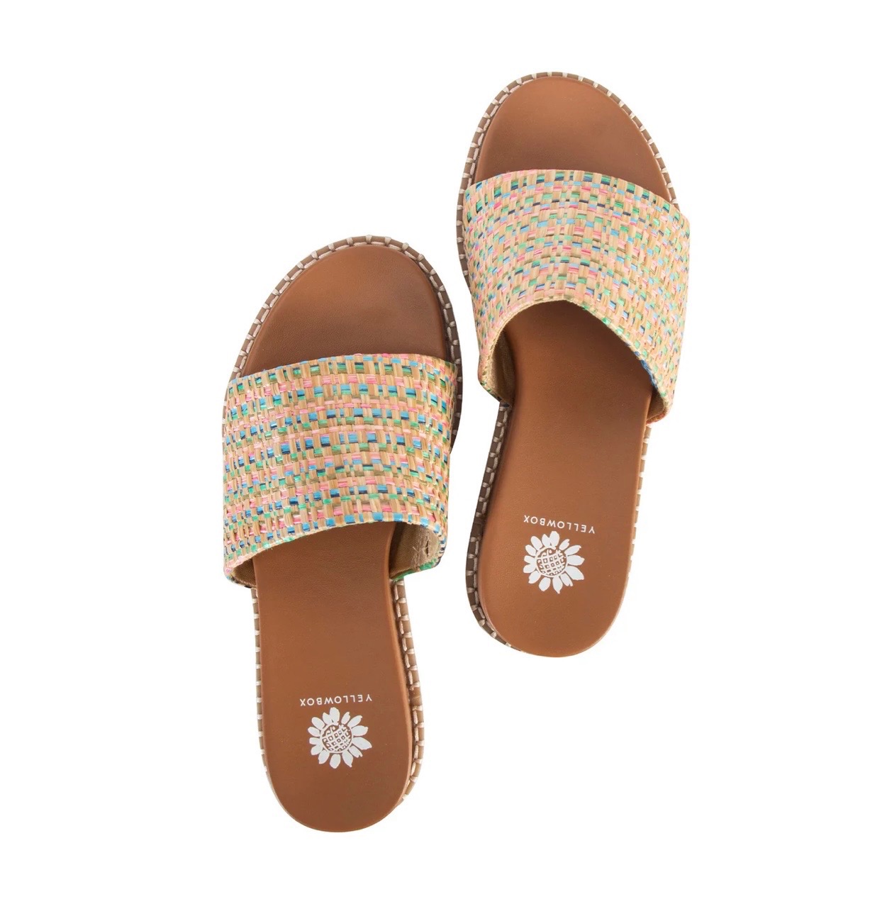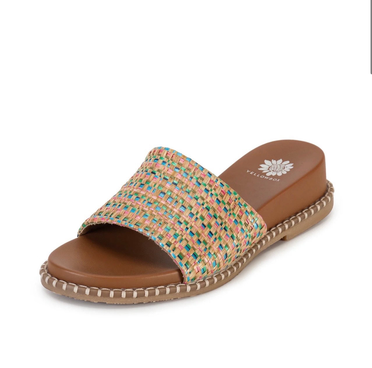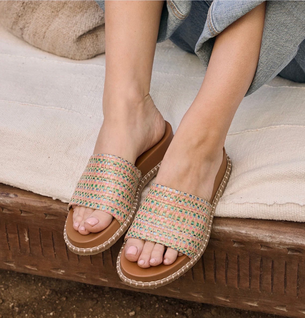 Comfortable slip-on sandals featuring a woven multicolor strap and cushioned brown sole. Lightweight and versatile, perfect for casual everyday wear or warm-weather outings. Available in sizes 6-10