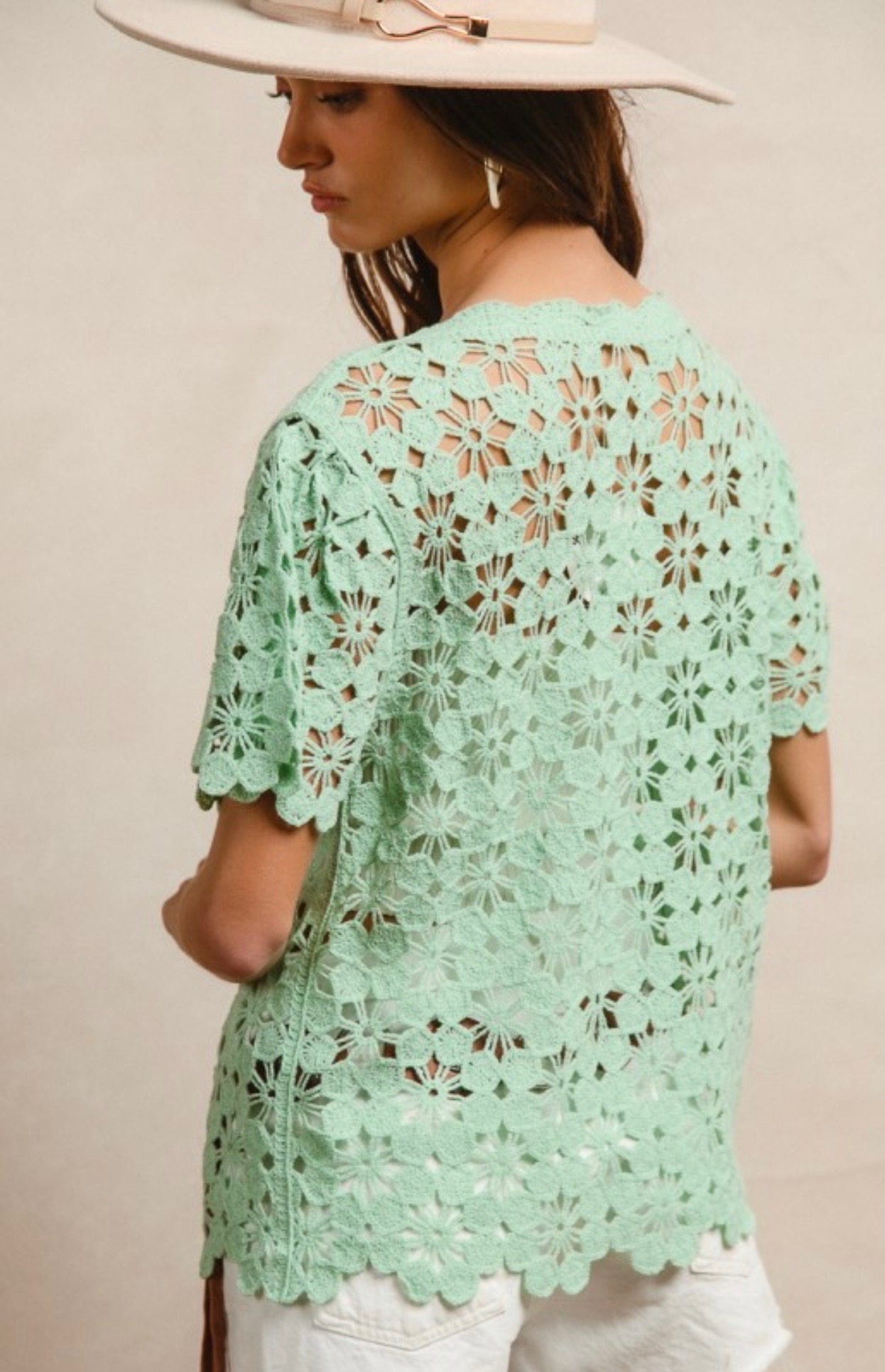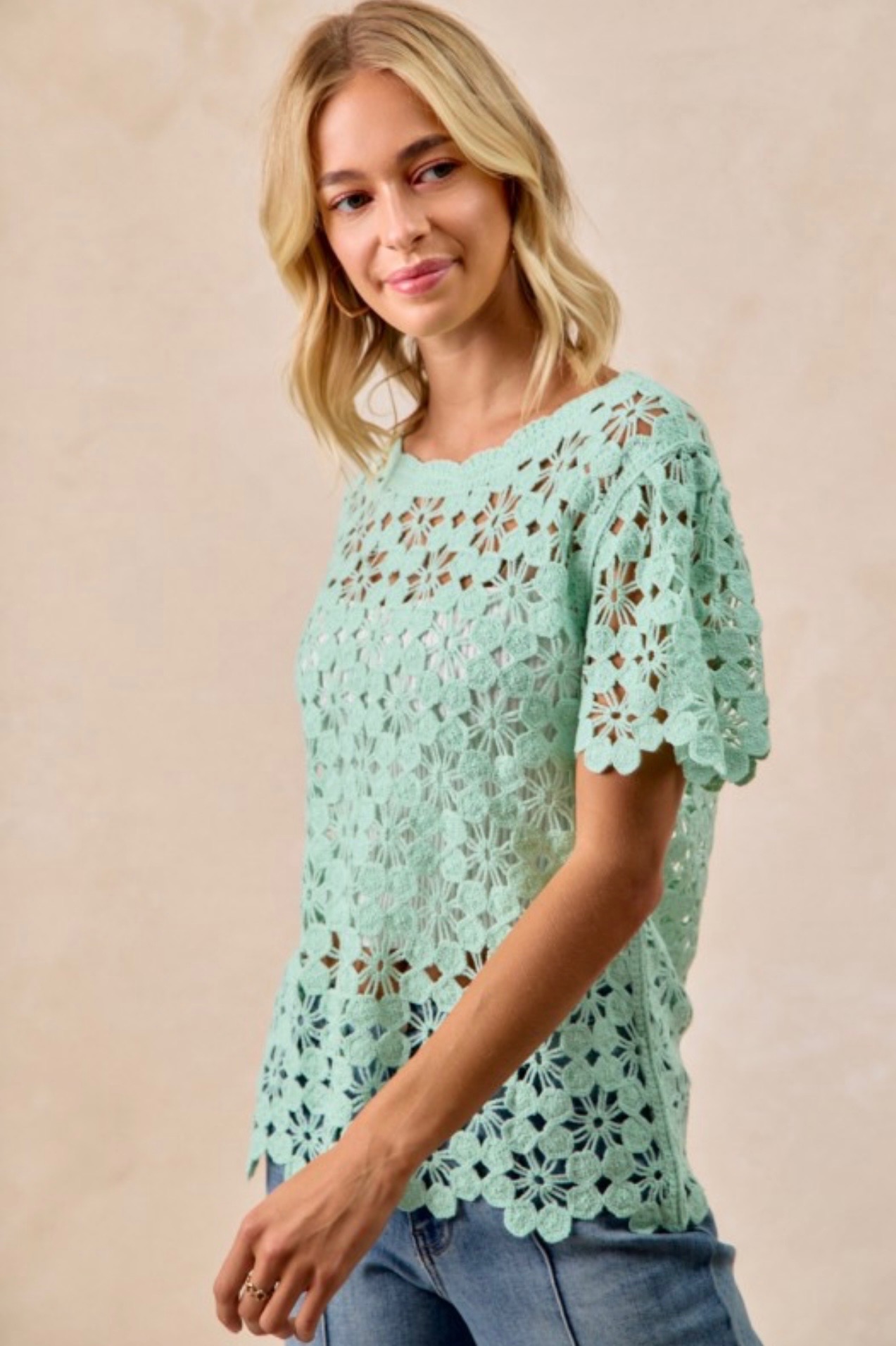 Fresh and charming, this mint green lace top features intricate floral detailing and a relaxed silhouette for an effortlessly breezy, feminine look. Available in small, medium, large, and Xlarge.