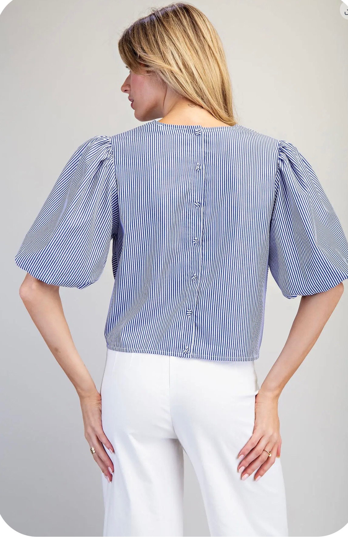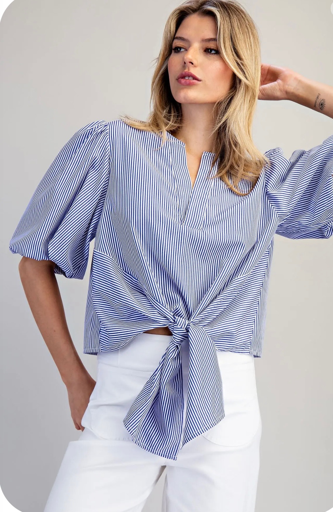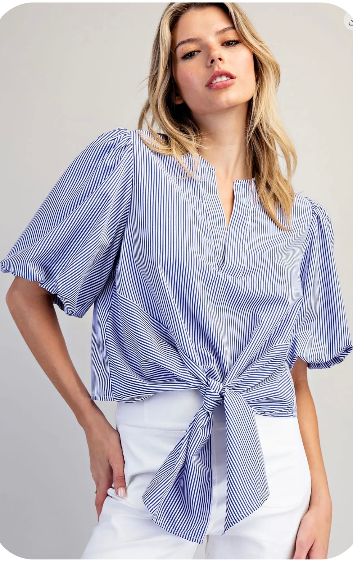 Blue and white pinstripe blouse featuring soft puff sleeves, a split neckline, and a flattering front tie detail for an effortlessly polished, feminine look. Comes in small, medium and large.