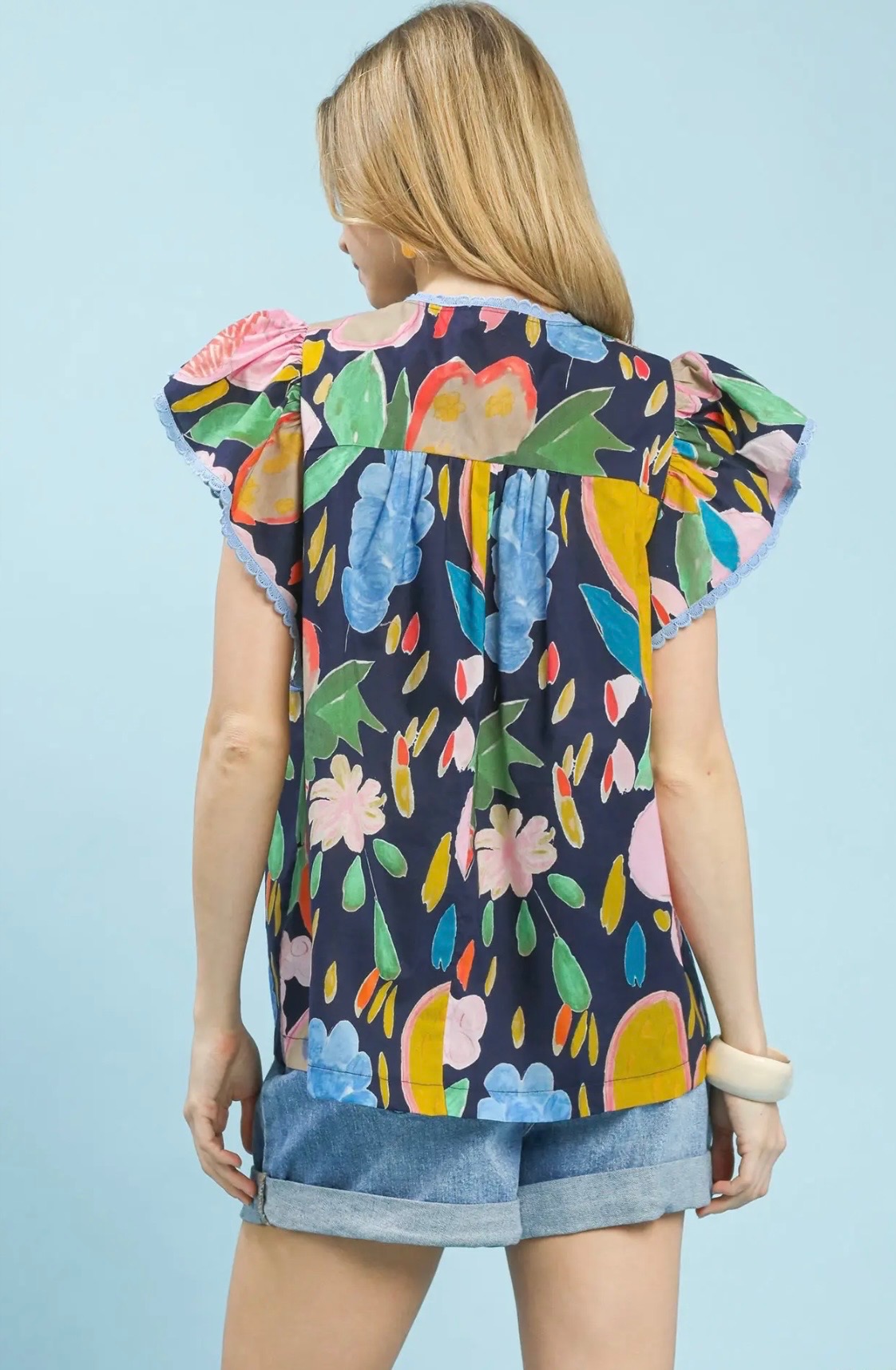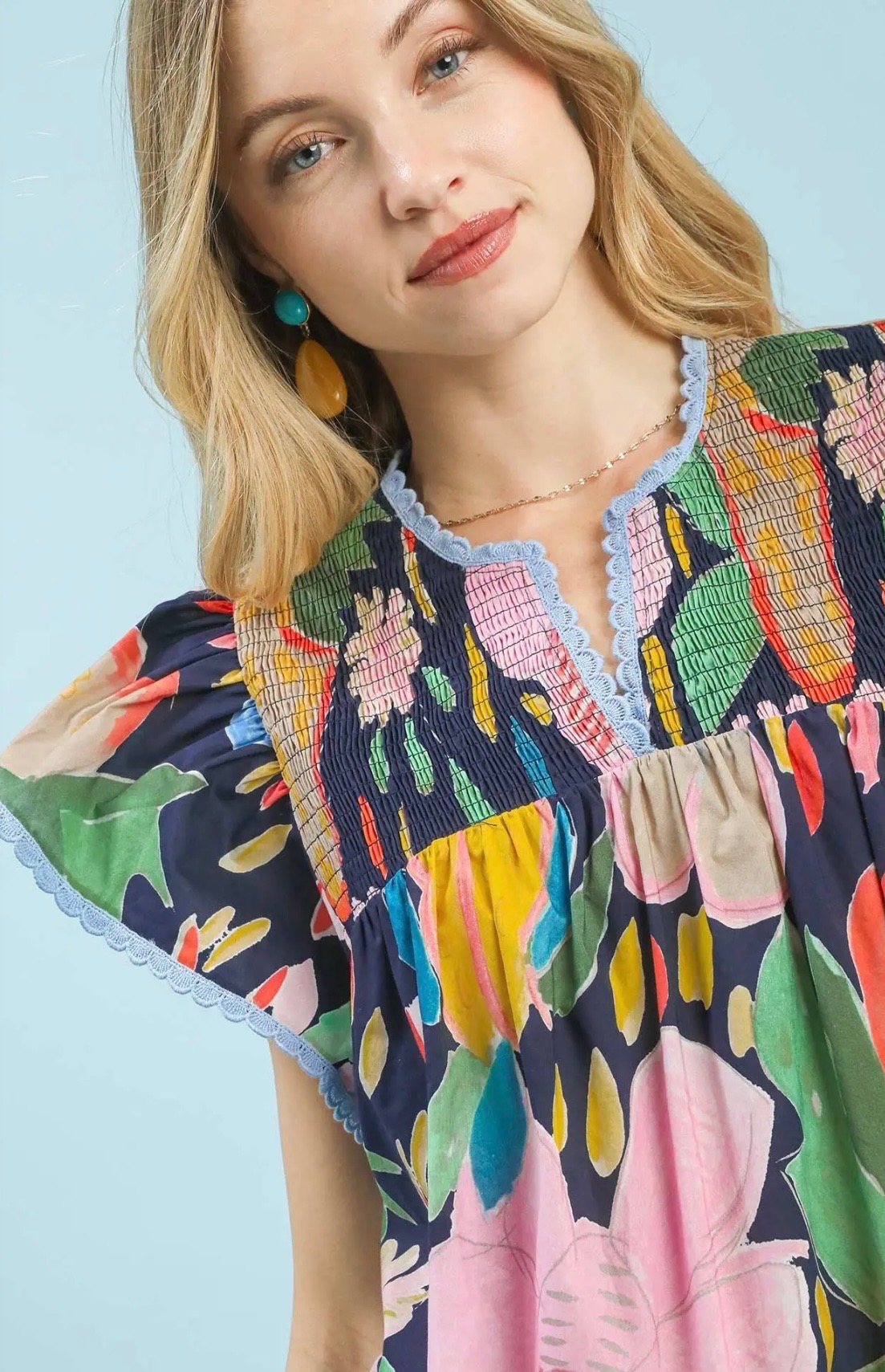 Colorful floral flutter-sleeve top featuring a navy background with vibrant abstract botanical print, smocked yoke details, and contrast scalloped along the neckline and sleeves for a playful, artistic look. Available in small, medium, and large.
