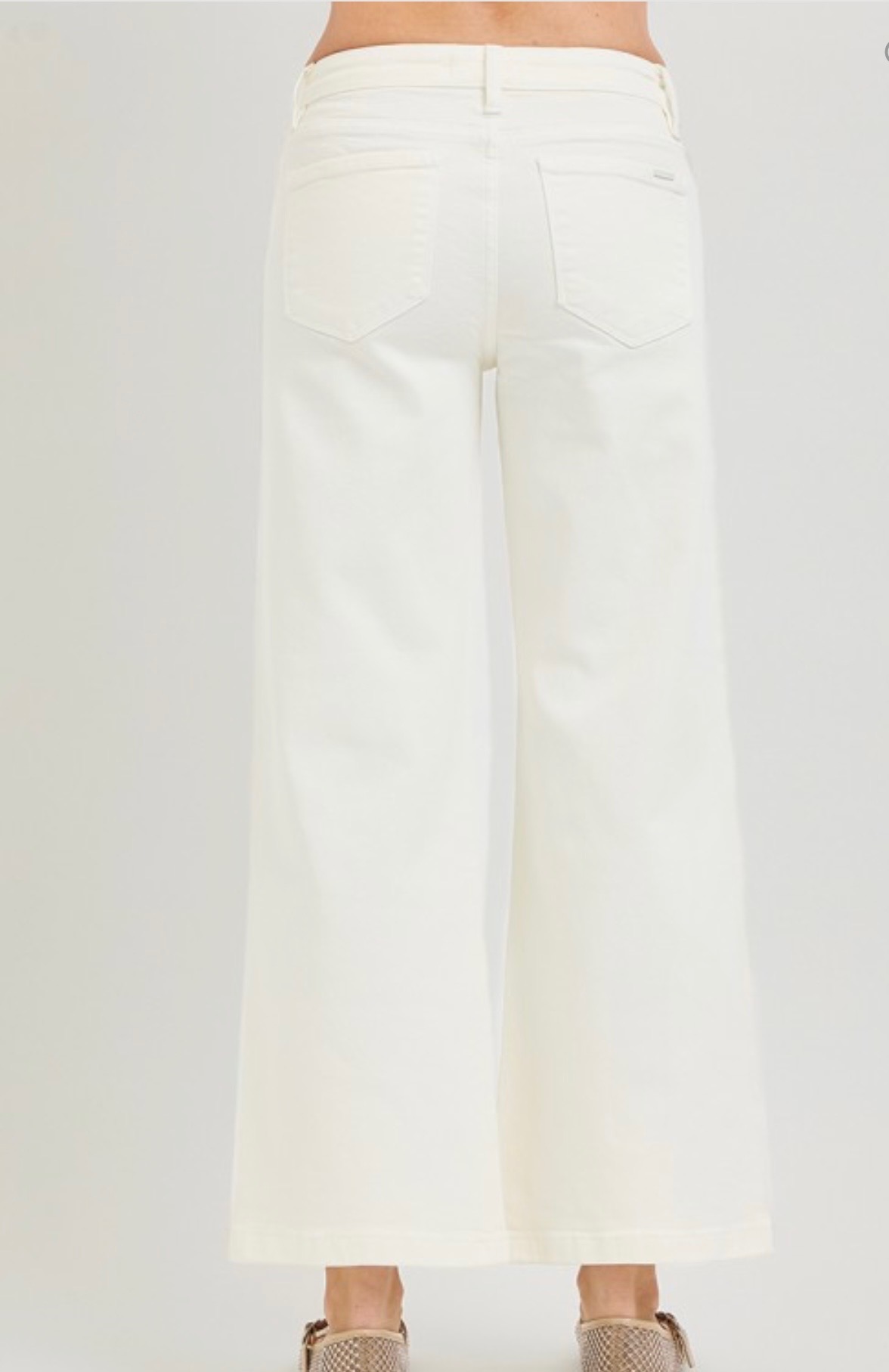 Cream wide-leg jeans with delicate floral and pearl appliques, featuring a high-rise waist, relaxed fit, and soft feminine detail for an elegant casual look. Available in sizes 3-15.