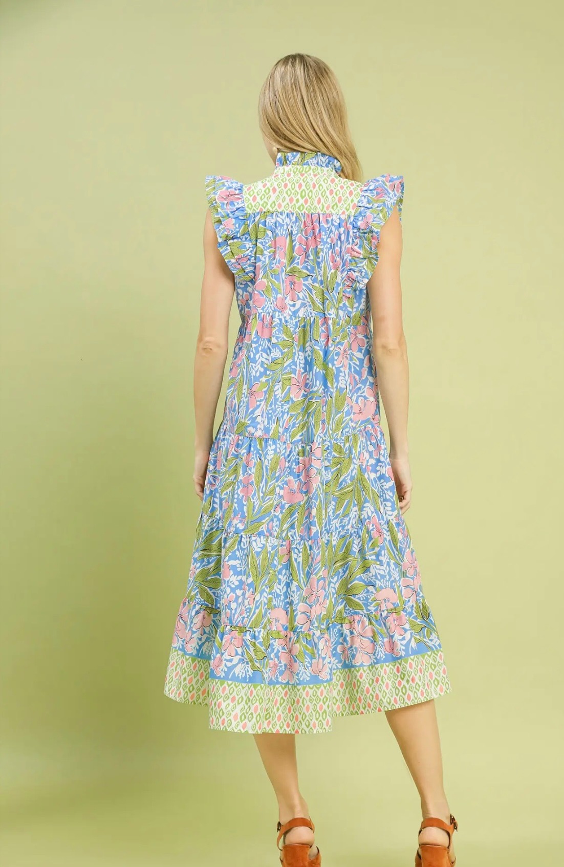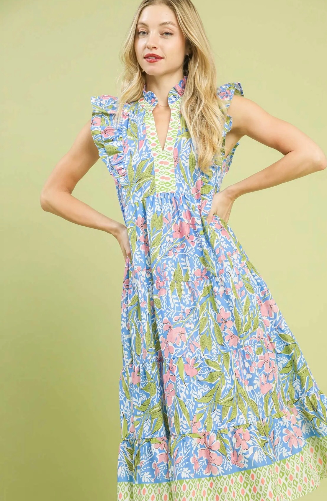 A breezy sleeveless midi dress featuring a soft blue floral print, ruffled shoulders, a flattering V-neckline, and a tiered skirt with a contrasting patterned hem for a fresh, feminine look. Available in small, medium, and large.