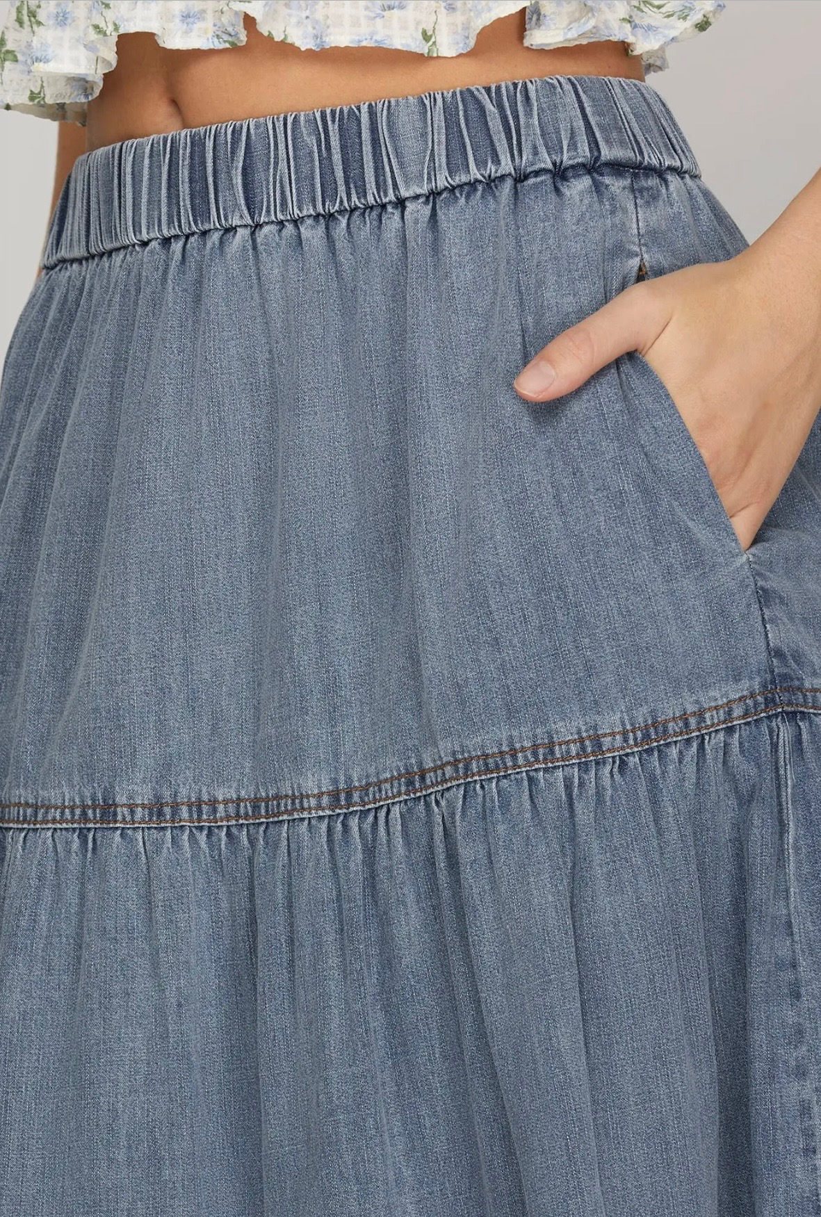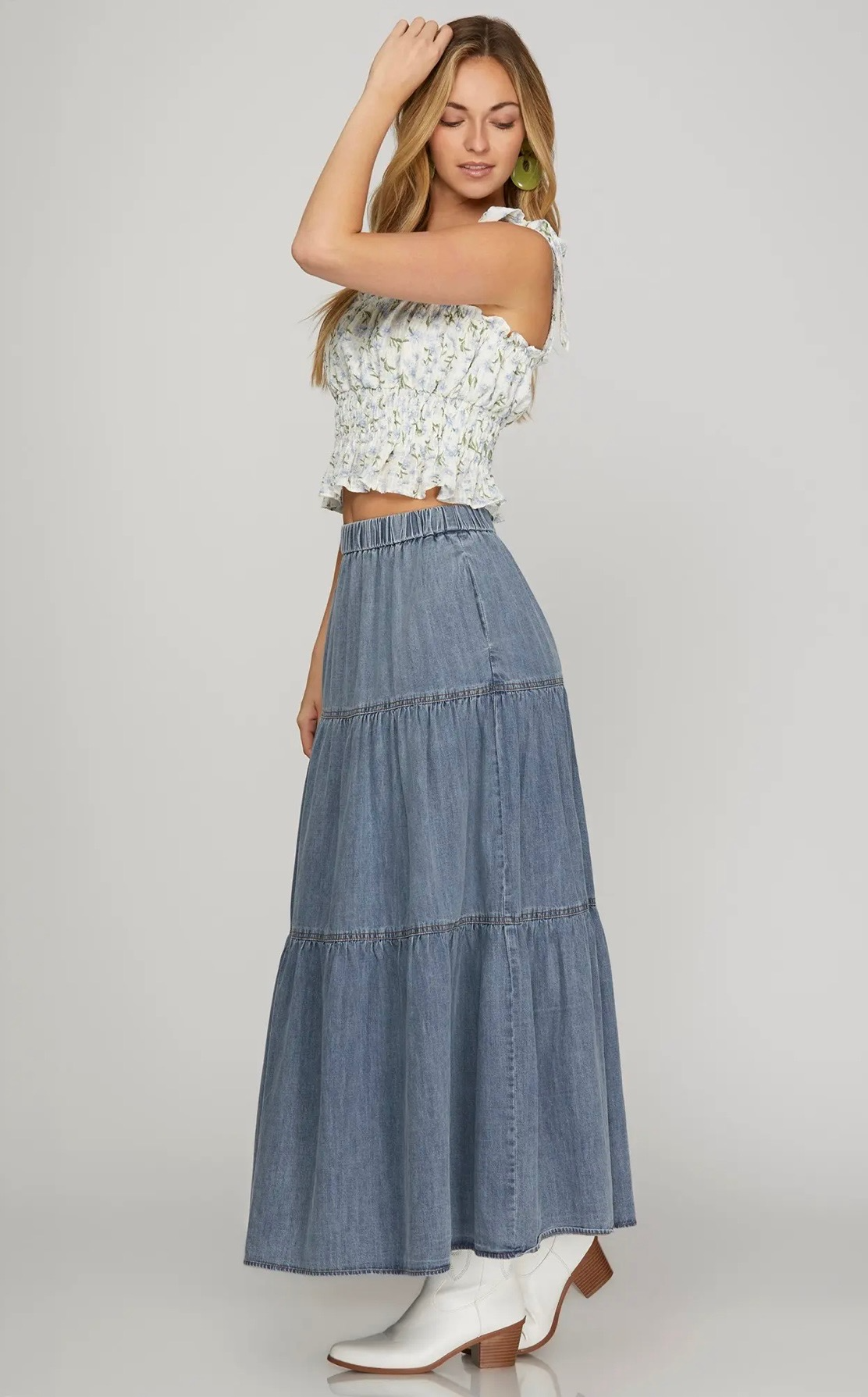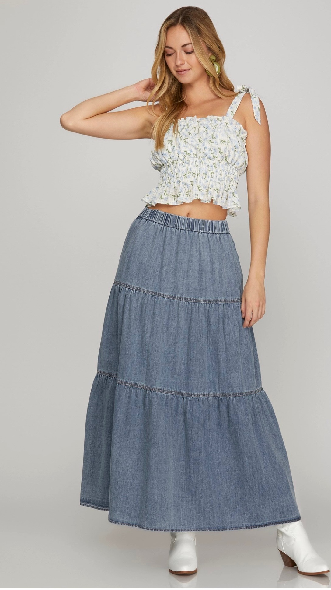 Light blue tiered maxi skirt crafted from a denim-style fabric, featuring an elastic waistband and a flowy, relaxed silhouette for a casual and effortless look. Comes in small, medium, and large.