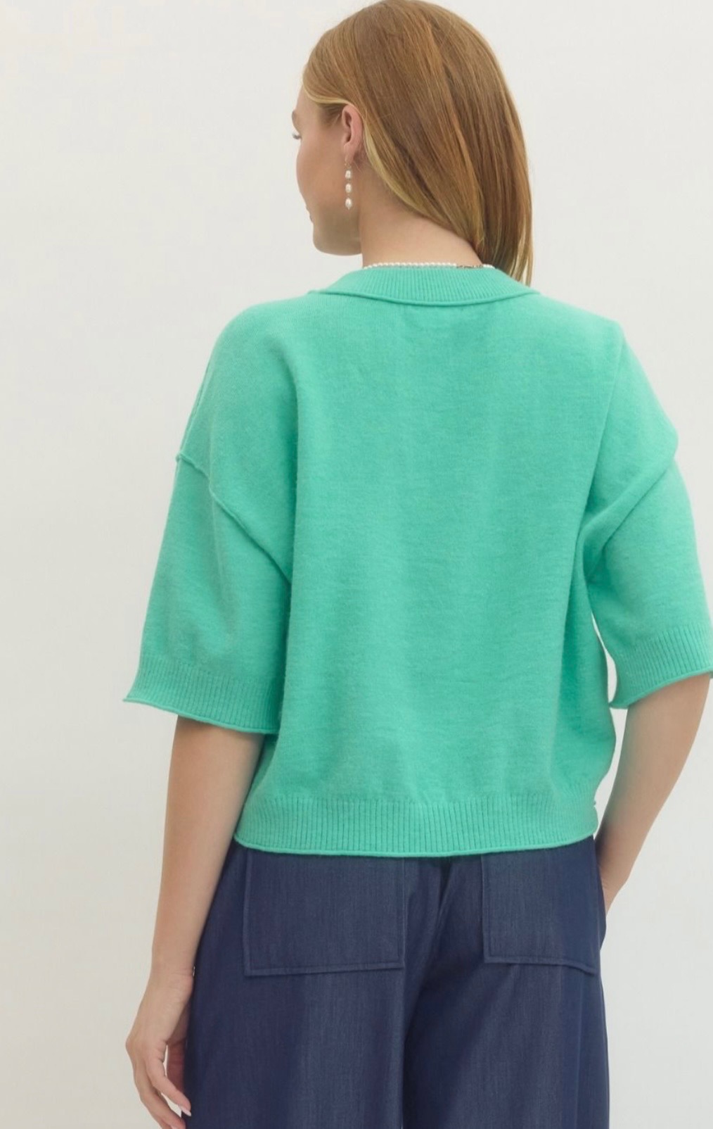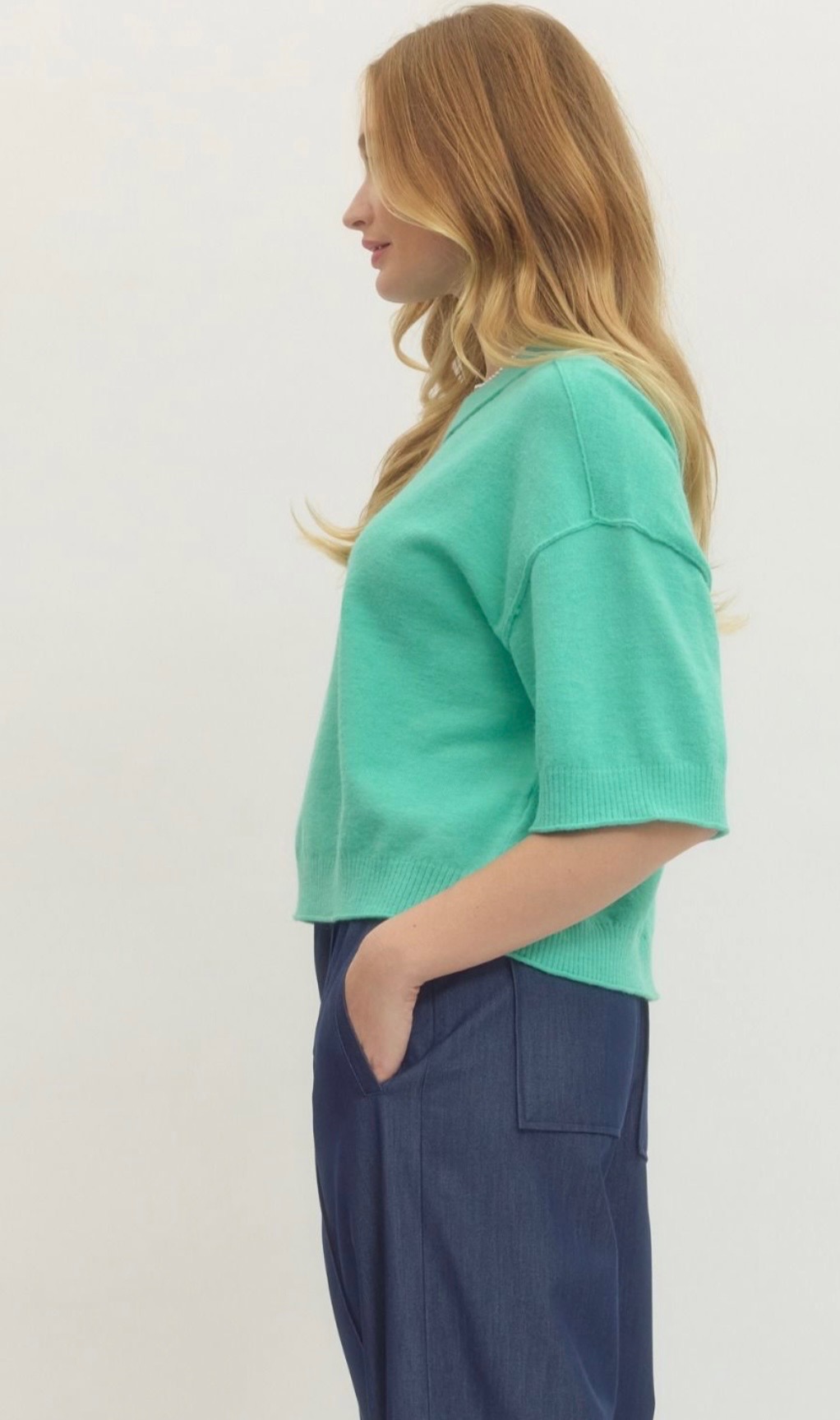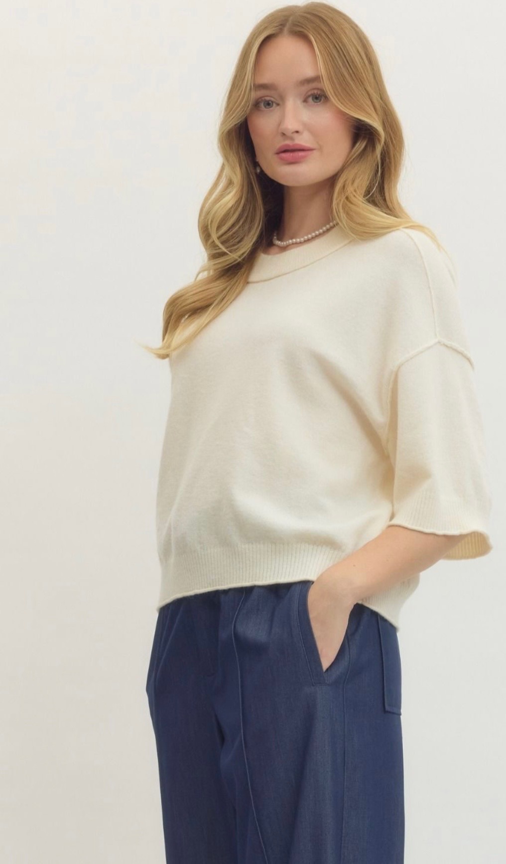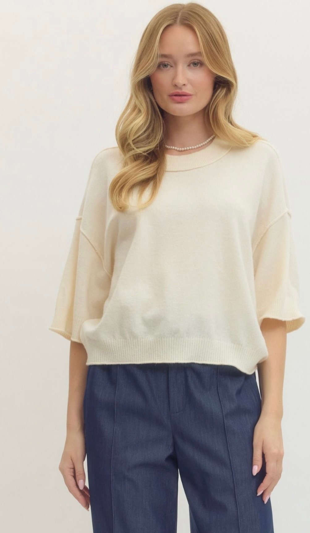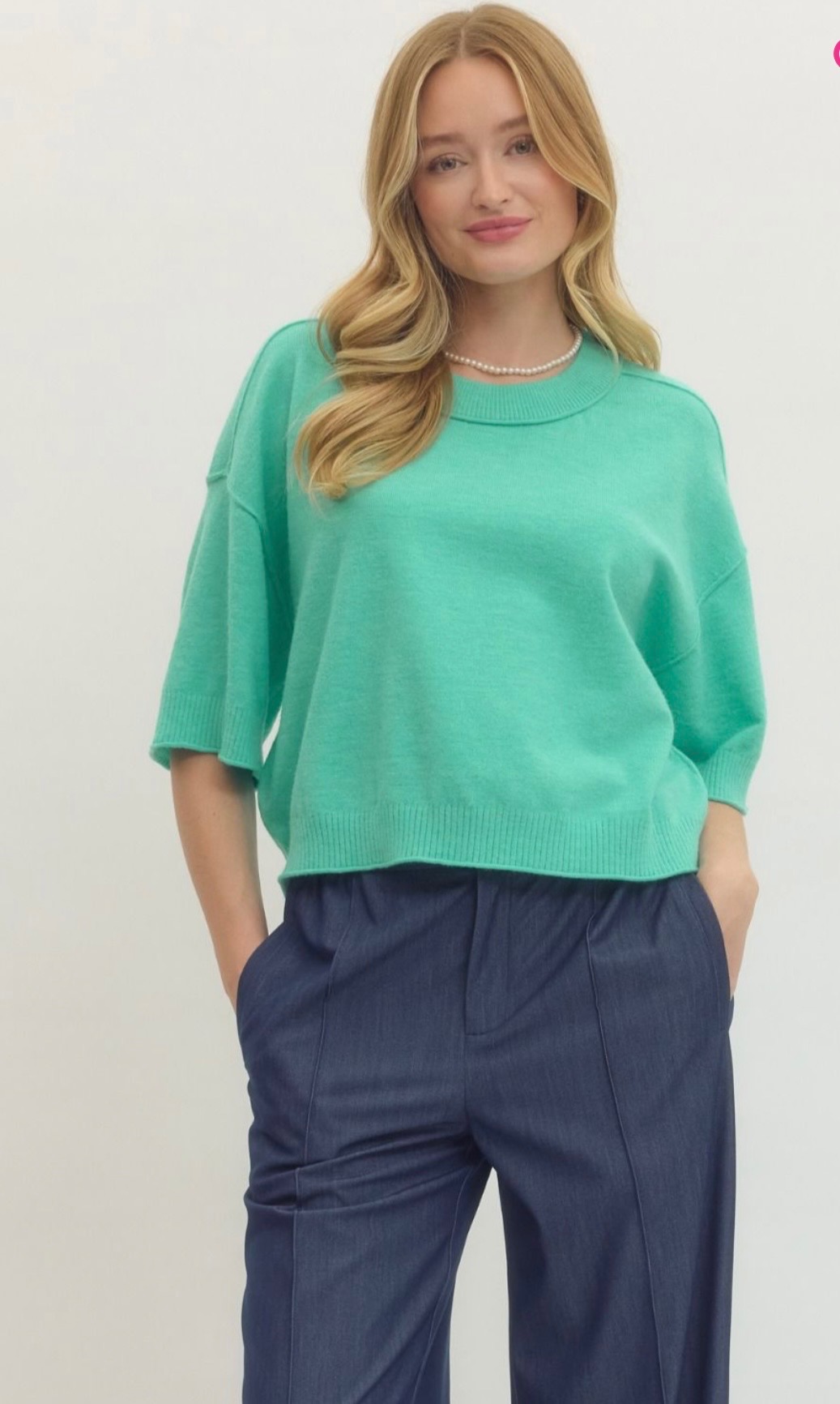 This sweater is available in turquoise or cream. It has a relaxed boxy silhouette, featuring a classic crew neckline, elbow-length sleeves, and ribbed trim for an easy, modern look. Available in small, medium, and large.