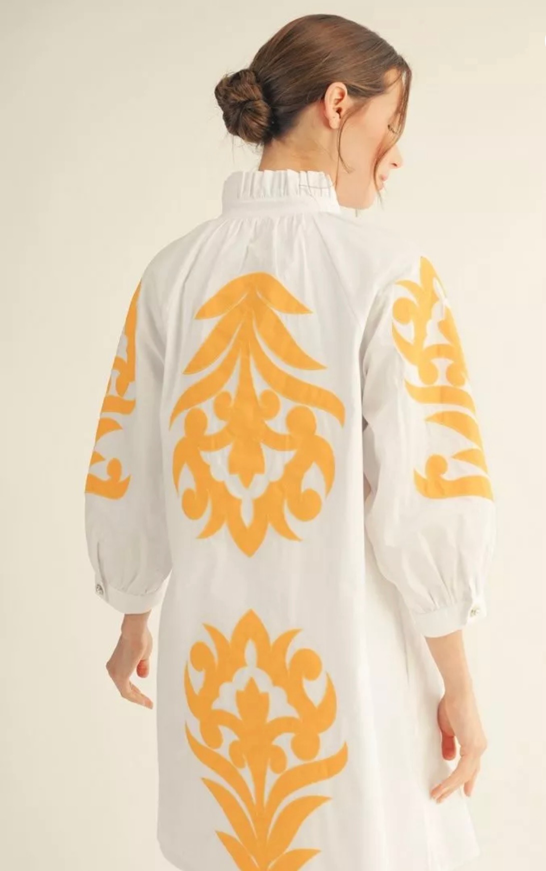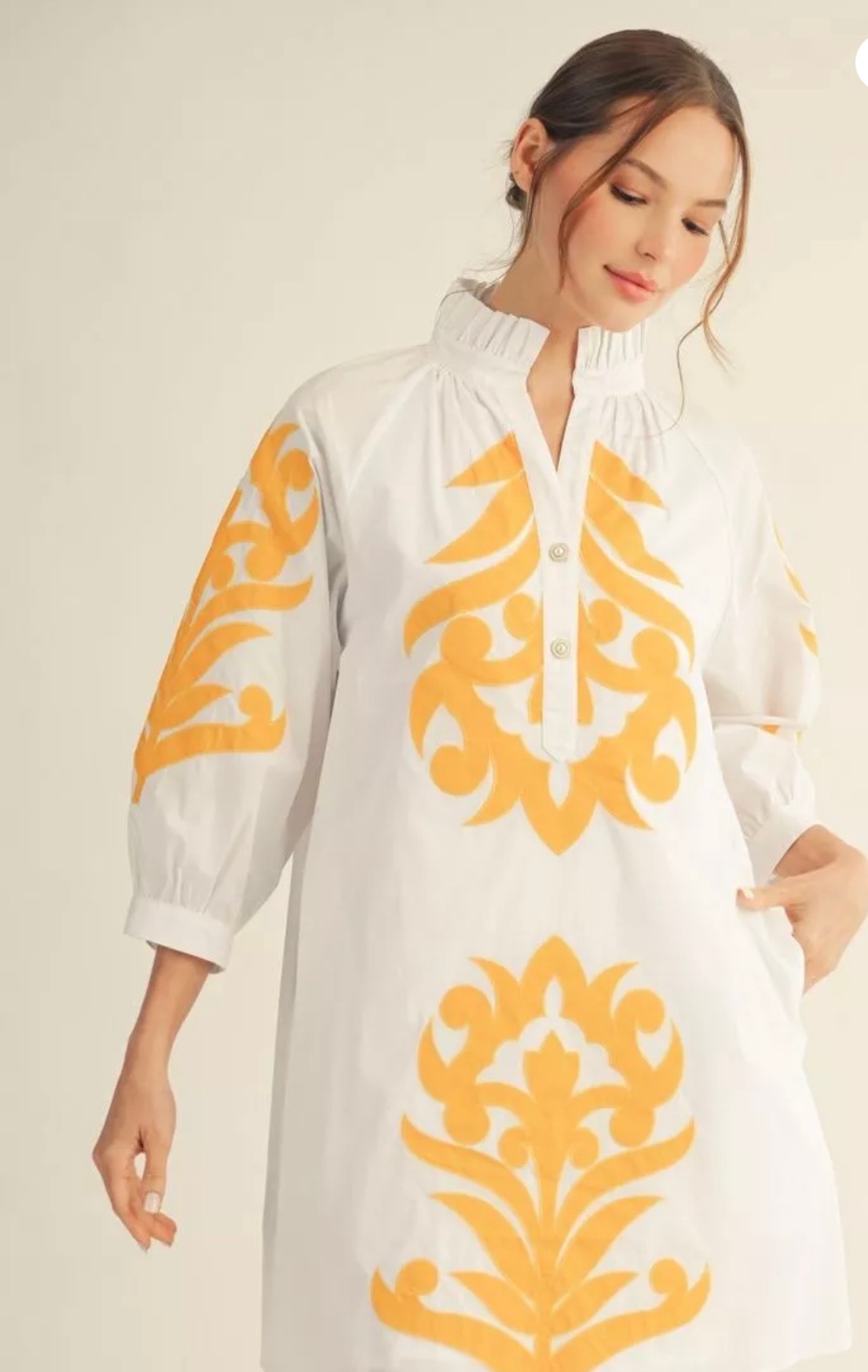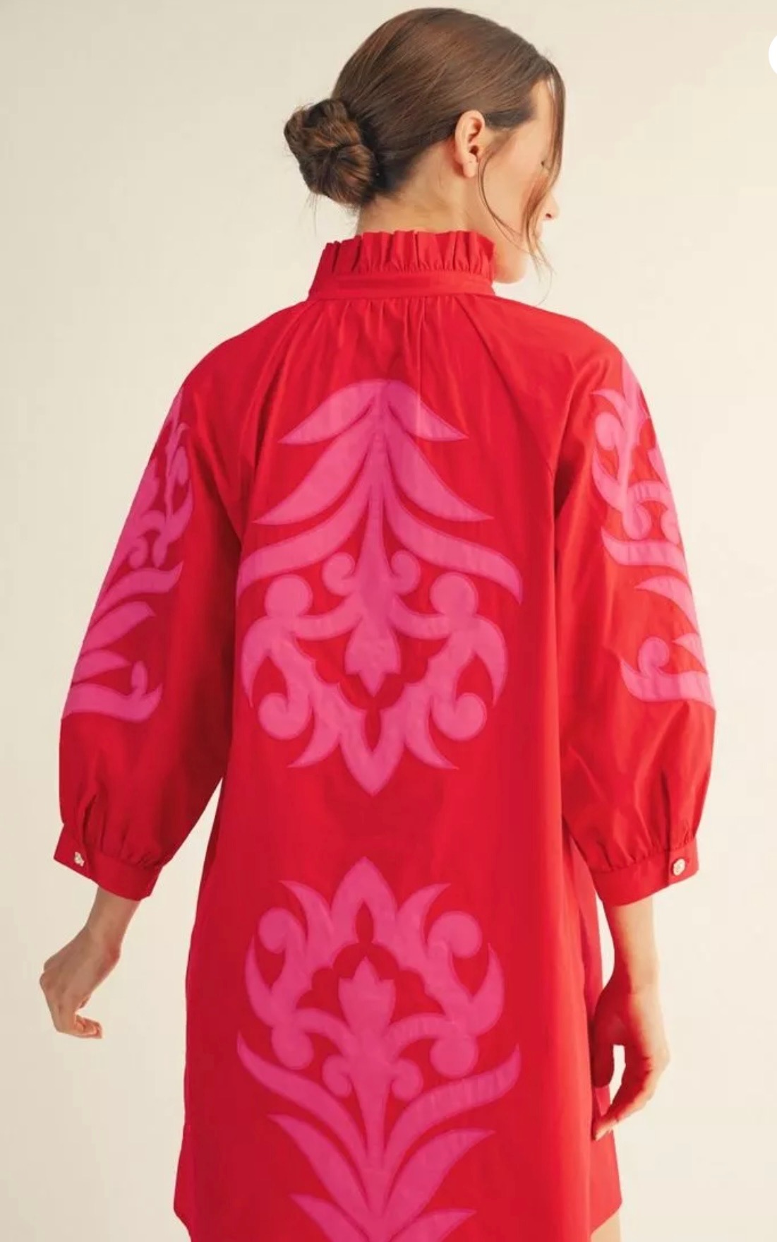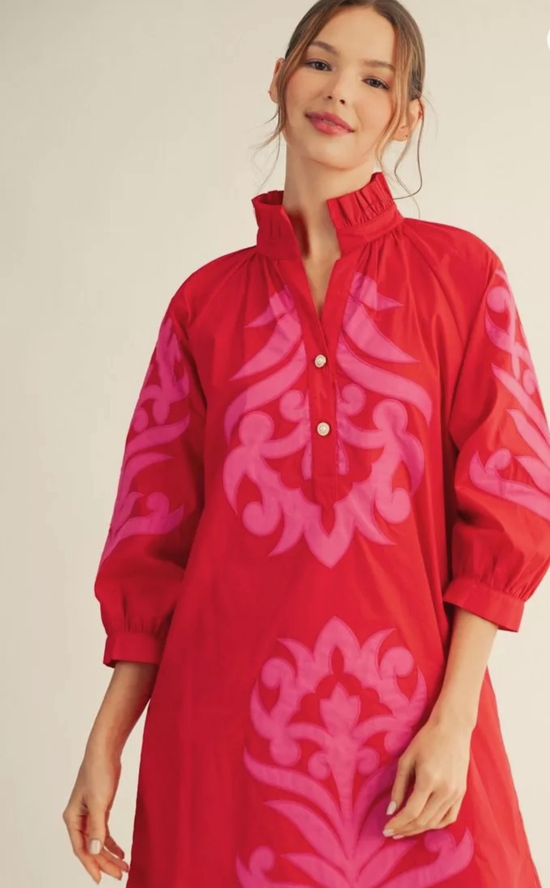 This tunic dress is available in red or white, it features a relaxed silhouette, a soft stand collar with a split neckline, three-quarter sleeves. The white dress features a golden-yellow design, while the red dress has a pink design. Available in small, medium, and large.