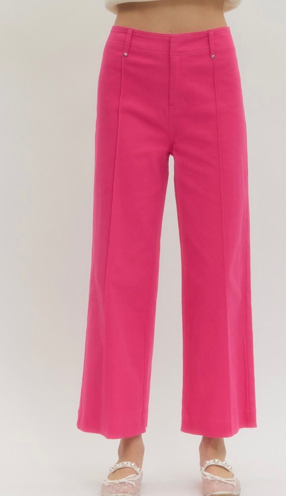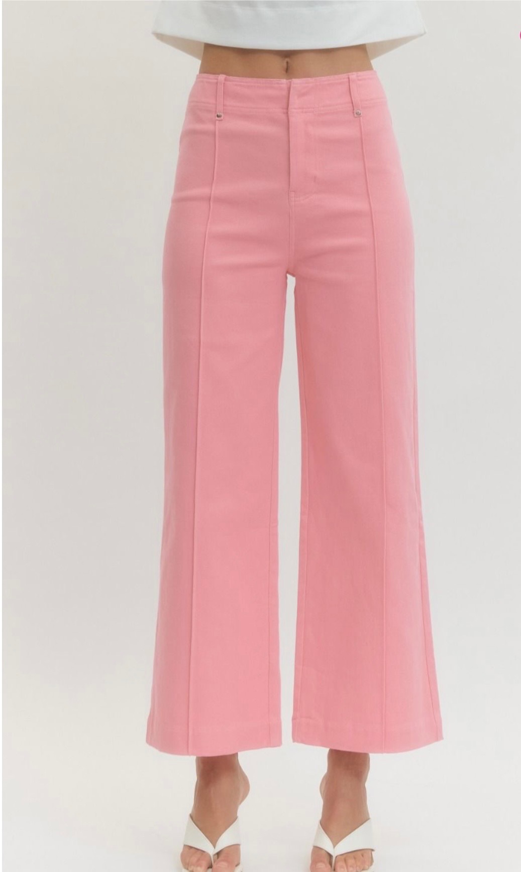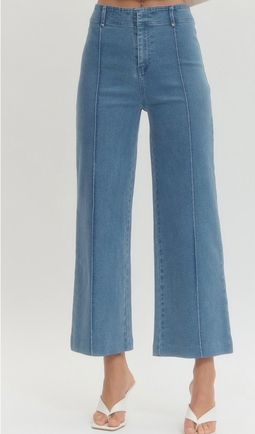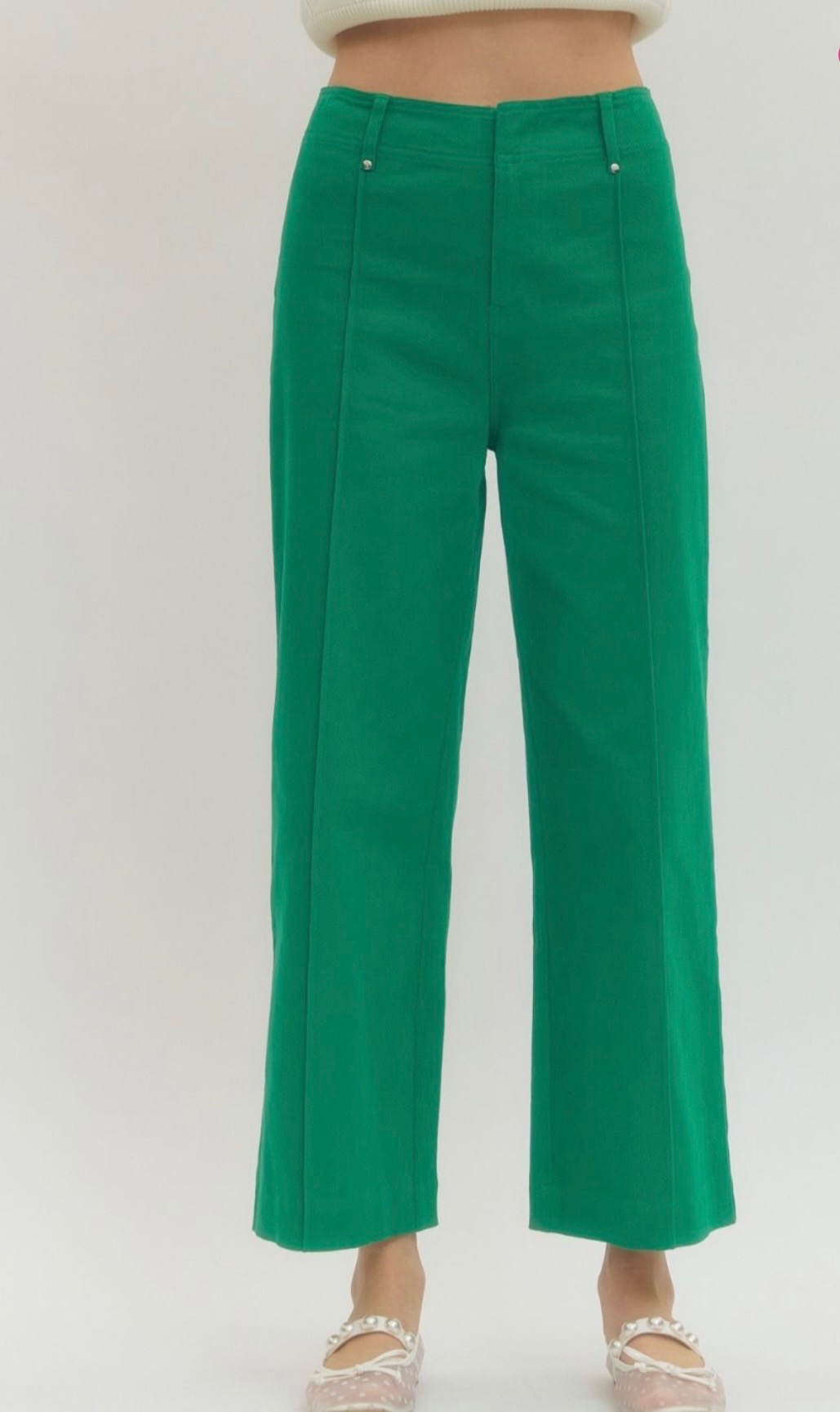 This awesome cropped jean comes in blue denim, green, pink, and hot pink, and features a slim straight leg silhouette with subtle front seam detailing for a clean, elongating look. Comes in small, medium, and large.