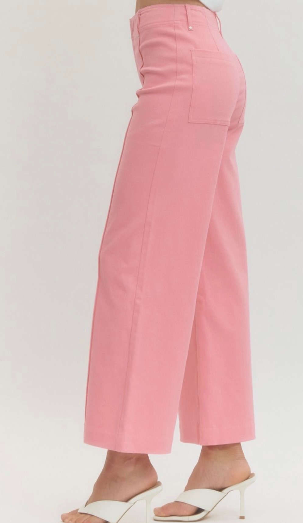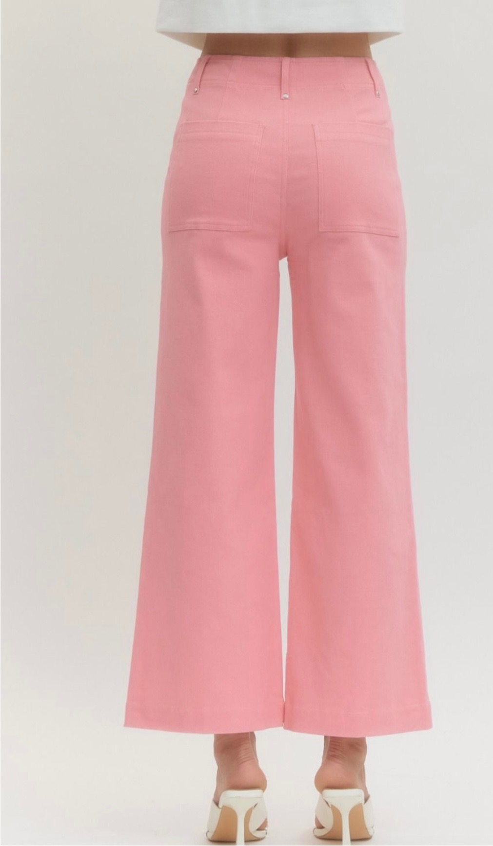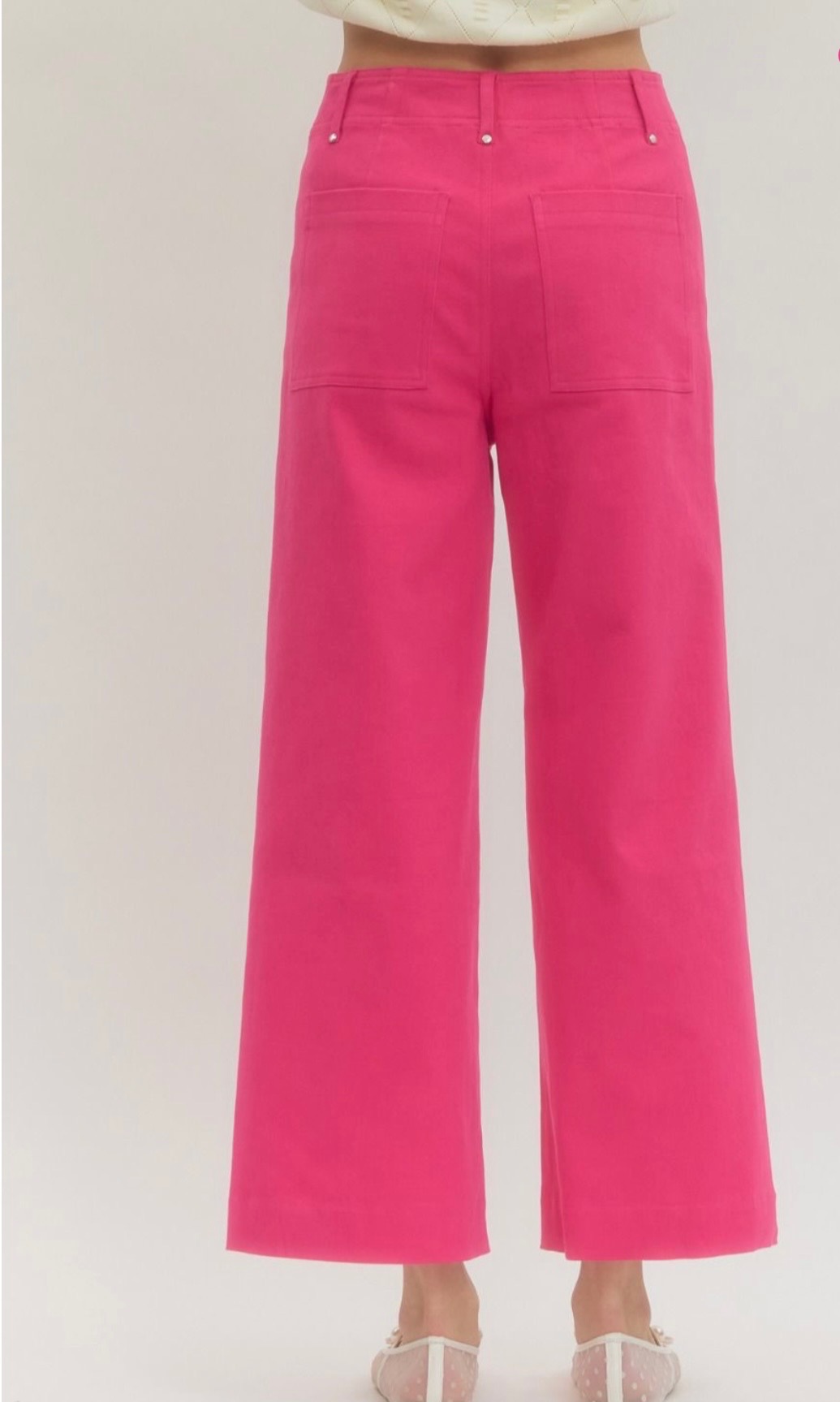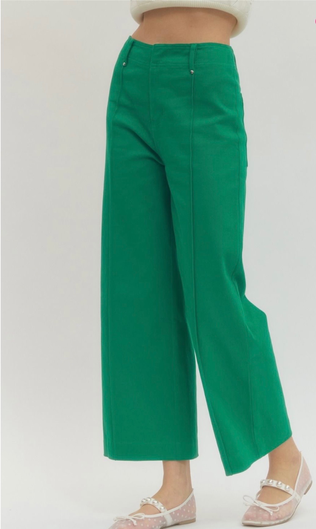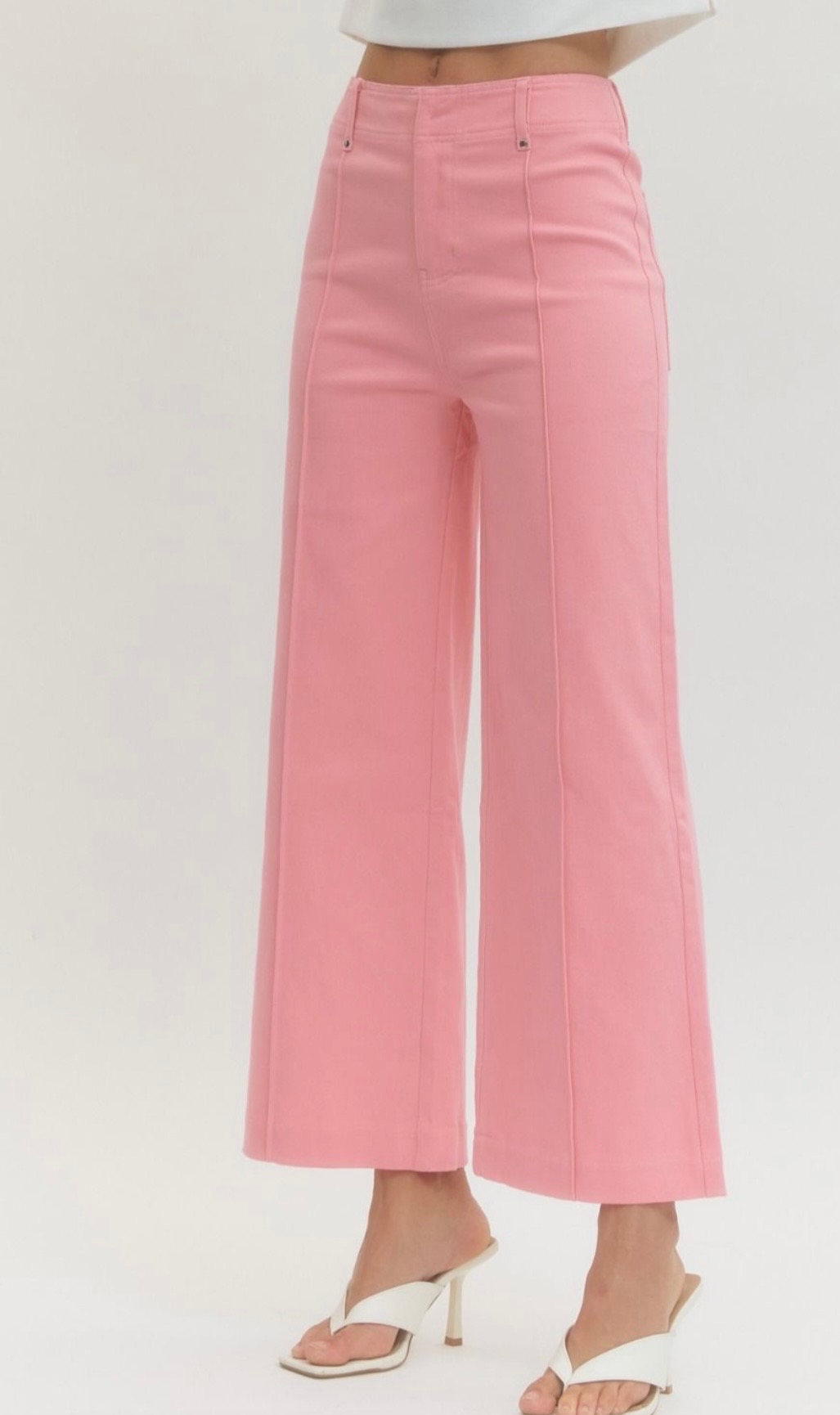 This awesome cropped jean comes in blue denim, green, pink, and hot pink, and features a slim straight leg silhouette with subtle front seam detailing for a clean, elongating look. Comes in small, medium, and large.