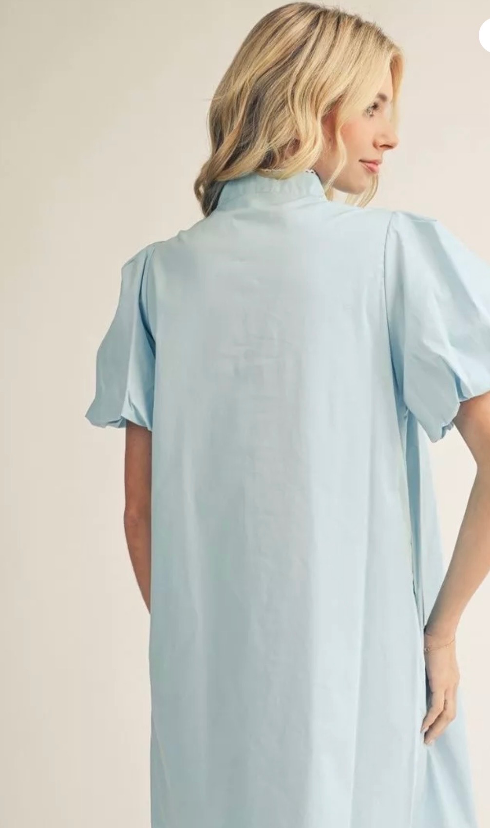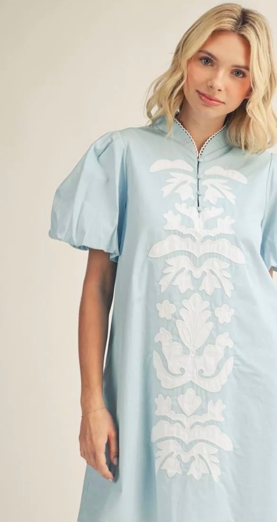 Soft and feminine, this light blue shift dress features puff sleeves and a delicate white embroidered front panel. The high neckline and relaxed silhouette create an effortlessly polished look perfect for spring and summer occasions. Available in small, medium, and large.