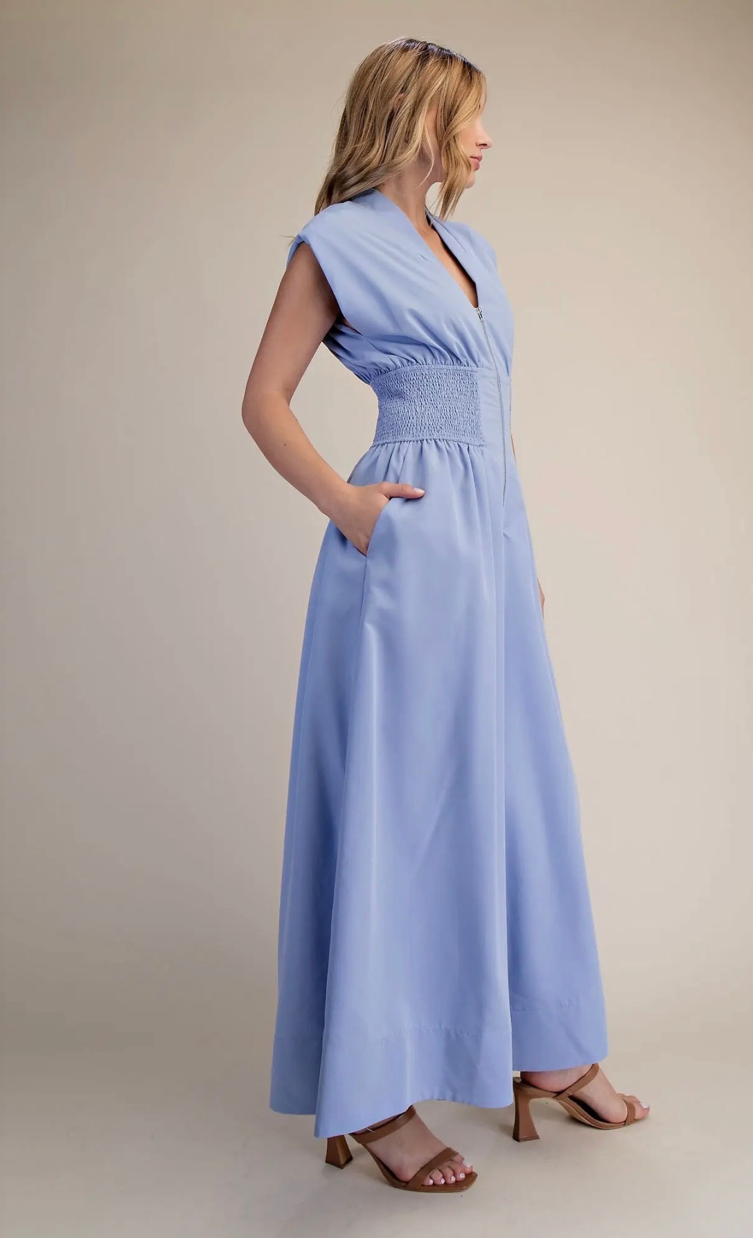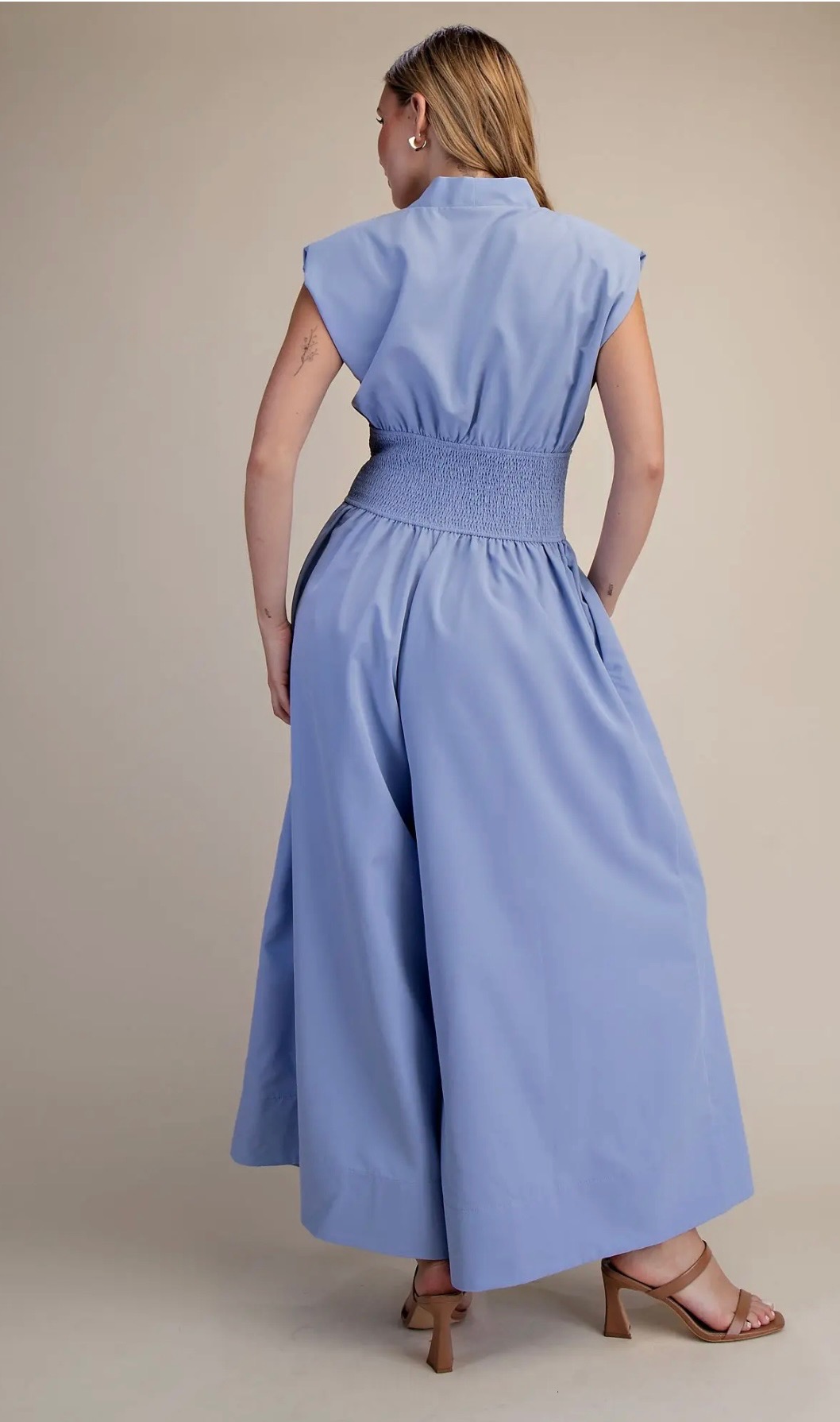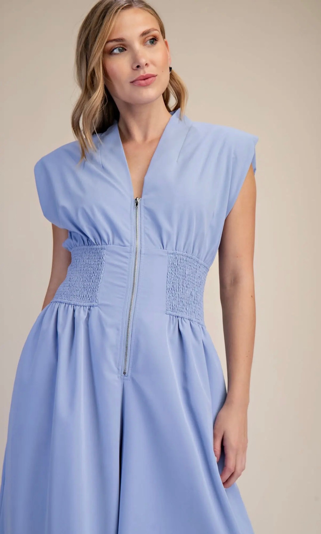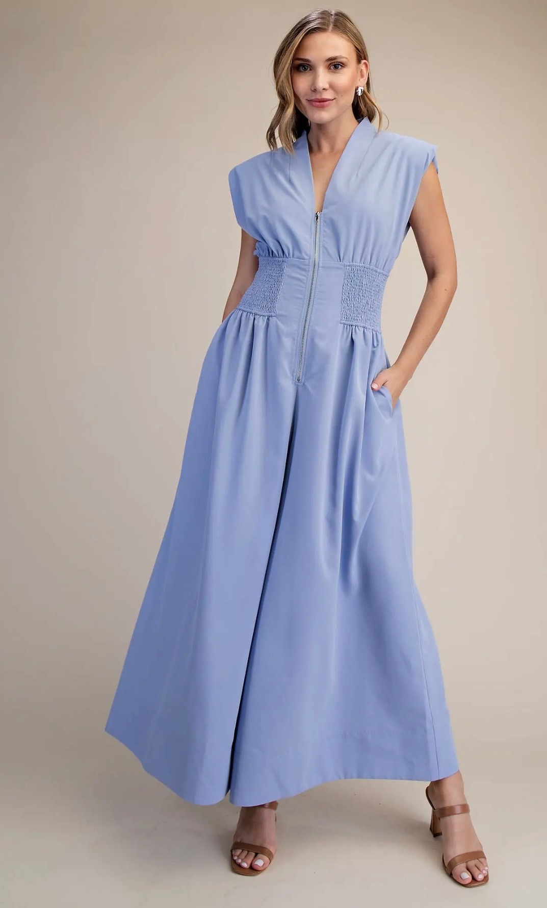 Light blue sleeveless jumper with a modern zip-front bodice, smocked waist for a flattering fit, flowing pants with side pockets for effortless, everyday elegance. Comes in small, medium, and large.