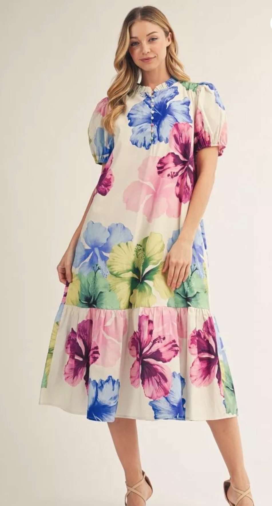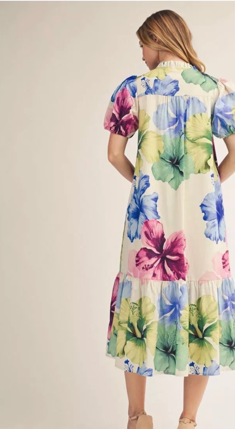 A light, airy midi dress featuring a vibrant oversized floral print, soft puff sleeves, a buttoned neckline, and a relaxed tiered skirt for an easy, feminine silhouette. Available in small, medium, and large.